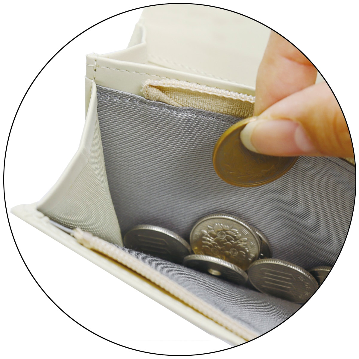 すっきりスマートに、これひとつ。コンパクトサイズで、必要なものだけをしっかりキープ。カード3枚、小銭、お札も折らずに入ります。ーPOINTー縦約9cm×横約17.7cmと片手で持ちやすいサイズ感で、旅行やおでかけにもぴったり。ーデザインー美しい型押しを内側にも施し、華やかさをプラス。コンパクトながらお札を折らずに収納できます。