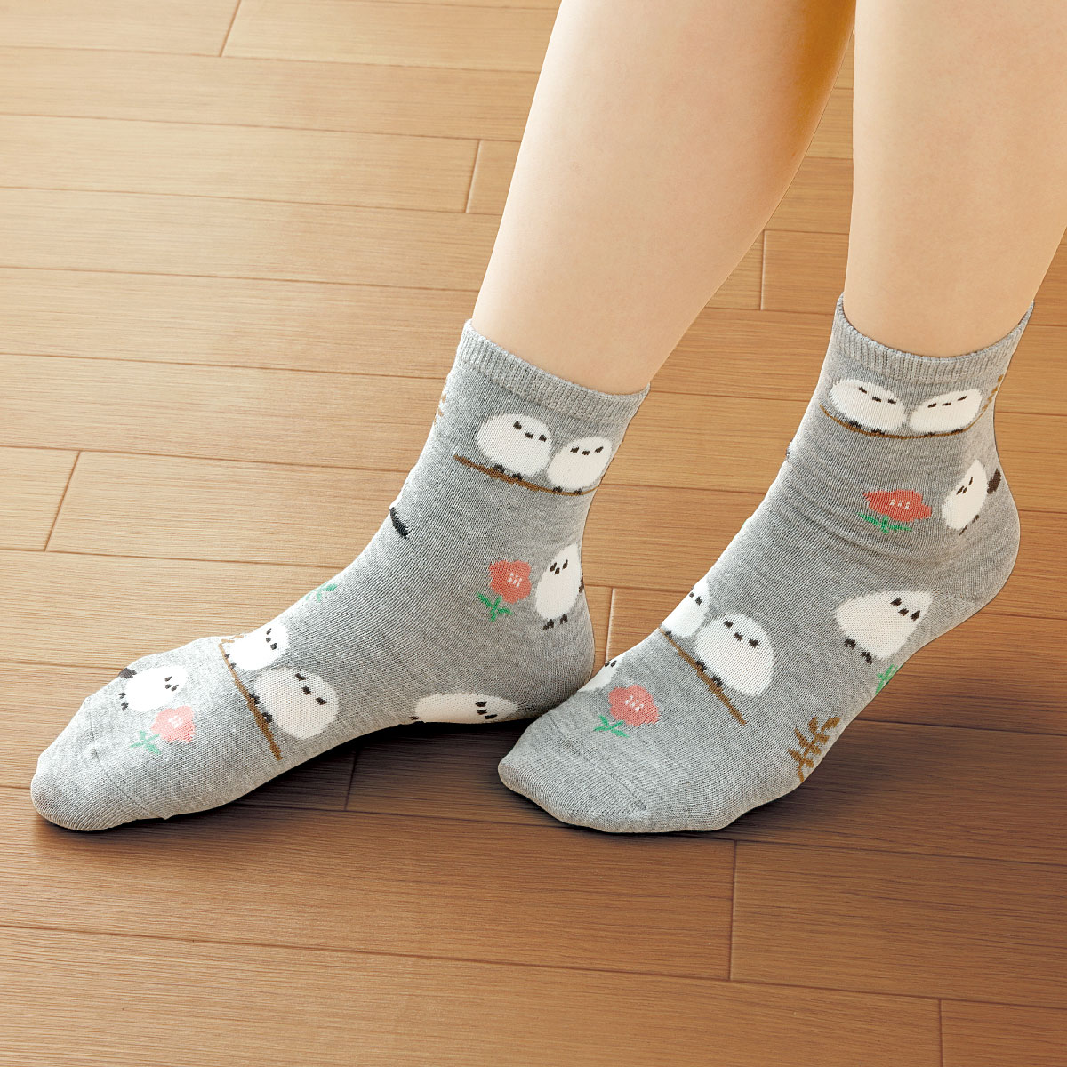 きょとんとした表情が愛らしい人気のシマエナガ柄靴下。はき心地やわらか。