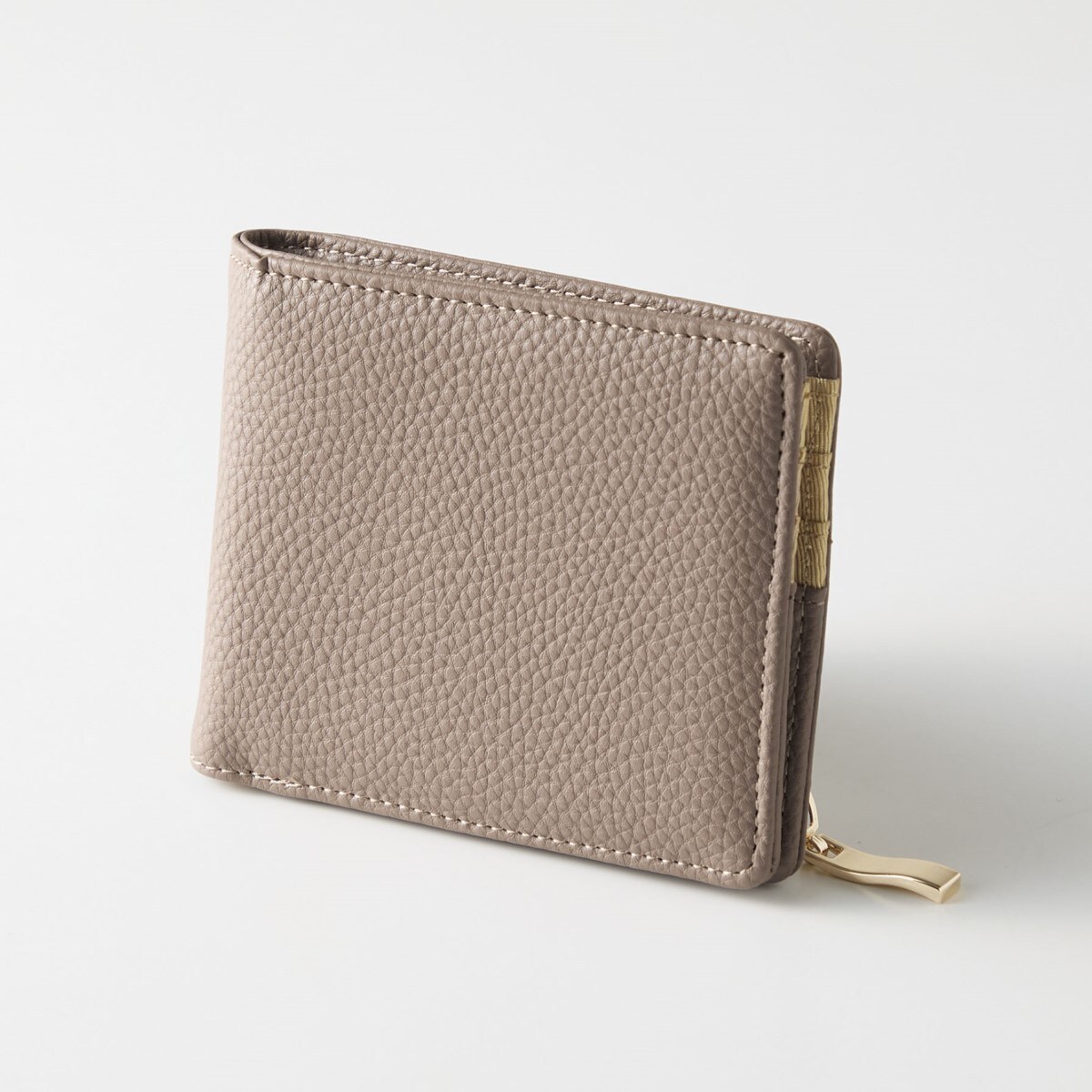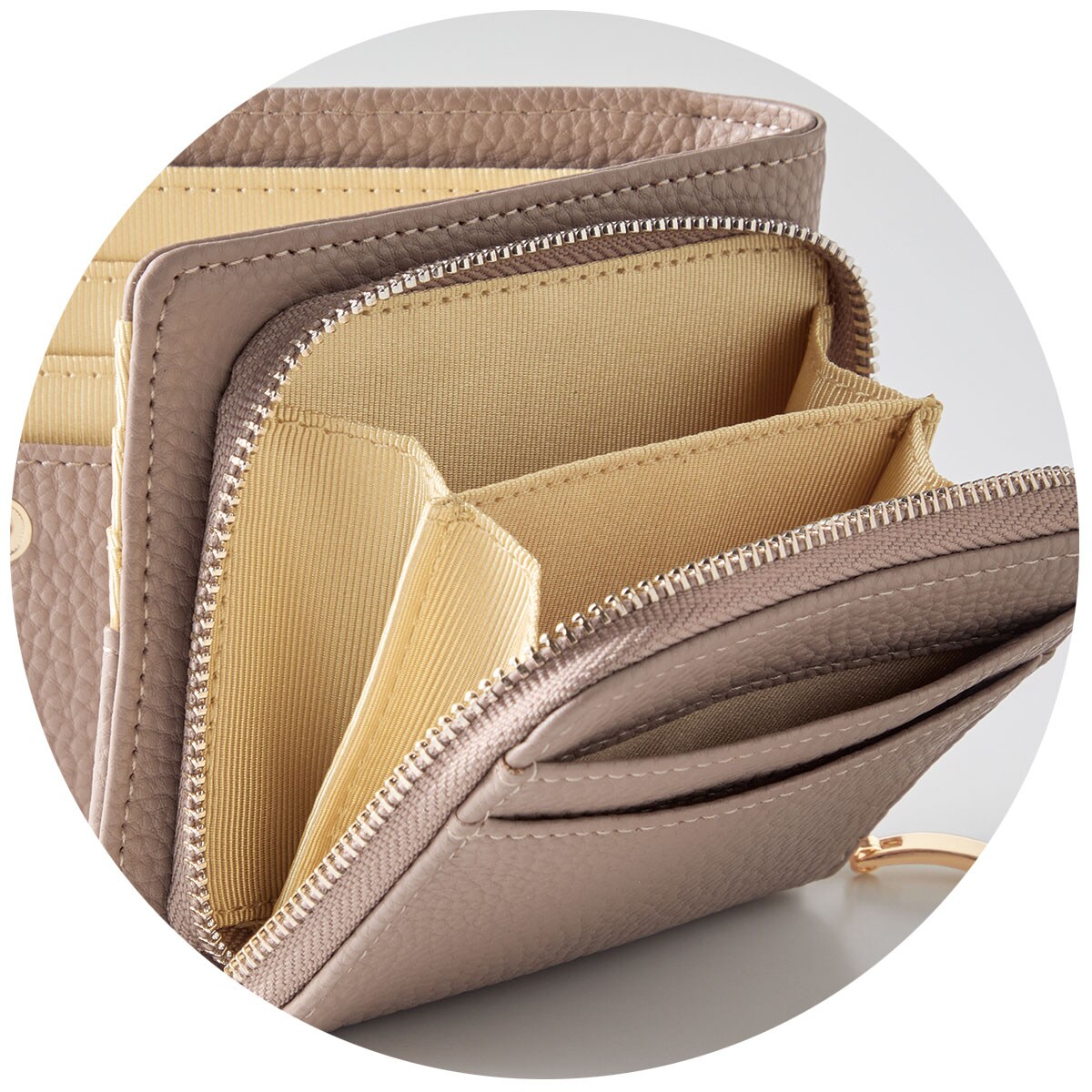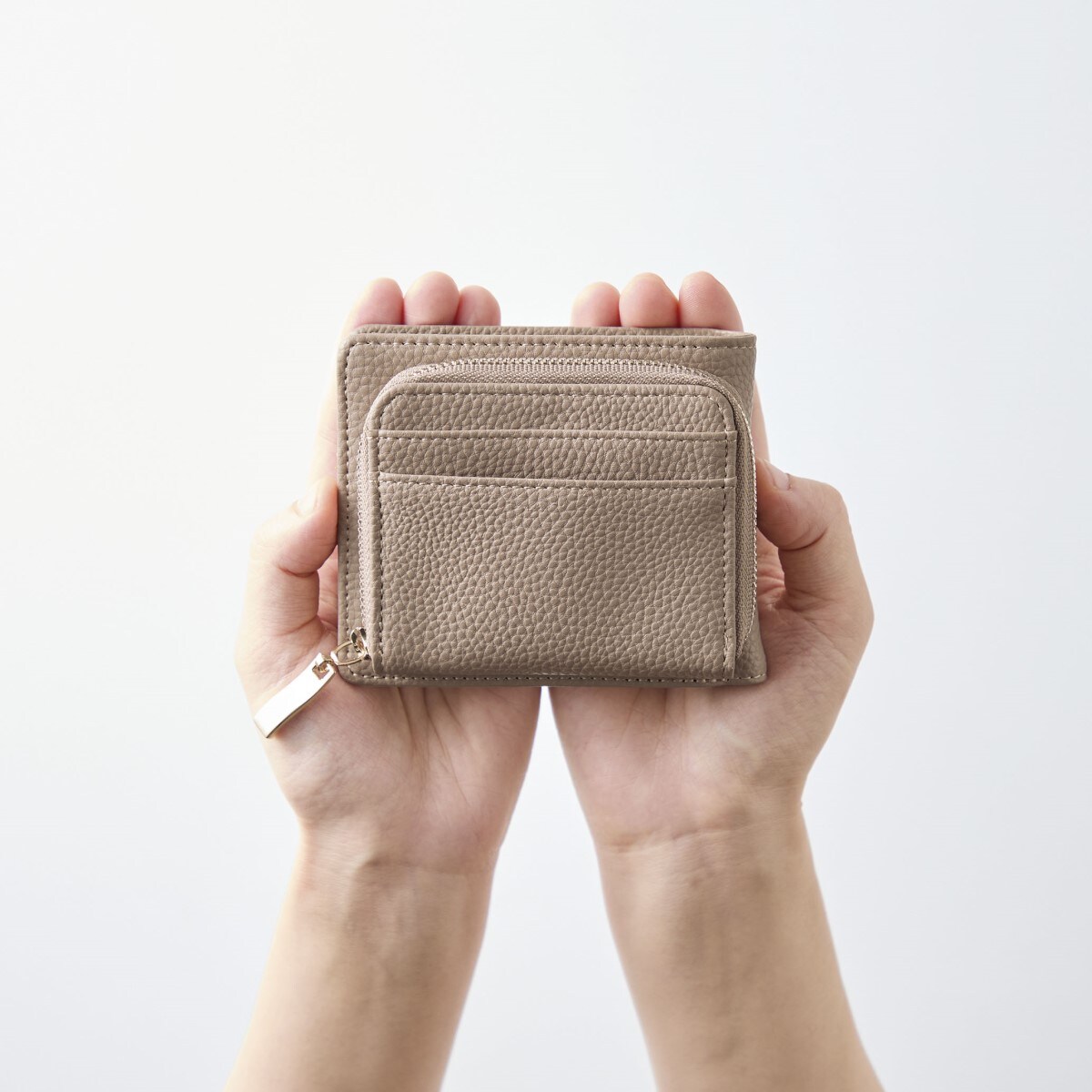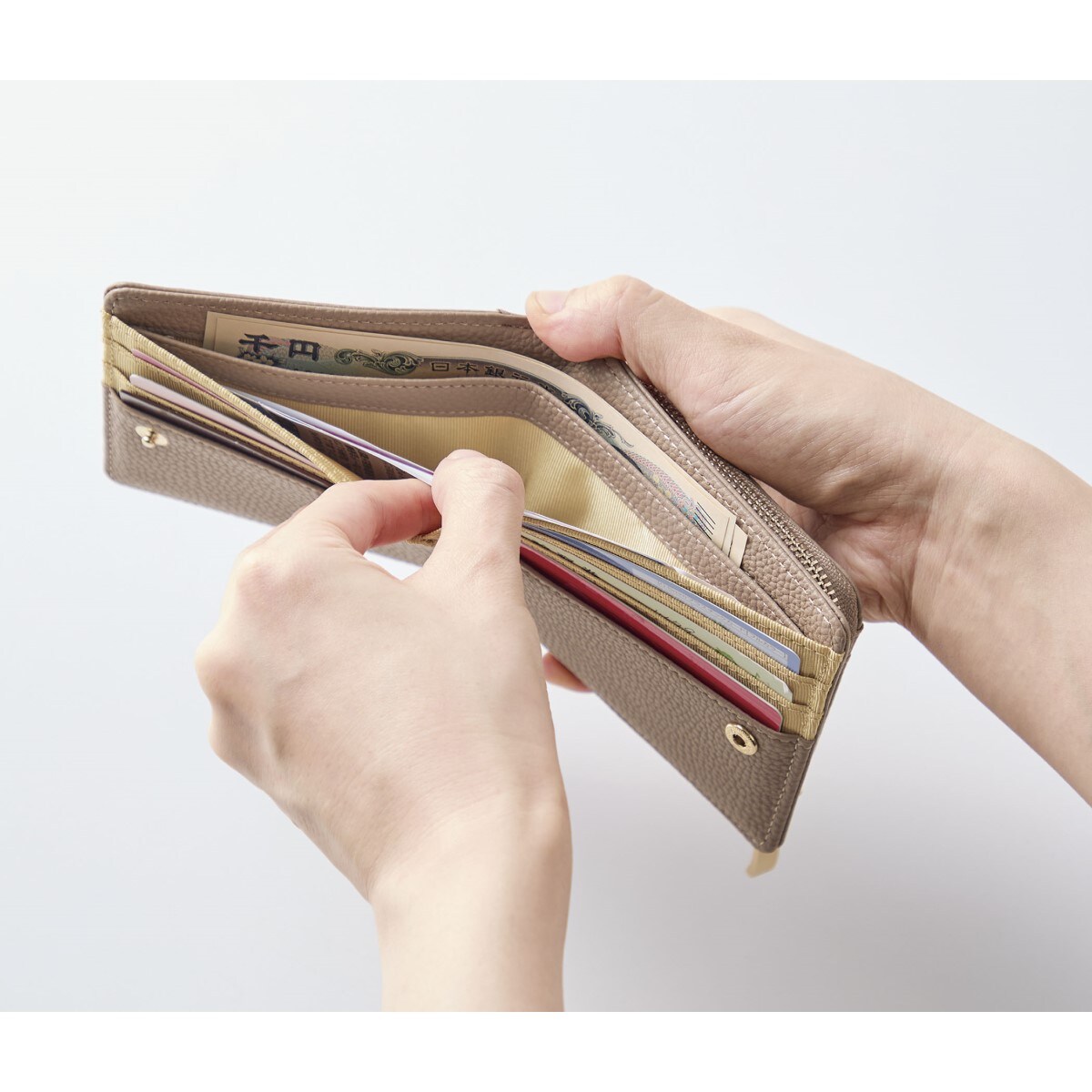 お財布の向きを変えることなく、小銭やお札、カードの出し入れができる!ミニバッグにも入るコンパクトサイズ。ーこだわりPOINTー小銭入れは、ジャバラ式のマチでガバッと大きく開き、取り出しやすい。ー素材特性ー外側は傷が目立ちにくいシボ入り。