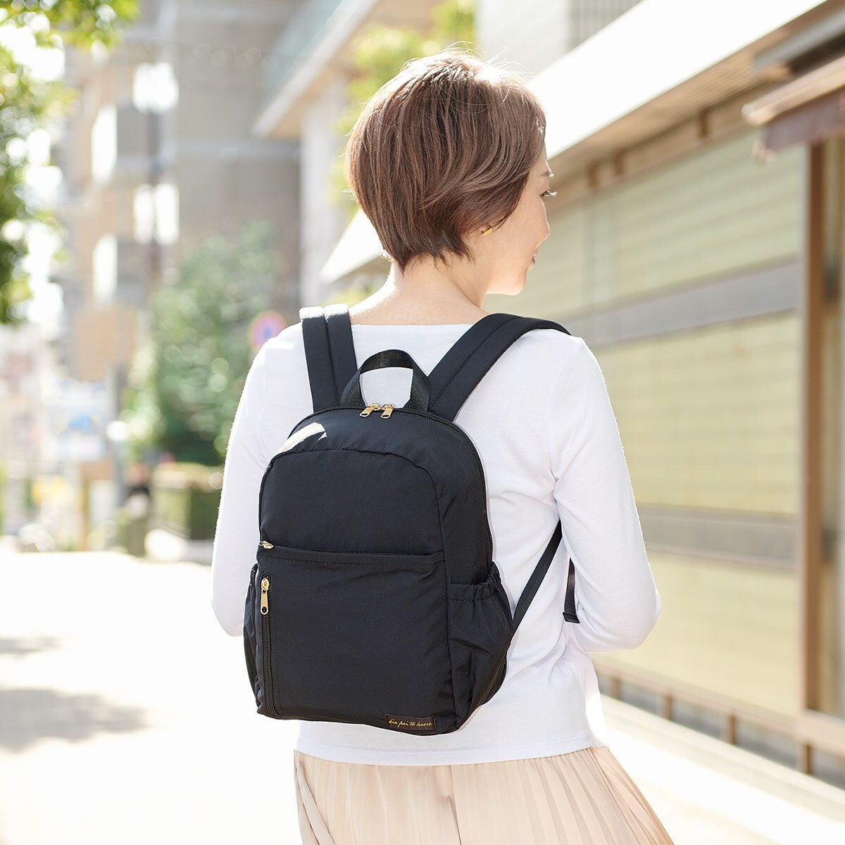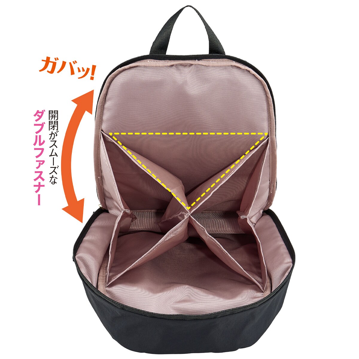 X字構造だから仕分け便利!コロンとかわいい軽量ミニリュック。ーデザインー開閉がスムーズなダブルファスナー仕様。内側生地は明るいカラーで、欲しい物を見つけやすい。ー素材特性ーはっ水加工(表地)を施し、多少の雨でも安心。背面はメッシュ&クッション柔らかく体にフィットします。