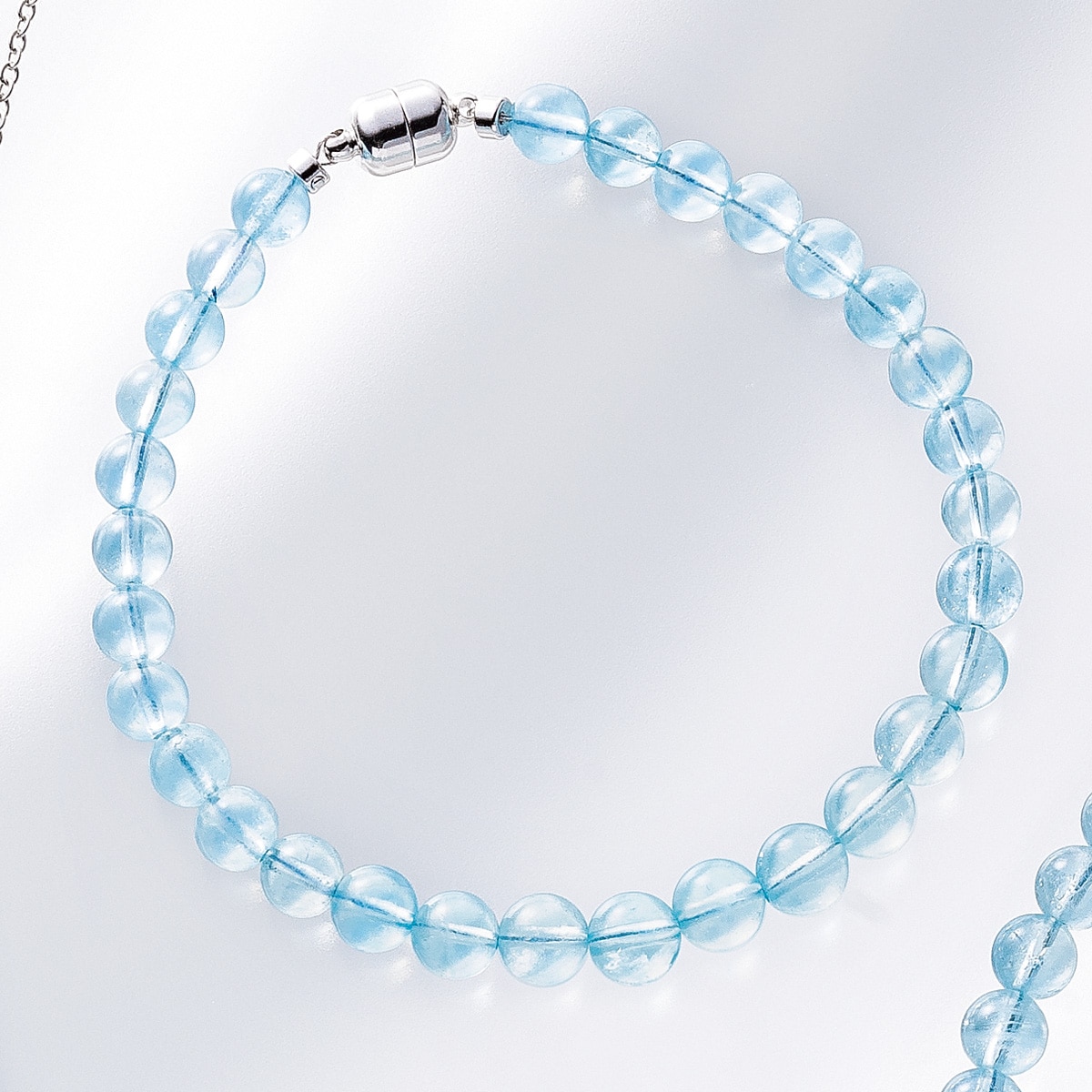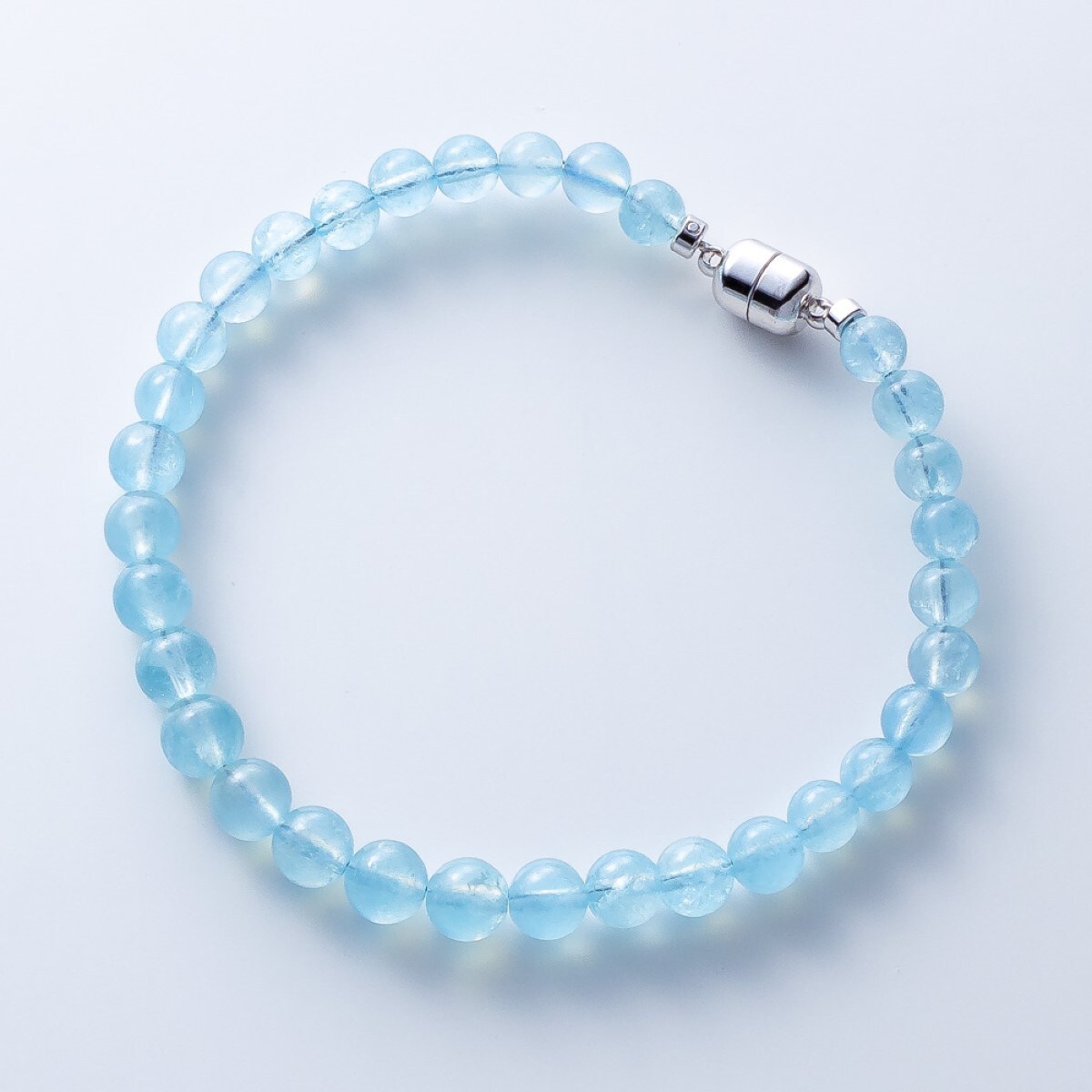 非常に稀少で、高価な宝石として知られるアクアマリン。今回は良質な原石を特別に確保できたことで、上質な輝きを手に取りやすい価格でご用意いたしました。暑い季節は爽やかに彩りたい。透明感があり涼やかなアクアマリンを。ーPOINTーブレスレットの留め具部分はマグネットで簡単に着脱できます。