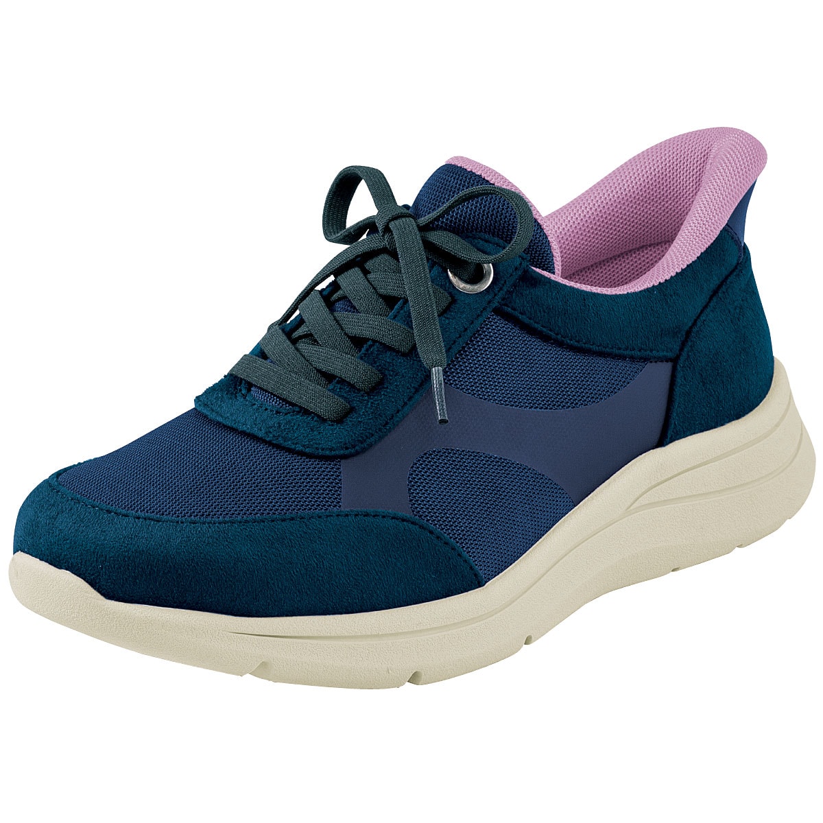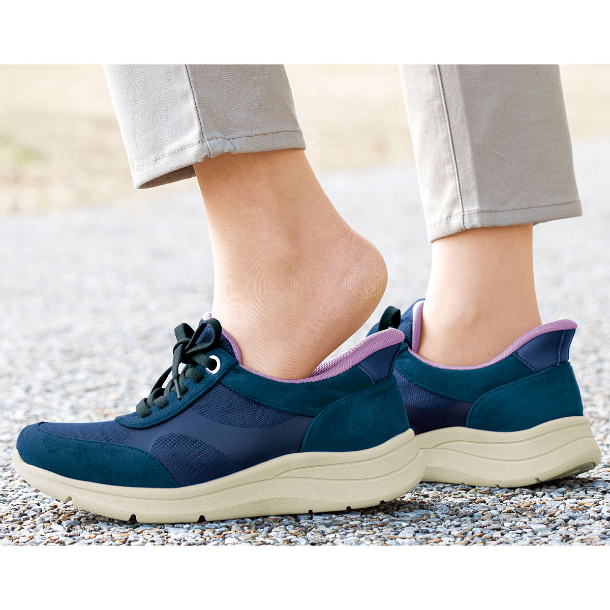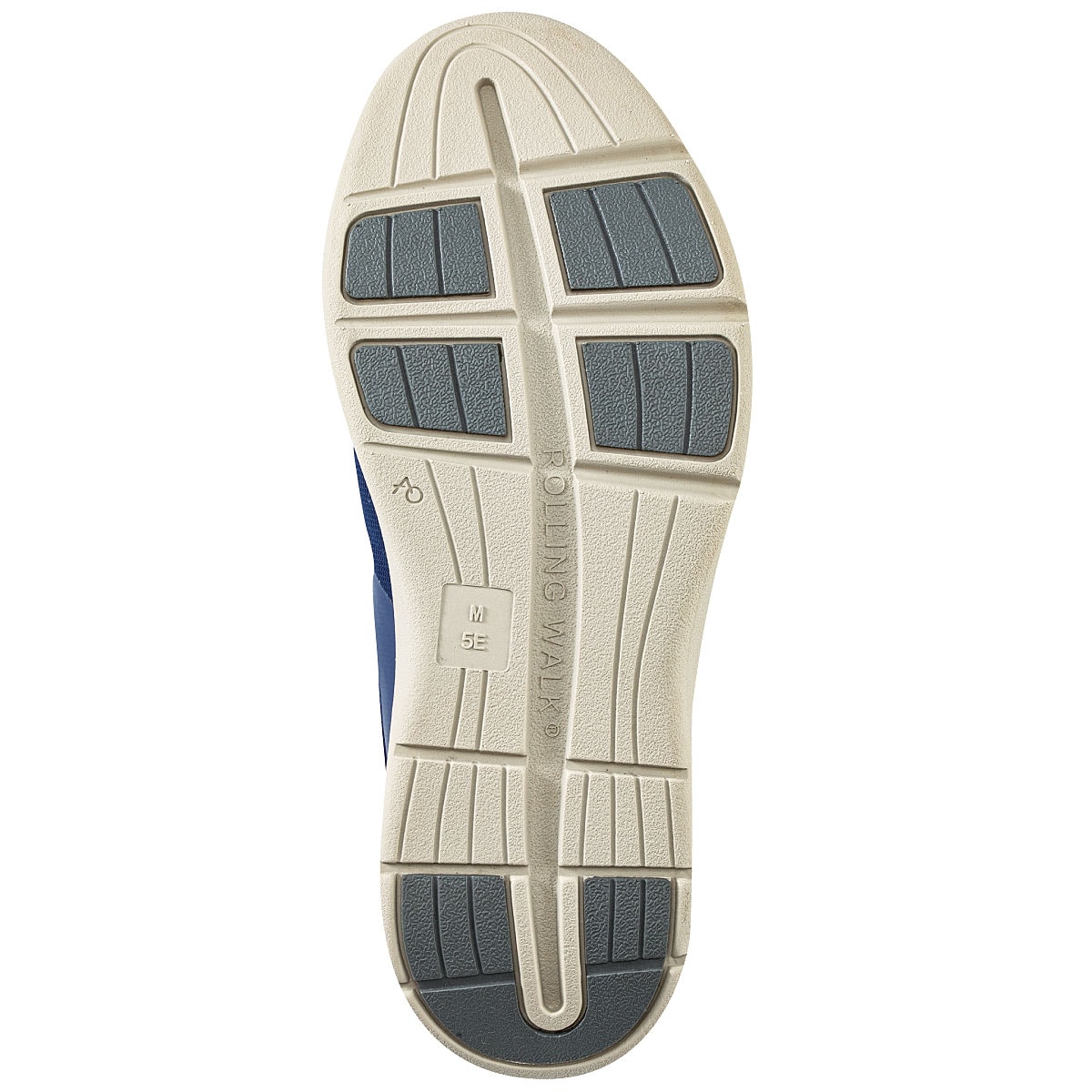 立ったままするっと履ける!靴ベラ形状&かかと部内側の滑りやすい素材で立ったまま履ける5Eスニーカー。ーこだわりPOINTー1.クッション性・通気性のよい凹凸の中敷を採用。かかと部は二重にクッションを配置し、衝撃を緩和。2.親指の付け根部分をふくらませた特別設計の木型を採用。3.足裏と靴の間にすき間ができにくく、足裏全体で体重を支えられる靴型設計。ローリング底で足運びもスムーズ。