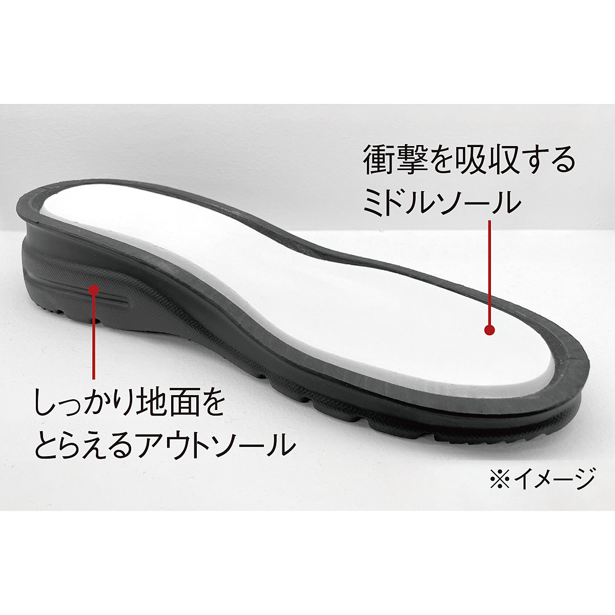 クッション性の高い2層のソールが衝撃を和らげて足裏の負担を軽減。