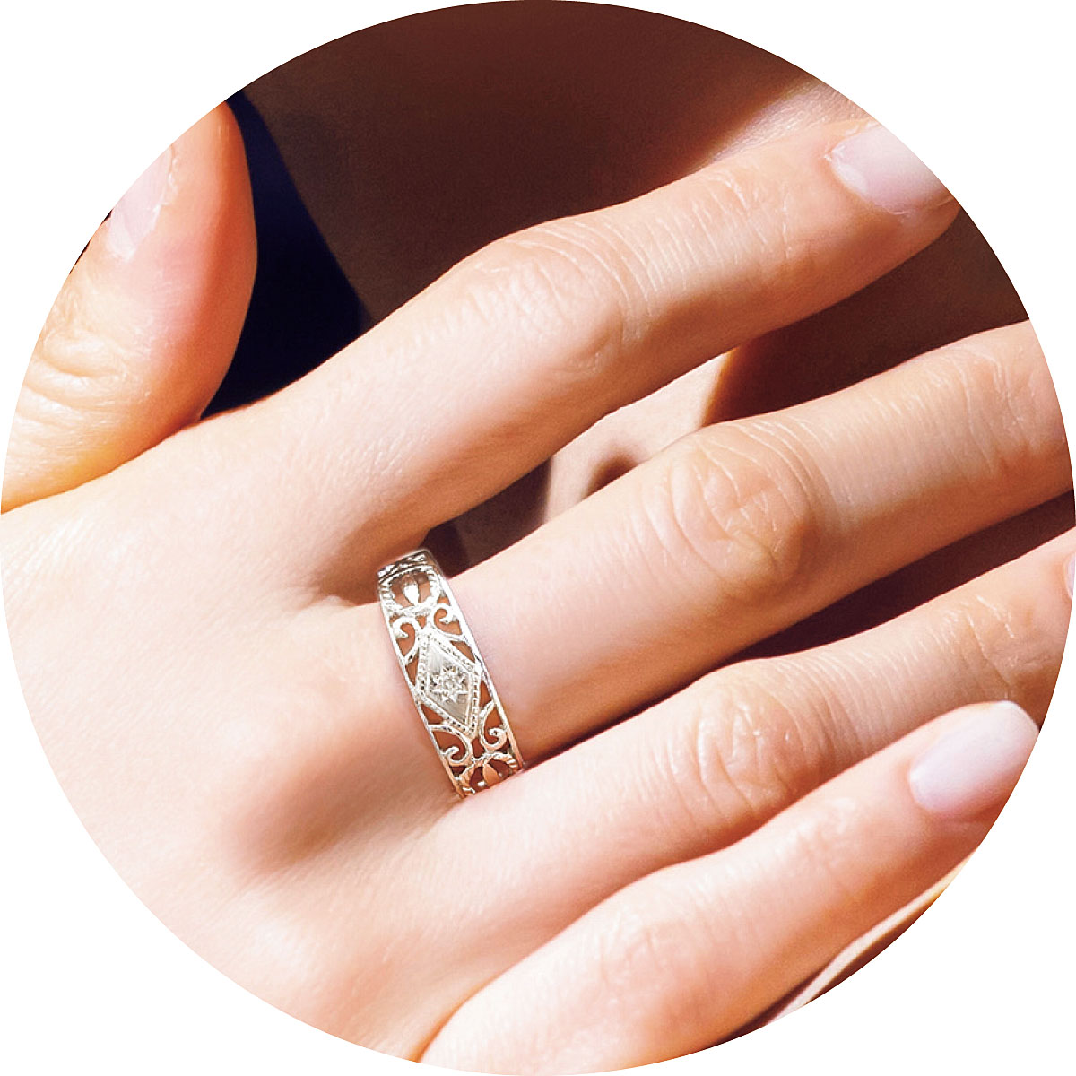 ダイヤモンドとアラベスク模様の透かし彫りがエレガント。ーPOINTーフリーサイズだから色々な指につけられます。