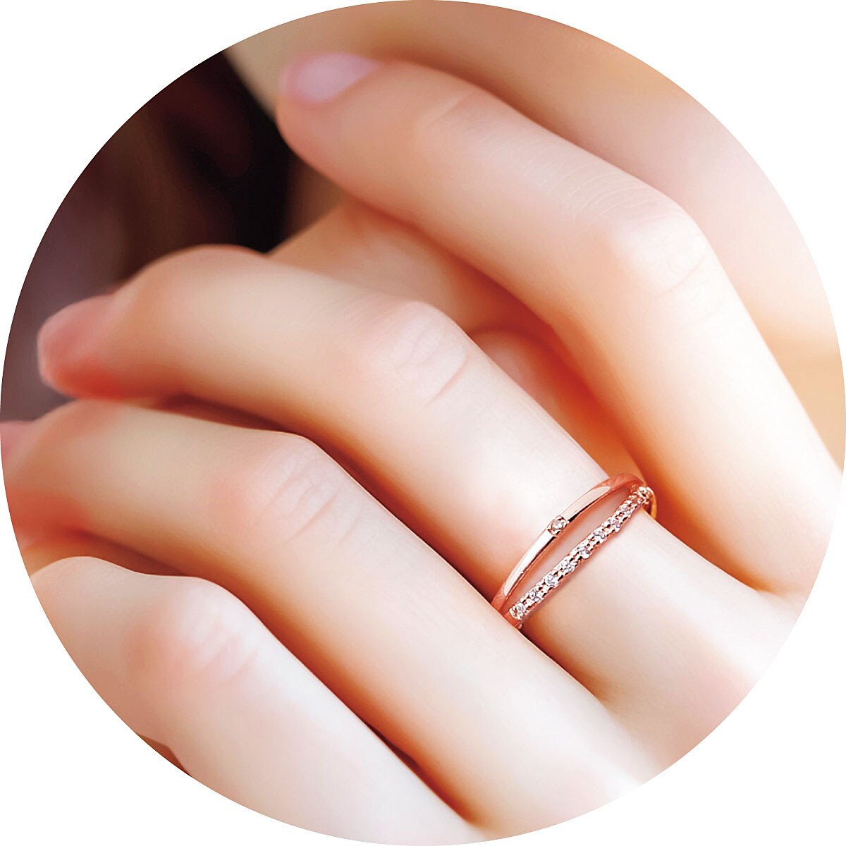 甲丸リングとエタニティリングを重ね着けしたような華やかさ。ーPOINTーフリーサイズだから色々な指につけられます。