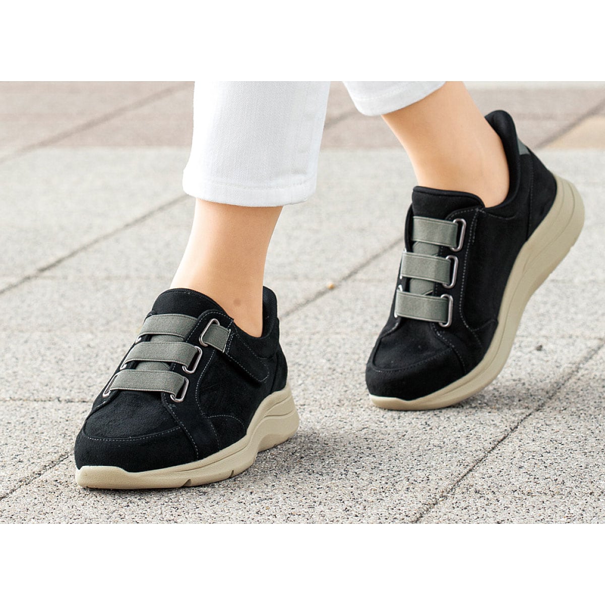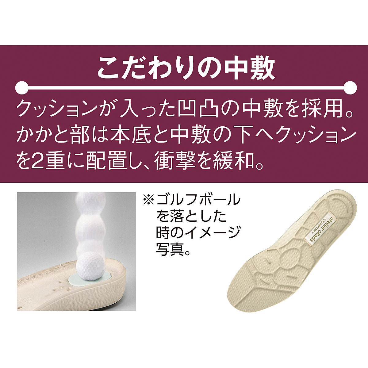 ーこだわりPOINTー1.足裏全体で歩ける…「あとりえOKADA」ならではの、足裏全体で体重を支えられる靴型設計。2.こだわりの中敷…クッションが入った凹凸の中敷を採用。かかと部は本底と中敷の下へクッションを2重に配置し、衝撃を緩和。3.木型へのこだわり…親指の付け根部分をふくらませた特別設計の木型を採用。4.ローリングウォーク®…船底形状の靴底で着地から体重移動・蹴り出しまでをサポートします。~あとりえOKADA~足と靴の研究を重ね、1974年に設立。足の健康を考えた靴づくりを得意とし、親指の付け根を膨らませた独自設計の靴型を採用。足にお悩みのある方にもおすすめのブランドです。■素材/[甲材]ポリエステル、合成皮革 [底材]合成底 ■ヒール高/約4cm ■重量/約245g(Mサイズ片足) ■ワイズ/5E相当●中国製※靴の試し履きは必ず室内でお願いします。一度ご使用になられた靴の交換・返品は承れません。※雨の日や水に濡れた路面・床面でご使用の場合には、スリップや転倒の危険がありますので、歩行の際には十分ご注意ください。