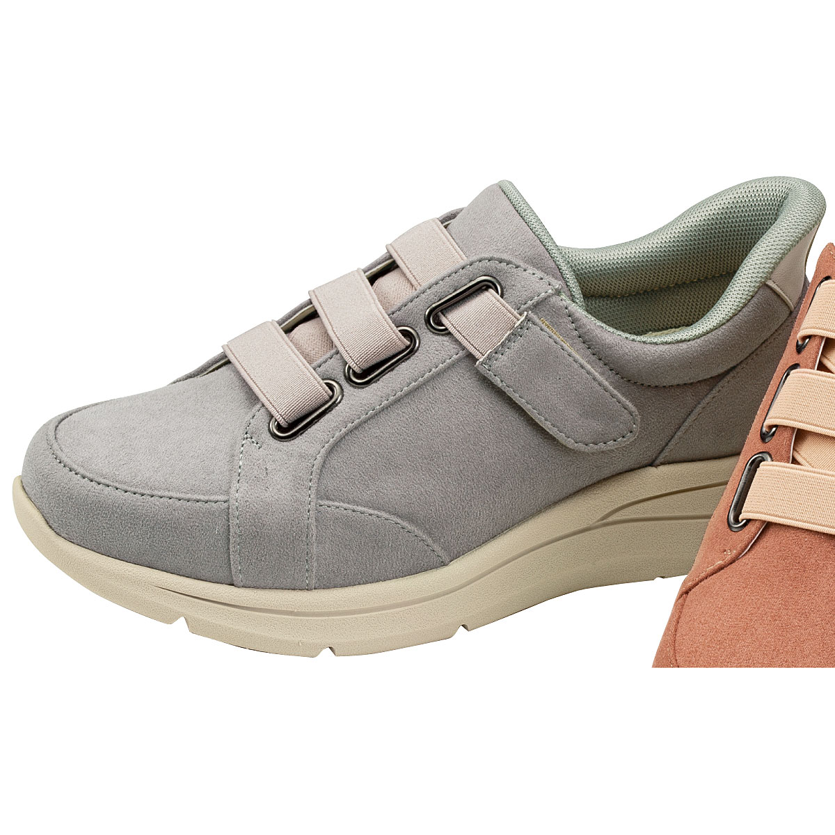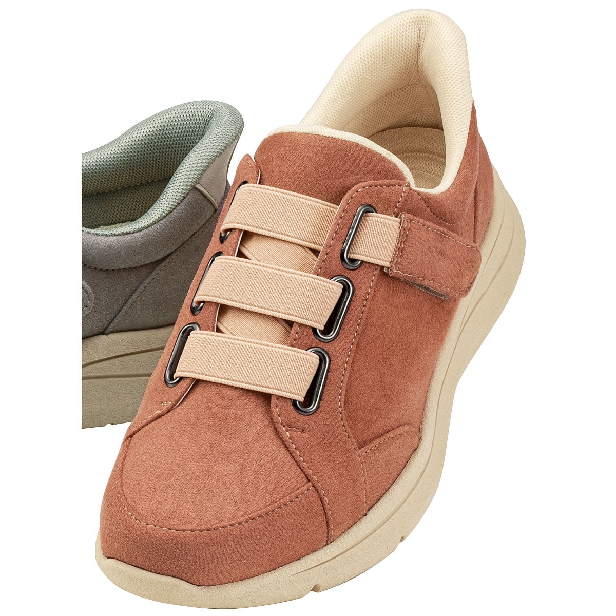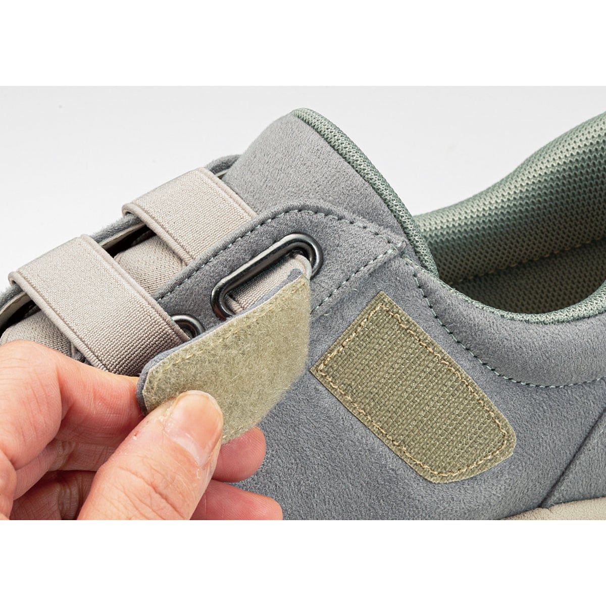 手を使わずにはける!かかと部分が靴ベラのような形状なので立ったままスムーズにはける仕様です。面ファスナーでお好みのフィット感に調節可能。