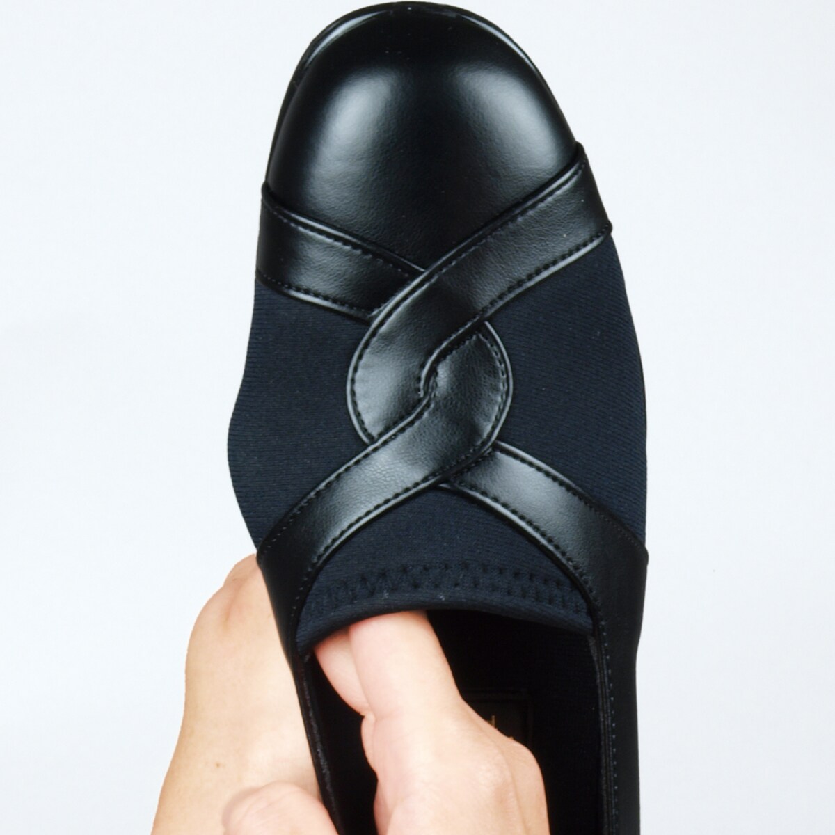 履きやすくて歩きやすい国産機能性シューズ。甲周りに伸縮素材を使用し、足指の付け根に優しくフィット。つまずきにくく、着地や蹴り出しがスムーズ!ーデザインーフロント部分のクロスが印象的なクロスラインデザイン。