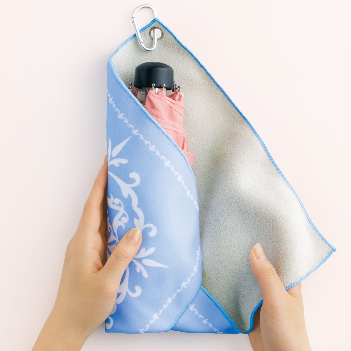 濡れた傘やペットボトルに大活躍!もちろんハンカチとしても。水滴を拭き取ってくるっと巻き付けるだけ。ー素材特性ー表と裏がピタッと密着!面ファスナーと似た構造で、繊維同士がしっかり密着するため、結ぶ必要がありません。ーこだわりPOINTーカラビナ付きでバッグに取り付けOK。濡れたものをバッグにしまう時に大活躍!