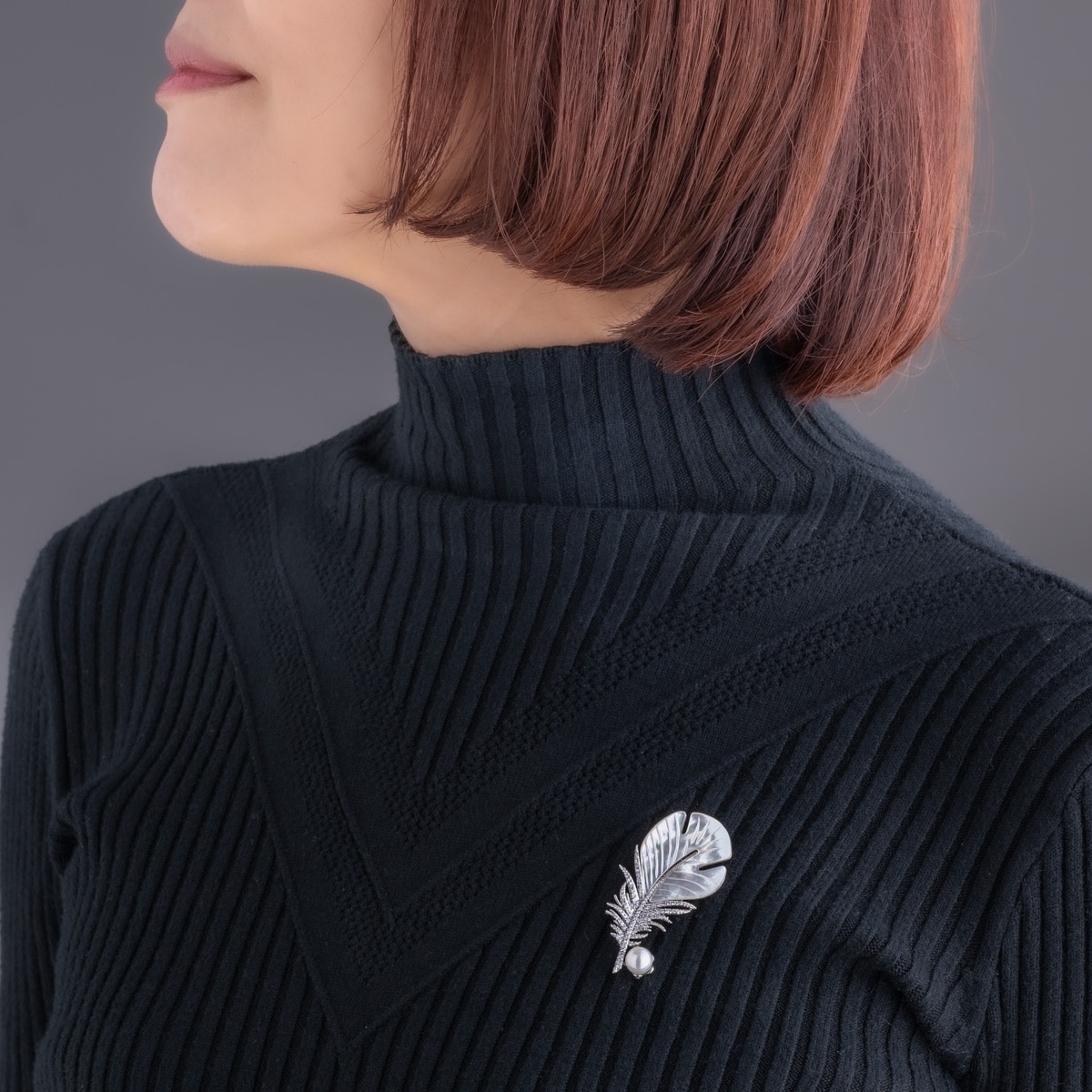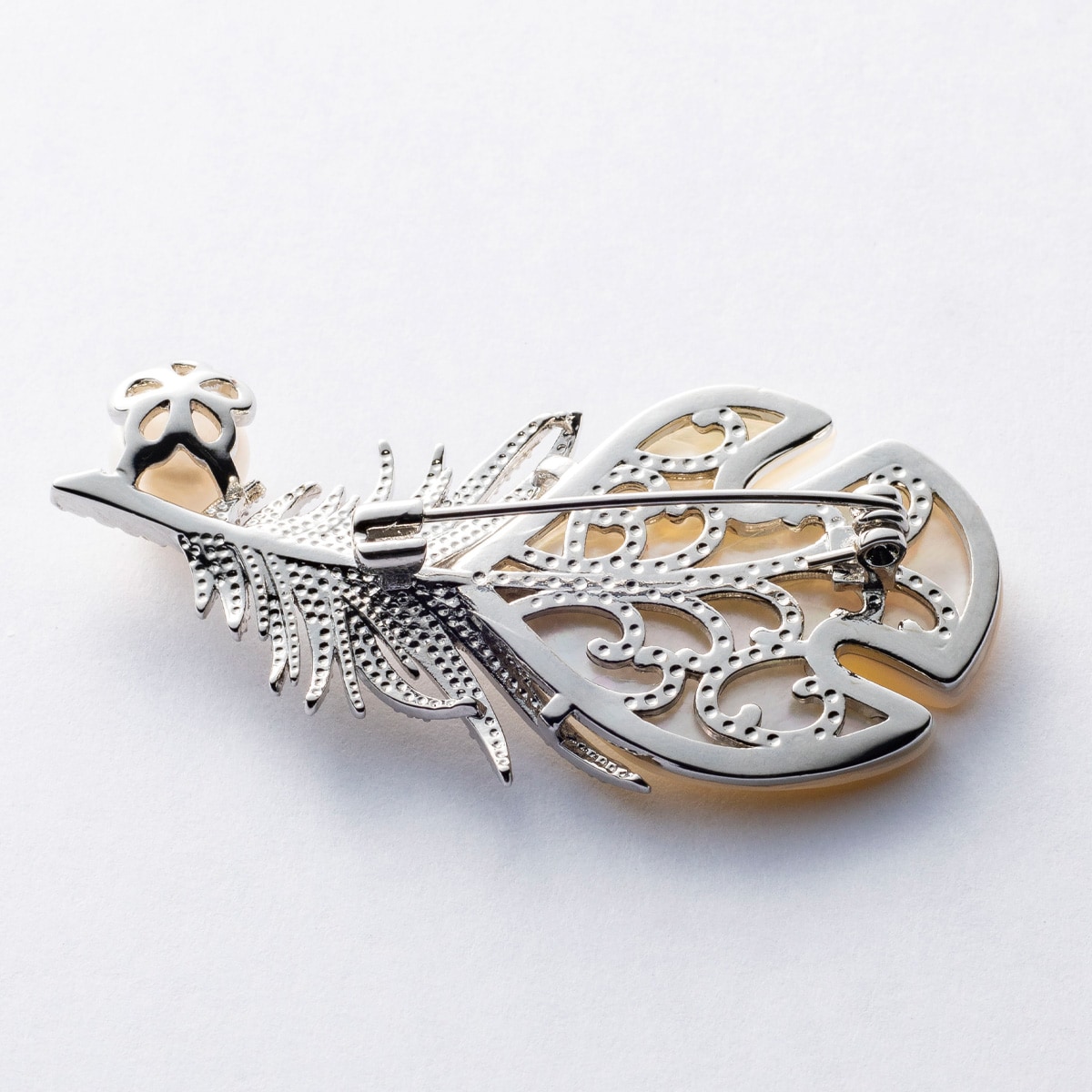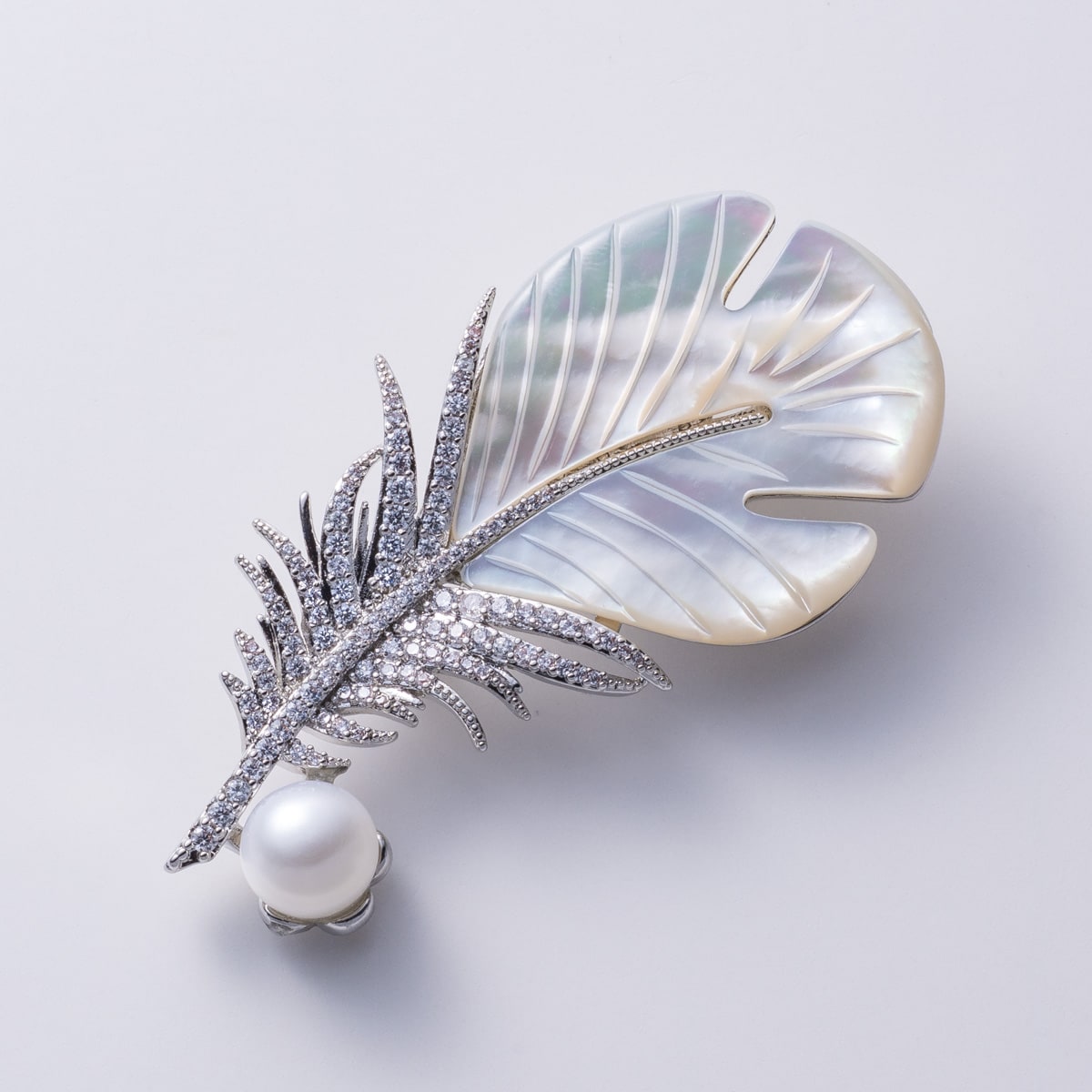フェザー(羽)をモチーフとしたブローチで、シェル、パールとキラキラ輝く石でゴージャスな雰囲気で胸元を彩るのにピッタリです。