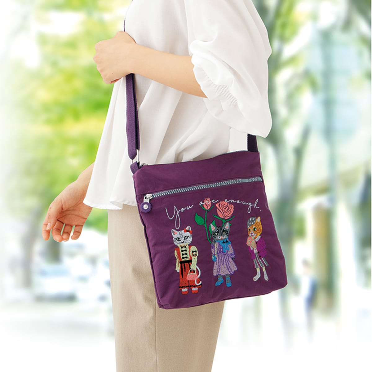 軽量約165gと軽く肩もラク!コーデのアクセントにもなる刺繍ショルダーバッグ。両手が空いて、手ぶらでおでかけ。ーこだわりPOINTー手刺繍みたいな可愛らしさ。印刷では出せない、刺繍ならではの華やかで豊かな表情が特徴です。※背面は無地仕様です。ーデザインー計4つのポケット付きで、仕分けもラク!