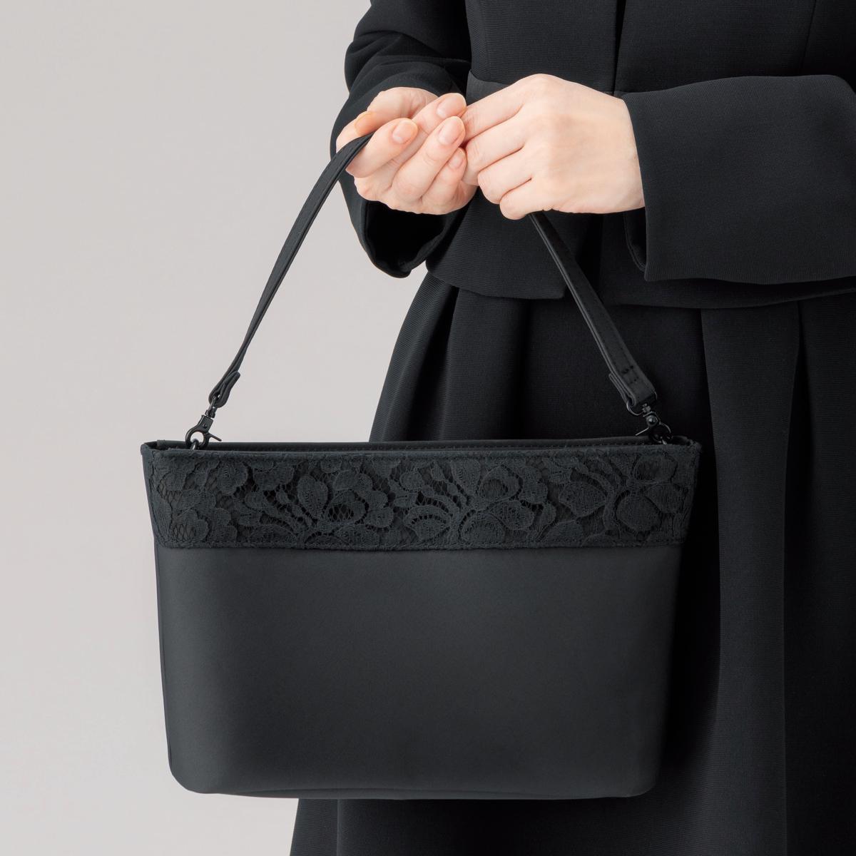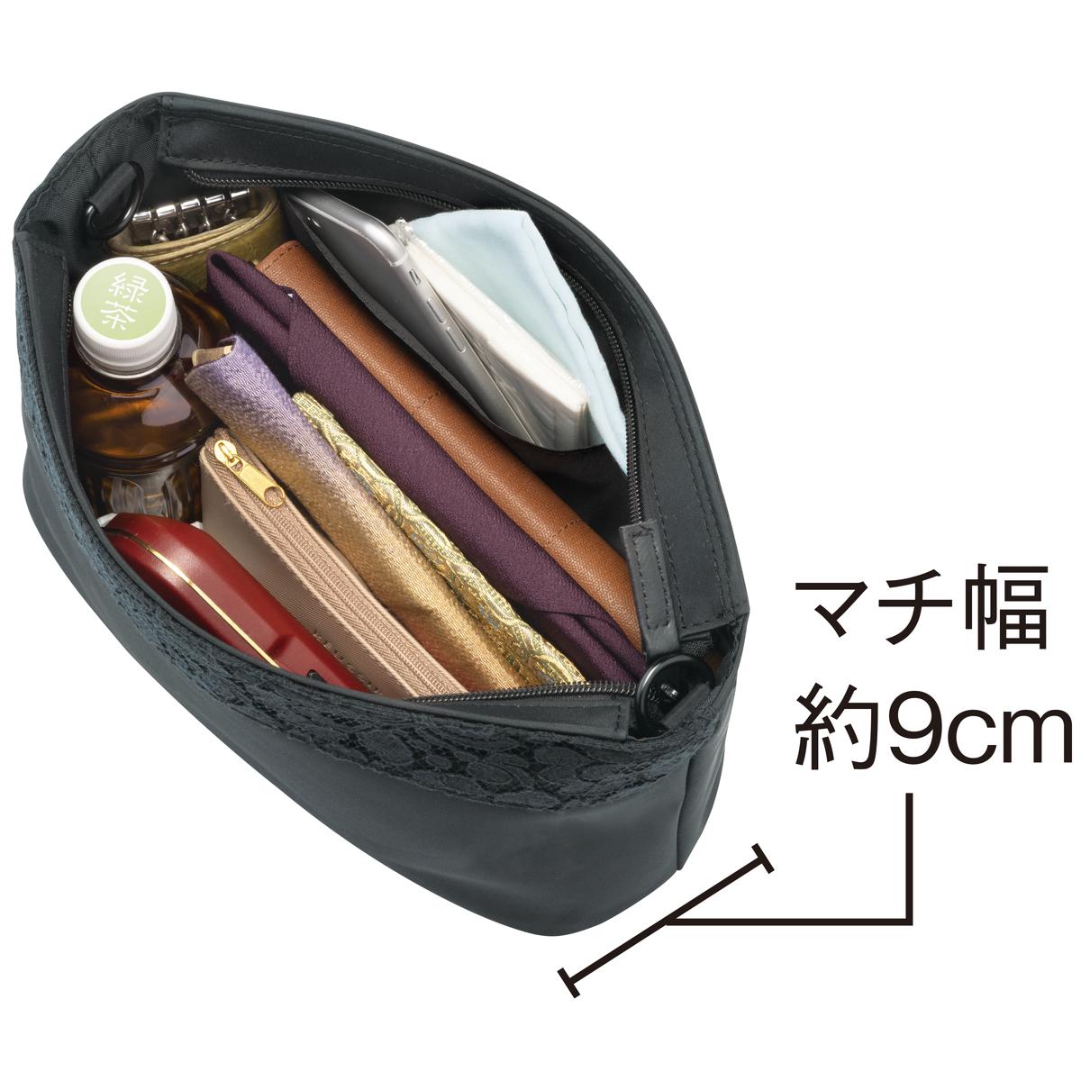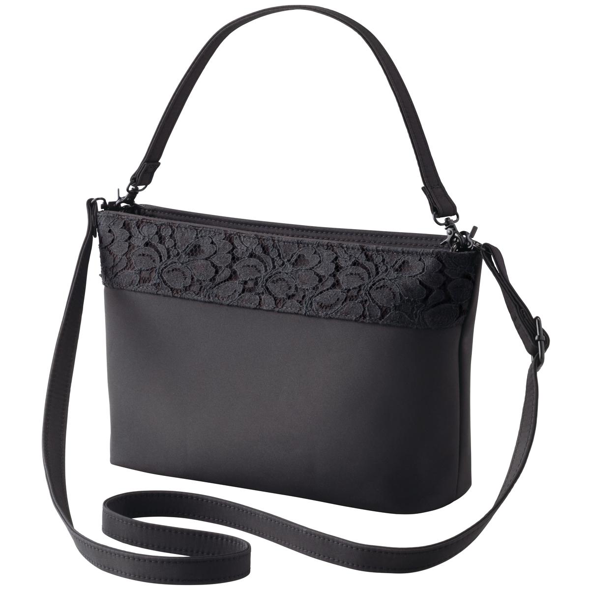 フォーマルな装いにふさわしく、シーンに合わせて使い分け。350mlのペットボトルも入る大容量ショルダーバッグです。ーデザインー蘭のモチーフのデザインレース。ー素材特性ー雨の日も安心なはっ水加工。