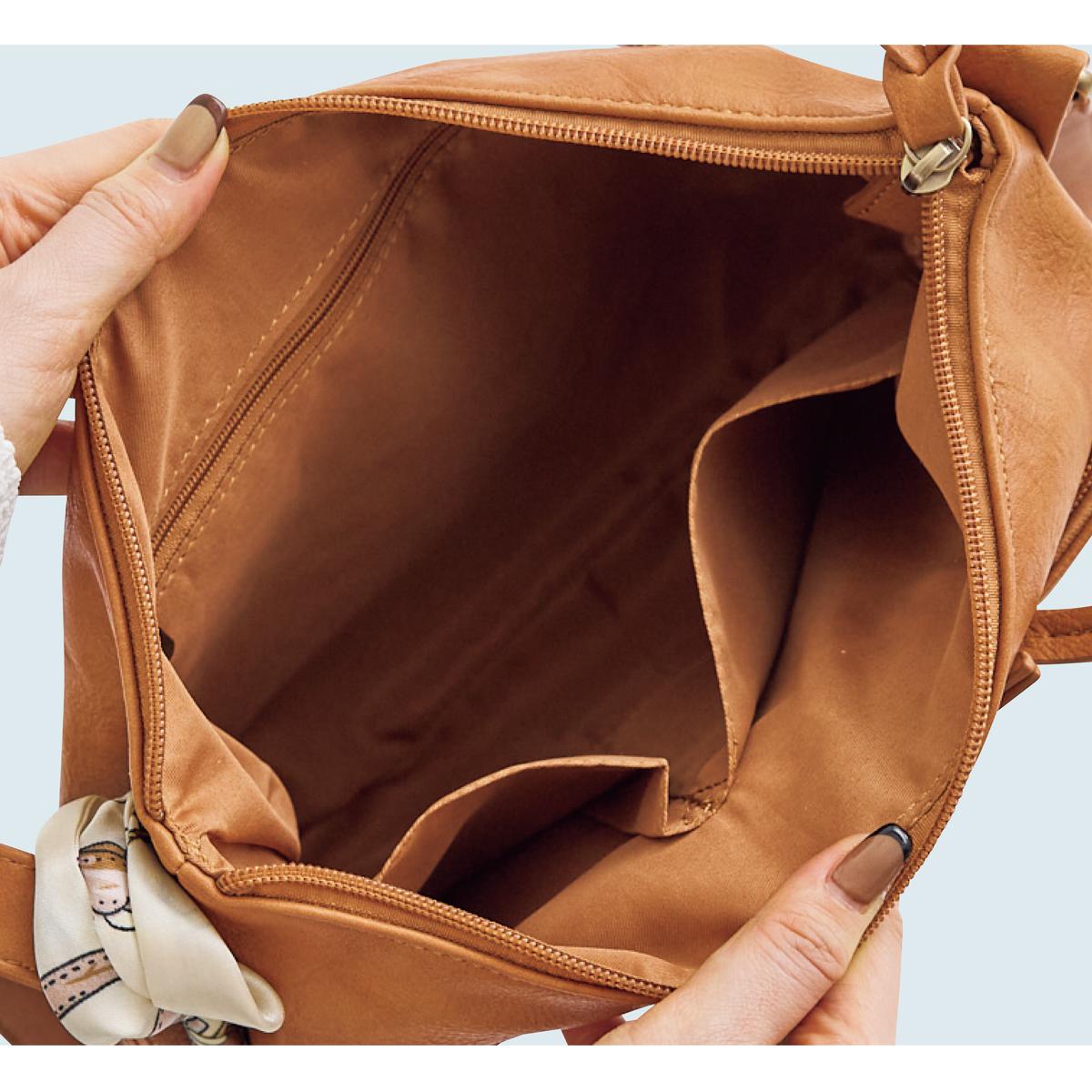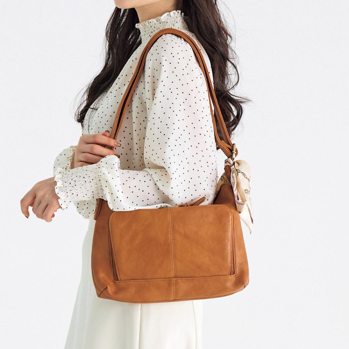 ベーシックなデザインなので、普段使いはもちろん、通勤・旅行にも。肩掛けとななめ掛け、どちらでも使用可能な2WAYバッグ。シンプルながらも機能性に優れ様々なシーンで活躍します。ーこだわりPOINTーコーデのアクセントに取り外しできるスカーフ付き。細かな仕切りで収納上手に。B5ファイルも収納可能です。ー素材特性ー表情のあるムラ合皮素材。