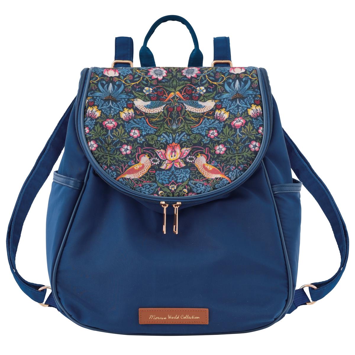 ガバッと開く!コンパクトながら、収納力に優れた大人リュック。ーデザインーB5ファイルも収納可能。内側にオープンポケット×2、両サイドに500mLペットボトルが入るサイドポケット付き。~モリスワールドコレクション~「いちご泥棒」は19世紀にデザインされた、インディゴ抜染により赤や黄色といった藍色以外の糸を取り入れた最初のテキスタイルです。