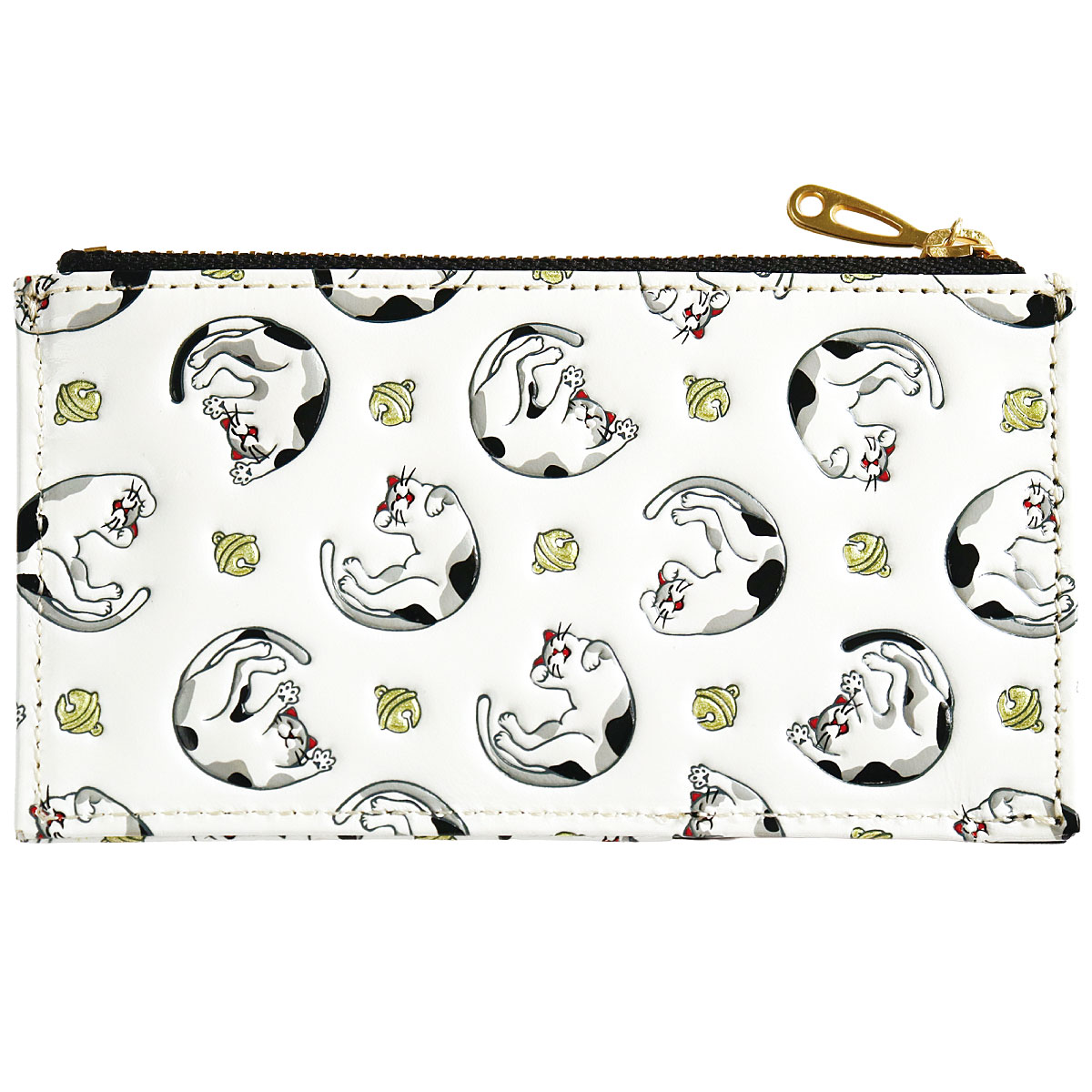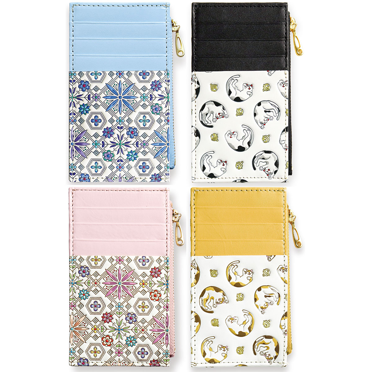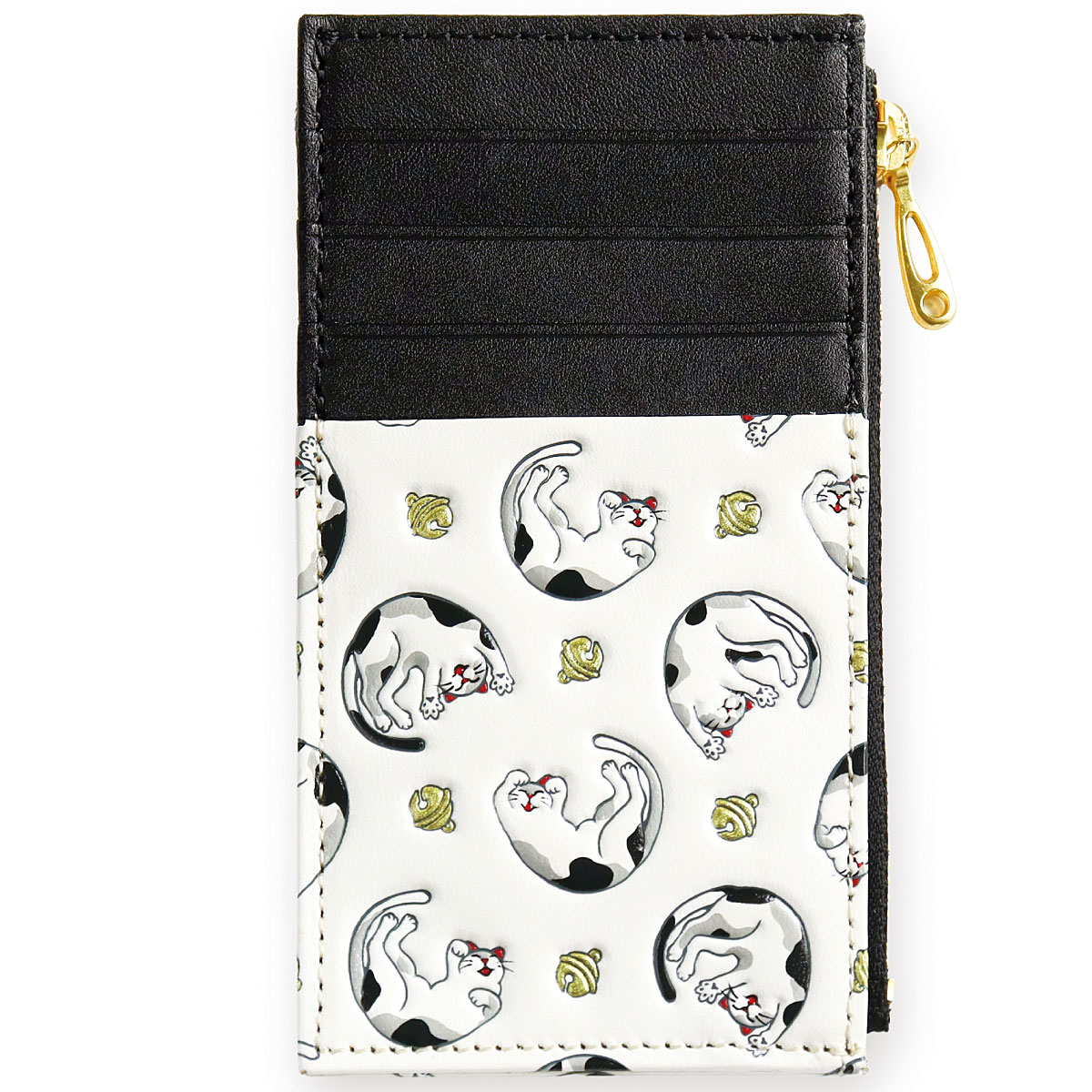 ーデザインーねこ(イエロー系・ブラック系)…愛らしい姿でころころと転がる猫たち。立派なおひげと、可愛い肉球がチャームポイント。花菱(ピンク系・ブルー系)…ひとつひとつに想いを込め、四季折々の縁起が良いとされる草花を5種類あしらいました。心華やぐ美しい意匠です。~浅草文庫® ASAKUSA BUNKO~白くなめされた革に、色鮮やかな絵柄を描いた浅草文庫。友禅の技を駆使し、職人が丹念に作り上げます。白革に寸分のズレがないよう一色ずつ色を重ね、立体感を出すために型押しして、生き生きとした表情を与えていきます。汚れにくい加工も施されており、使いやすさや機能も十分です。■素材/[表]牛革 [内側]牛革、レーヨン ■サイズ(約cm)/7.5×13×1.5 ■重量/約35g ■仕様/[開閉]ファスナー式 [内側]オープンポケット×1[外側]カード入れ×4、オープンポケット×1 ●化粧箱入り※職人が一点一点丁寧に製作しているため、多少趣が異なる場合がございます。 ※天然革の特性上、商品によって多少色や柄が異なります。●日本製