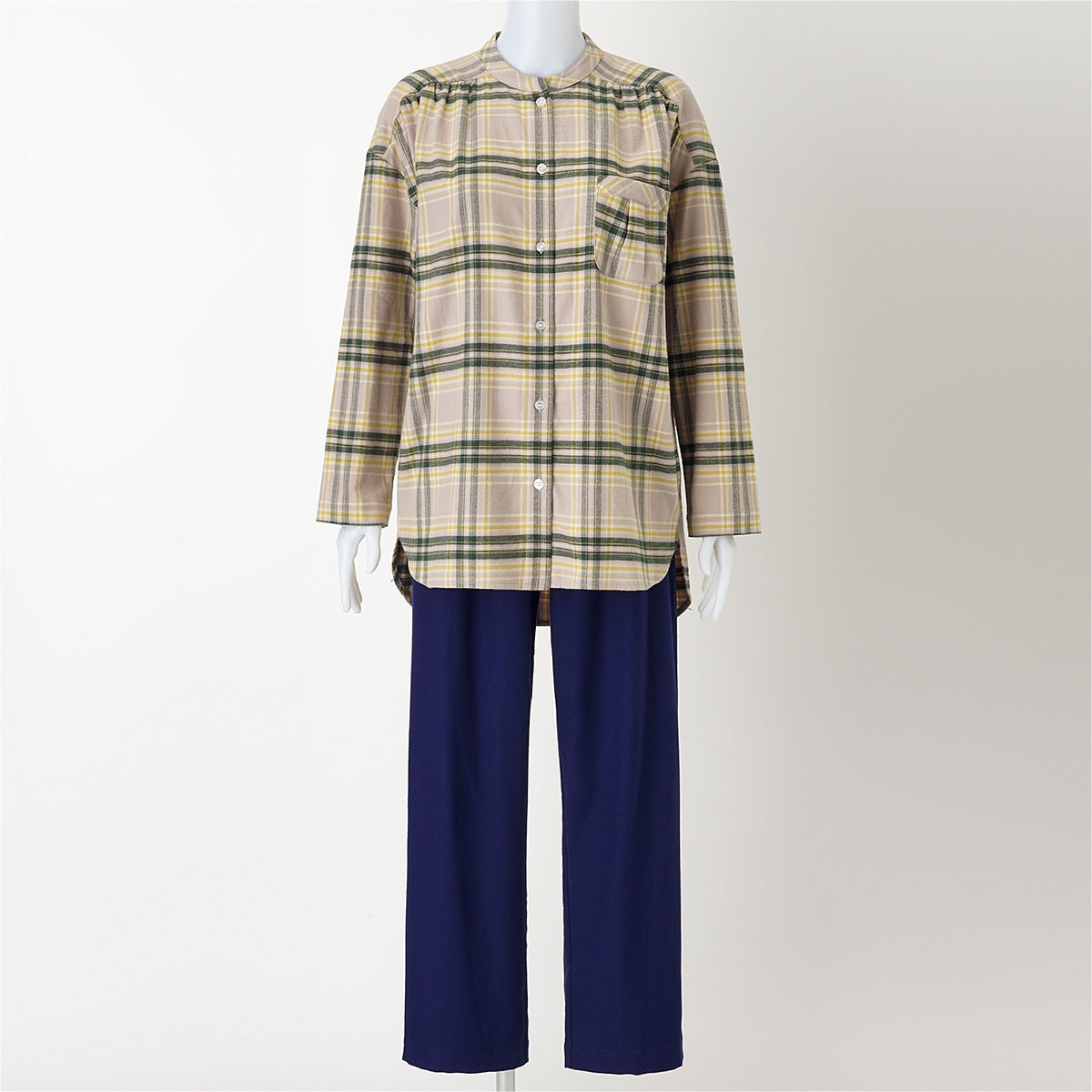 ベージュ系(トップス:ベージュ×グリーンチェック、パンツ:ネイビー)