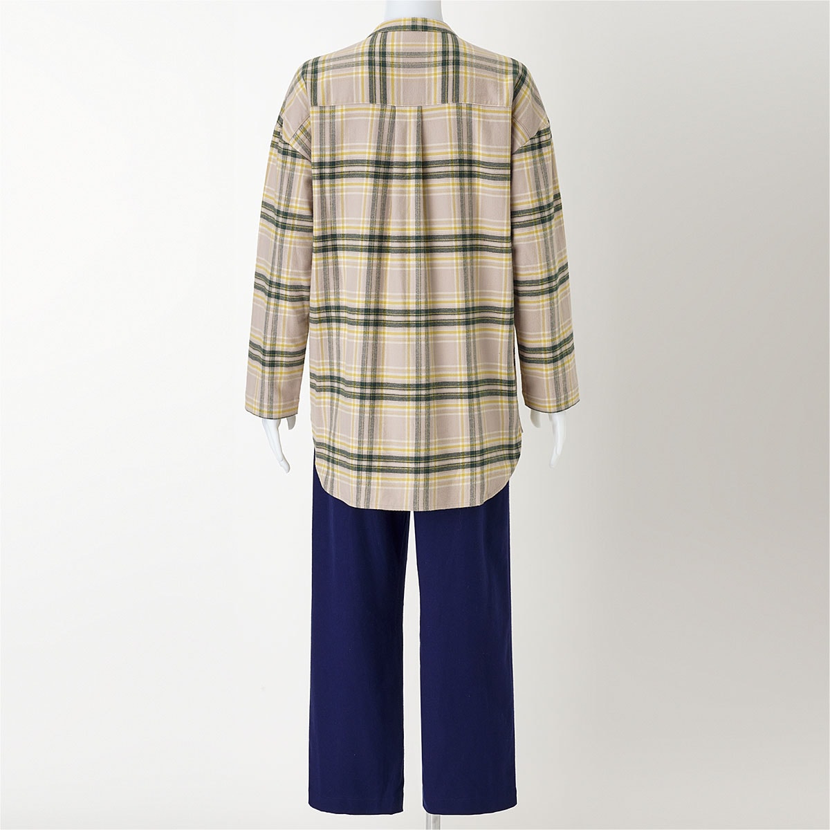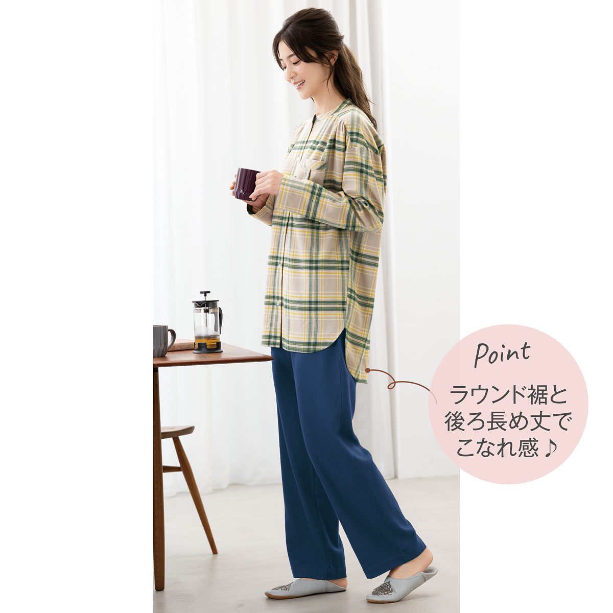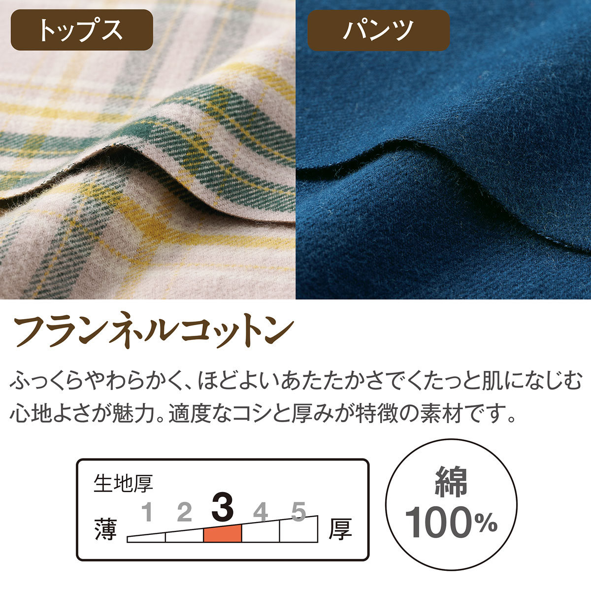 肌にやさしい綿100%生地の表裏をふんわり起毛させた、やわらかフランネルの巣ごもりパジャマ。肌に心地いいコットン素材を、ぬくぬくやわらかな肌あたりに仕上げました。トップスはタック入りでゆったりリラックス感のある着心地。チェック柄や裾のラウンドシルエットがシンプルな中にもさりげなくおしゃれなアウター風のデザインだから、ルームウェアにもぴったり。パンツにはスマホが入る後ろポケット付き。ウエストゴム取替OK。大きいサイズ(M~3L)もあります。