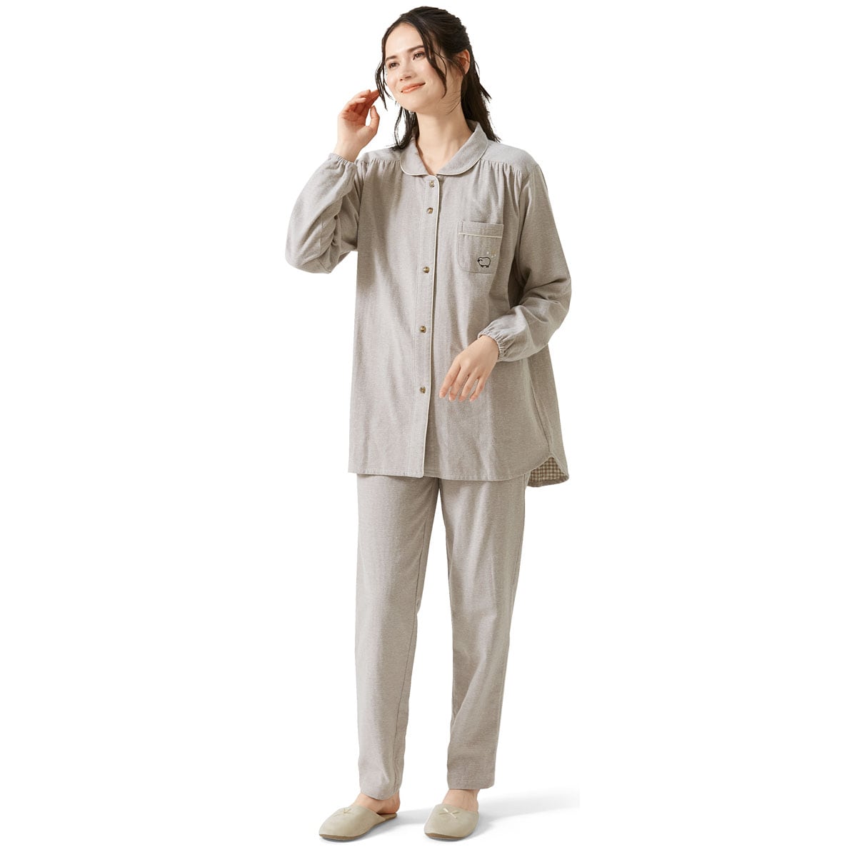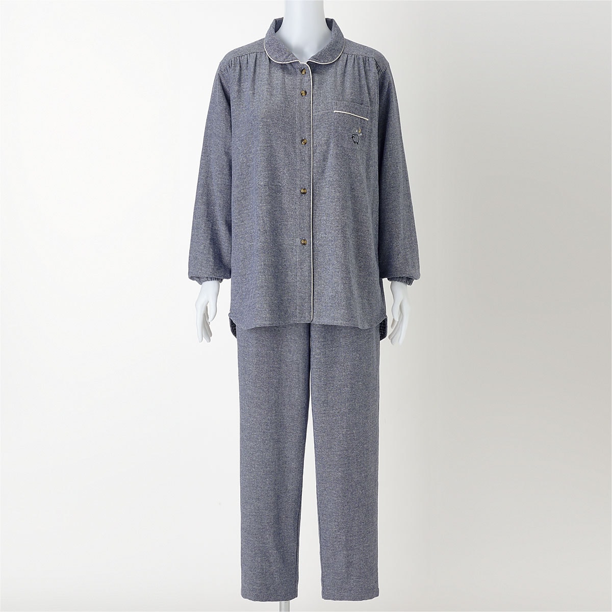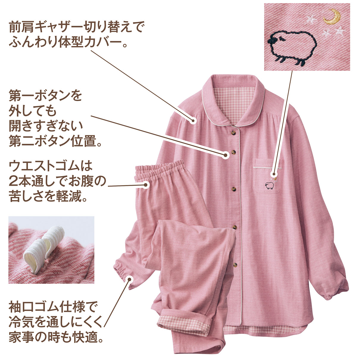 表側はふんわりぬくもり感のあるネル起毛素材、肌側は蒸れにくい綿100%ガーゼ生地のW使い。生地の層に空気を含んであたたかく、ふかっとした着心地が気持ちいい冬パジャマ♪寝返りしやすいゆったりしたサイズ感でぐっすり安眠を導きます。第一釦を外しても衿が開きすぎないよう、第二ボタンの位置にも工夫。袖口はゴム仕様で冷気を通しにくく、家事も快適。ウエストゴムは細いゴムを2本通すことで締め付け感を軽減してお腹に優しくフィット。取り替えもOK!こだわりパジャマで良質な眠りを。大きいサイズも展開(M~3L)