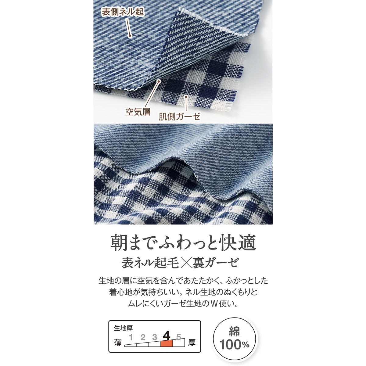 表側はふんわりぬくもり感のあるネル起毛素材、肌側は蒸れにくい綿100%ガーゼ生地のW使い。