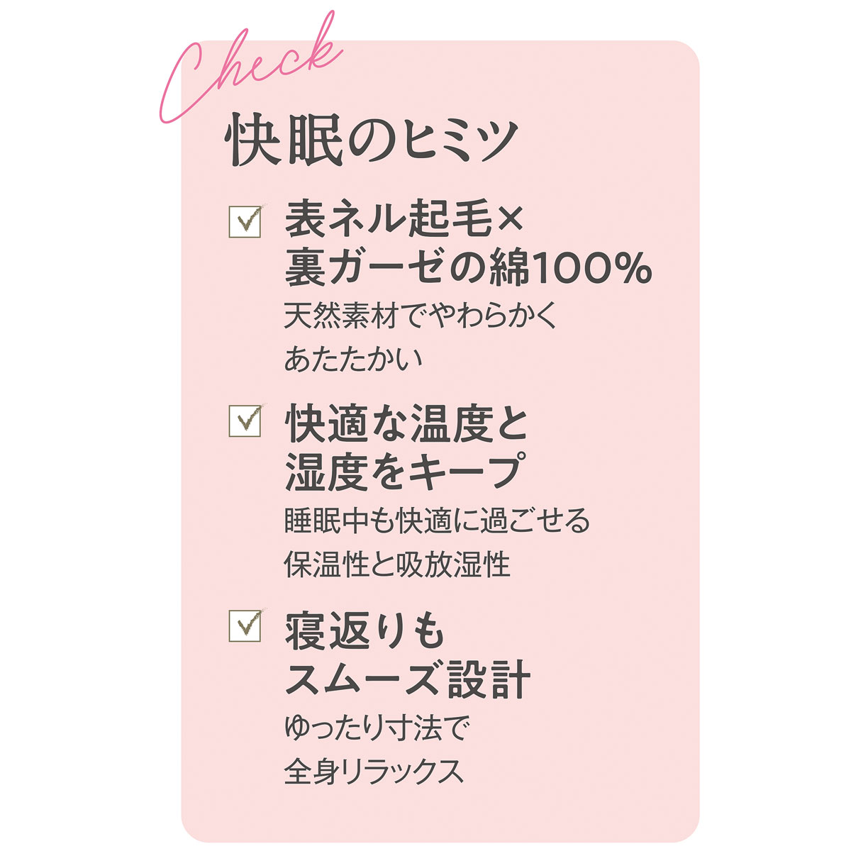 綿100%のあったかガーゼ素材だから保温性と吸放湿性を備えて睡眠に快適な湿度と温度をキープ。
