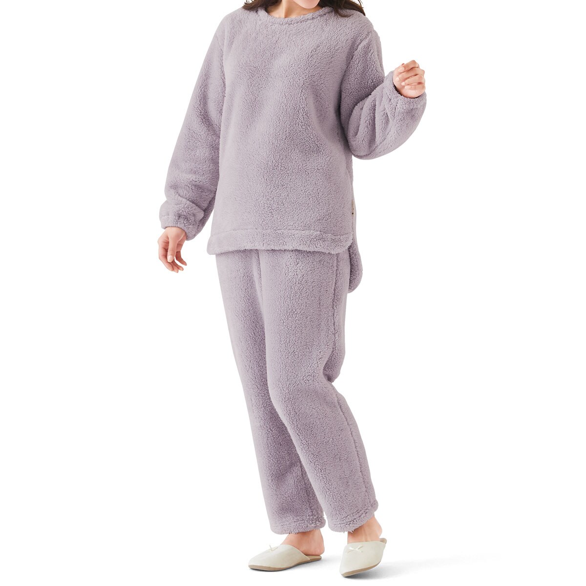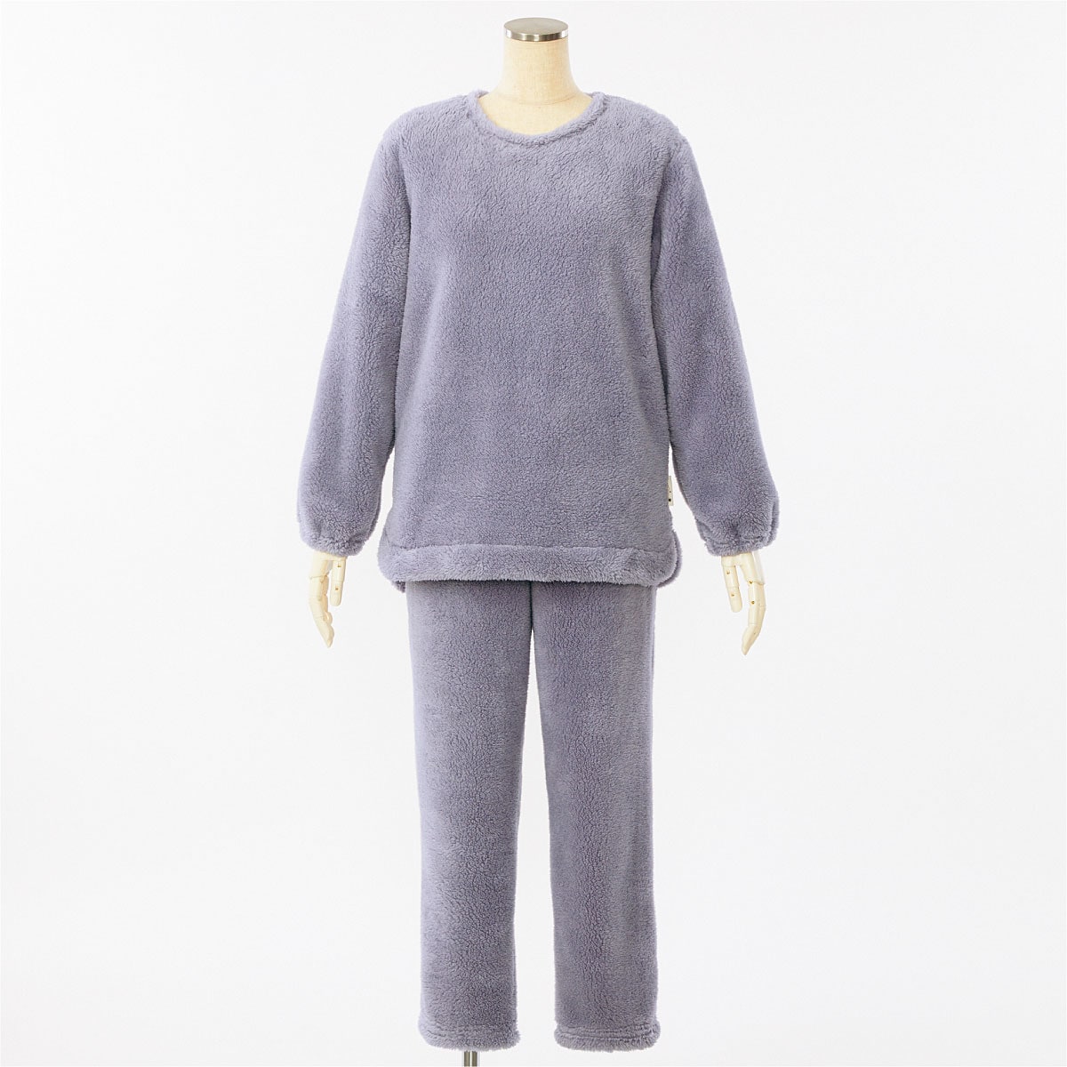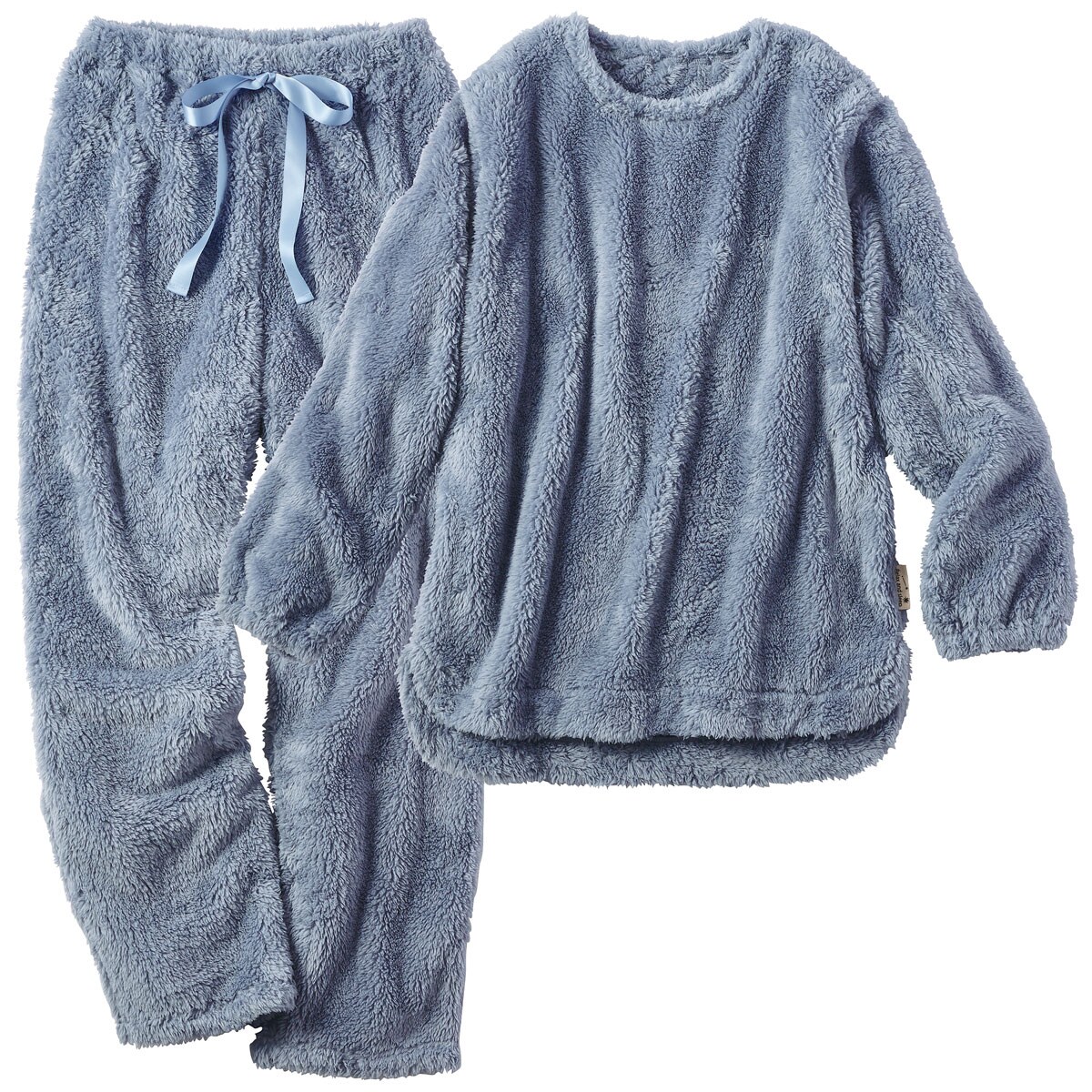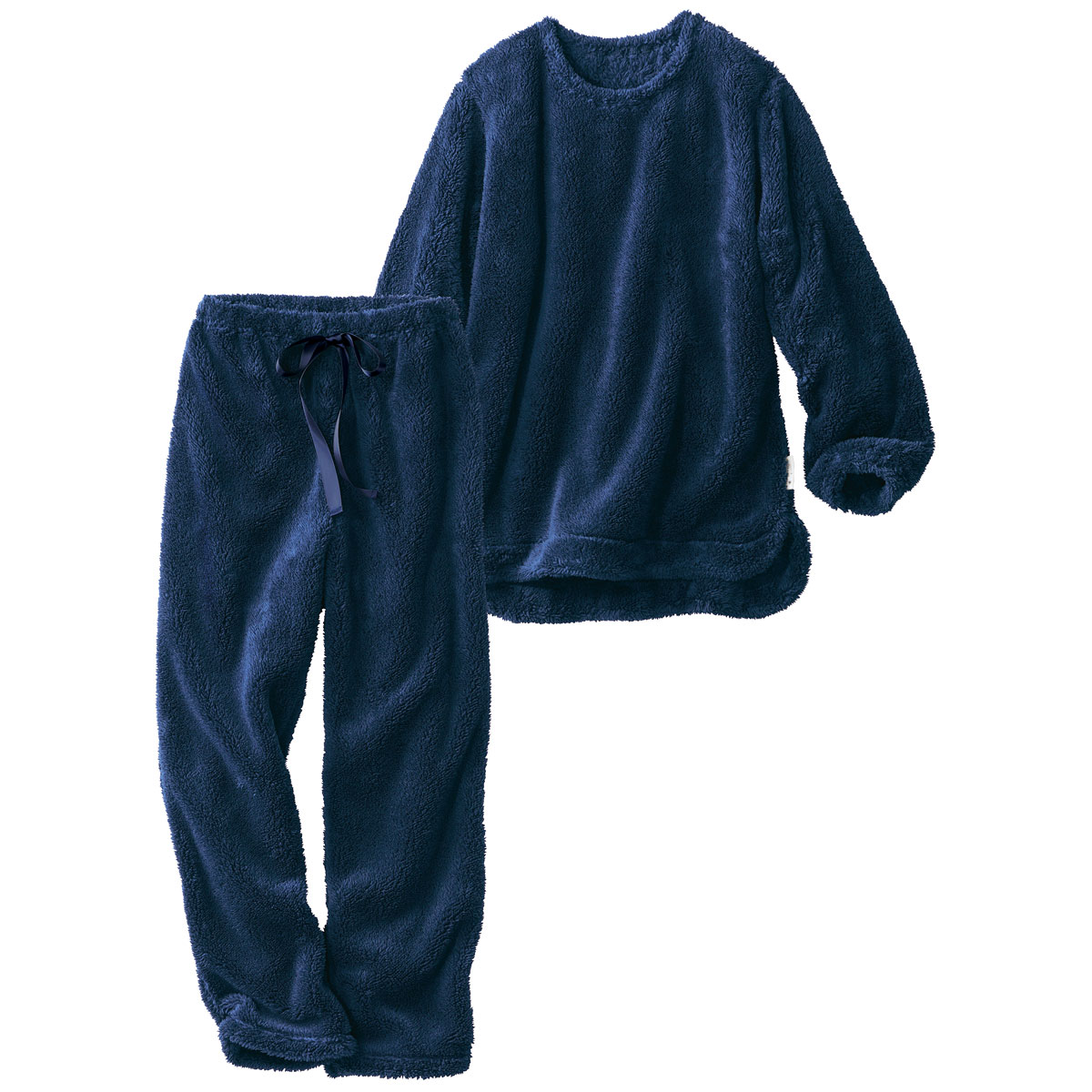 ■〔ニット〕ポリエステル100%(ボアフリース)●上着=後衿ぐり・袖口ゴム仕様 左裾脇ピスネーム仕様●パンツ=右後ポケット▼ウエストのサテンスピンドルはかざり仕様です▼上着丈は後身頃の丈寸法になります●中国製【ウエストゴム取替OK】 【大きいサイズ・小さいサイズも展開】(S~5L)【生地厚指数5++】