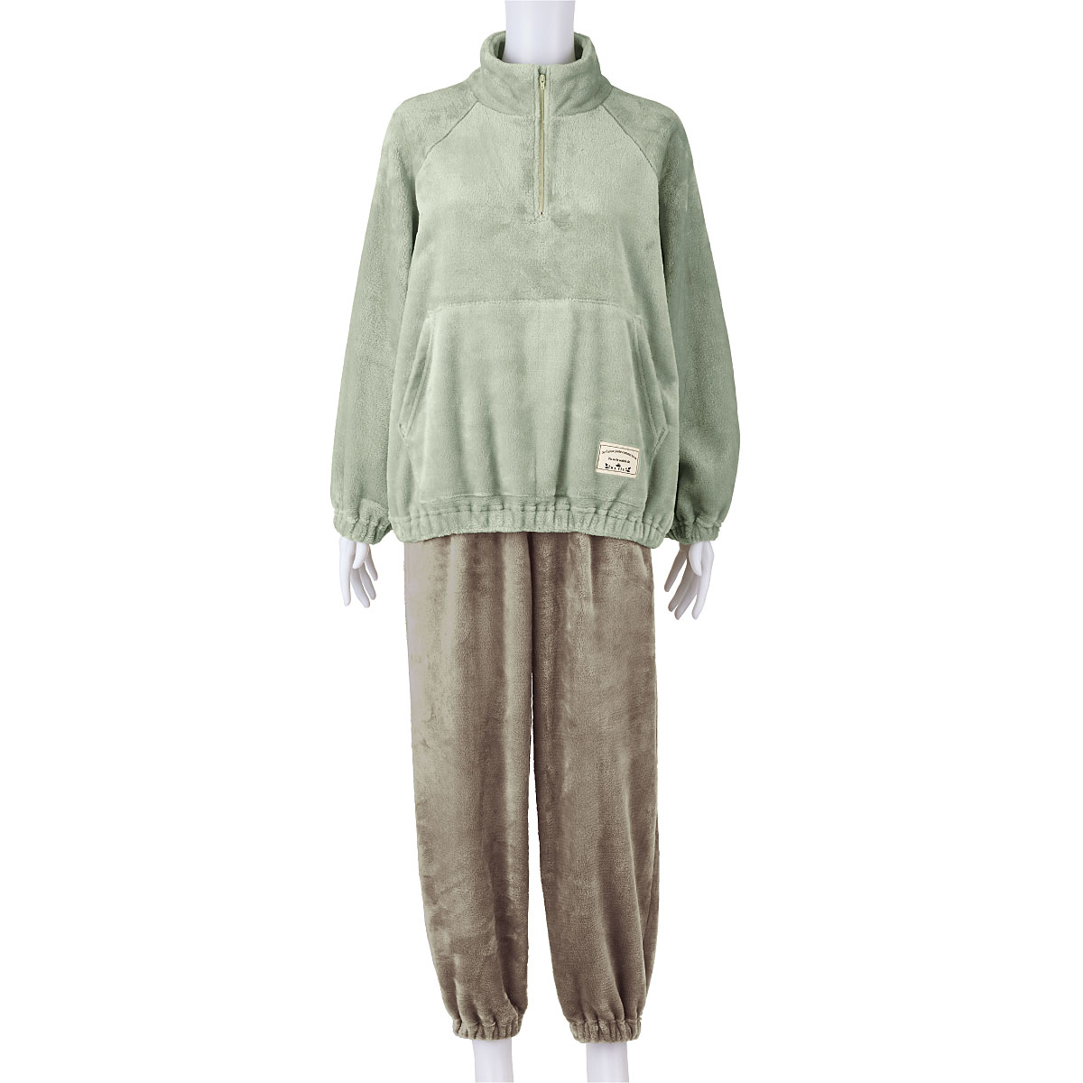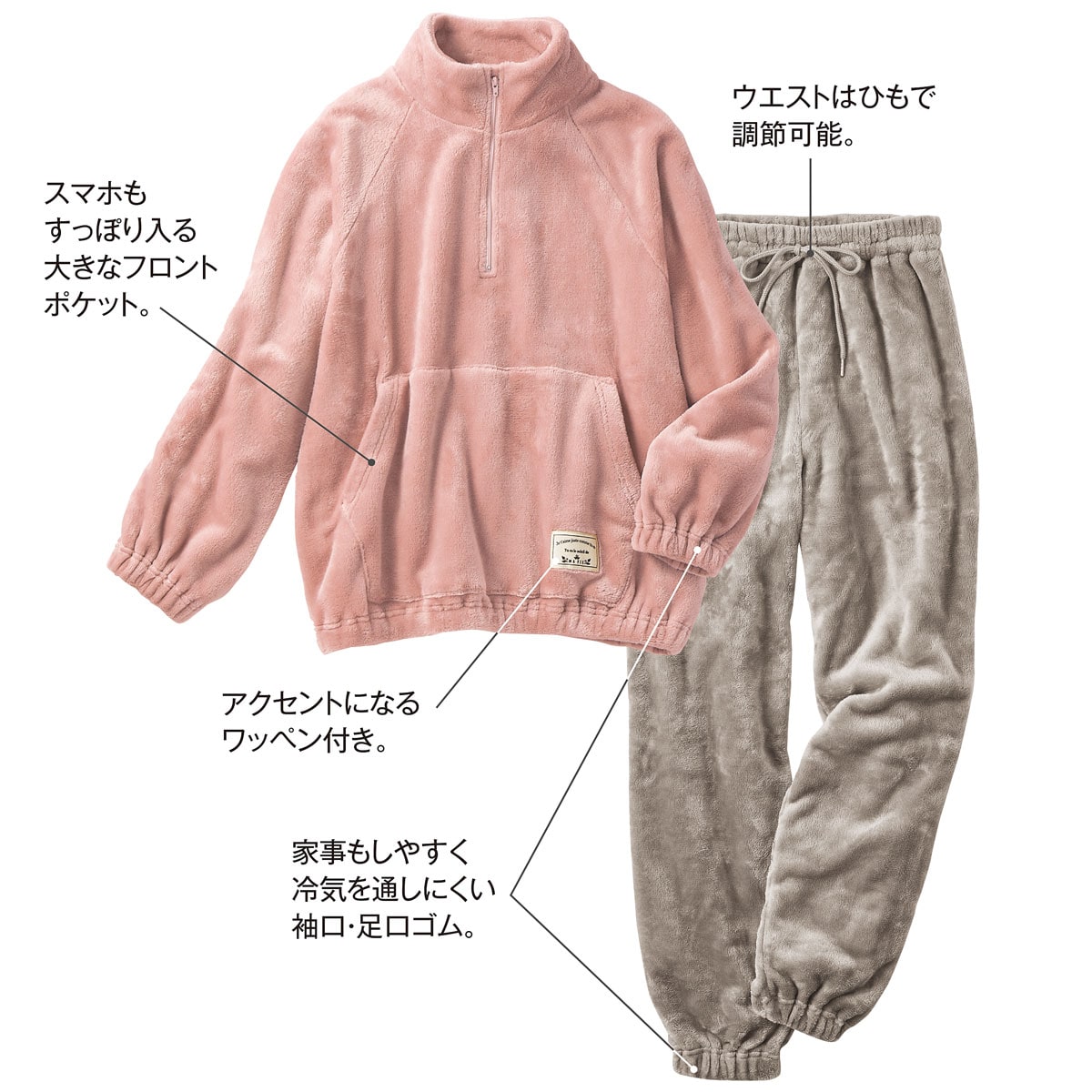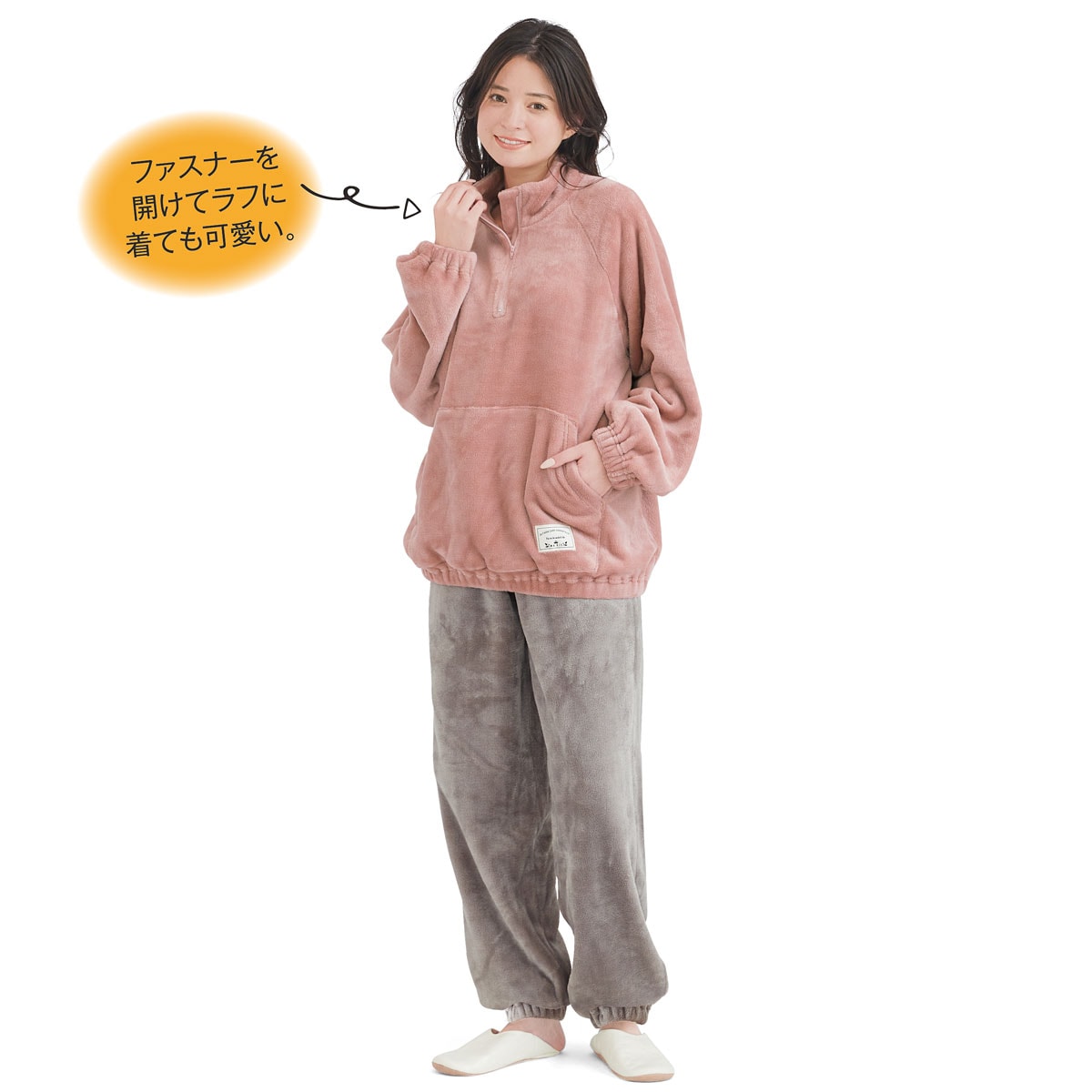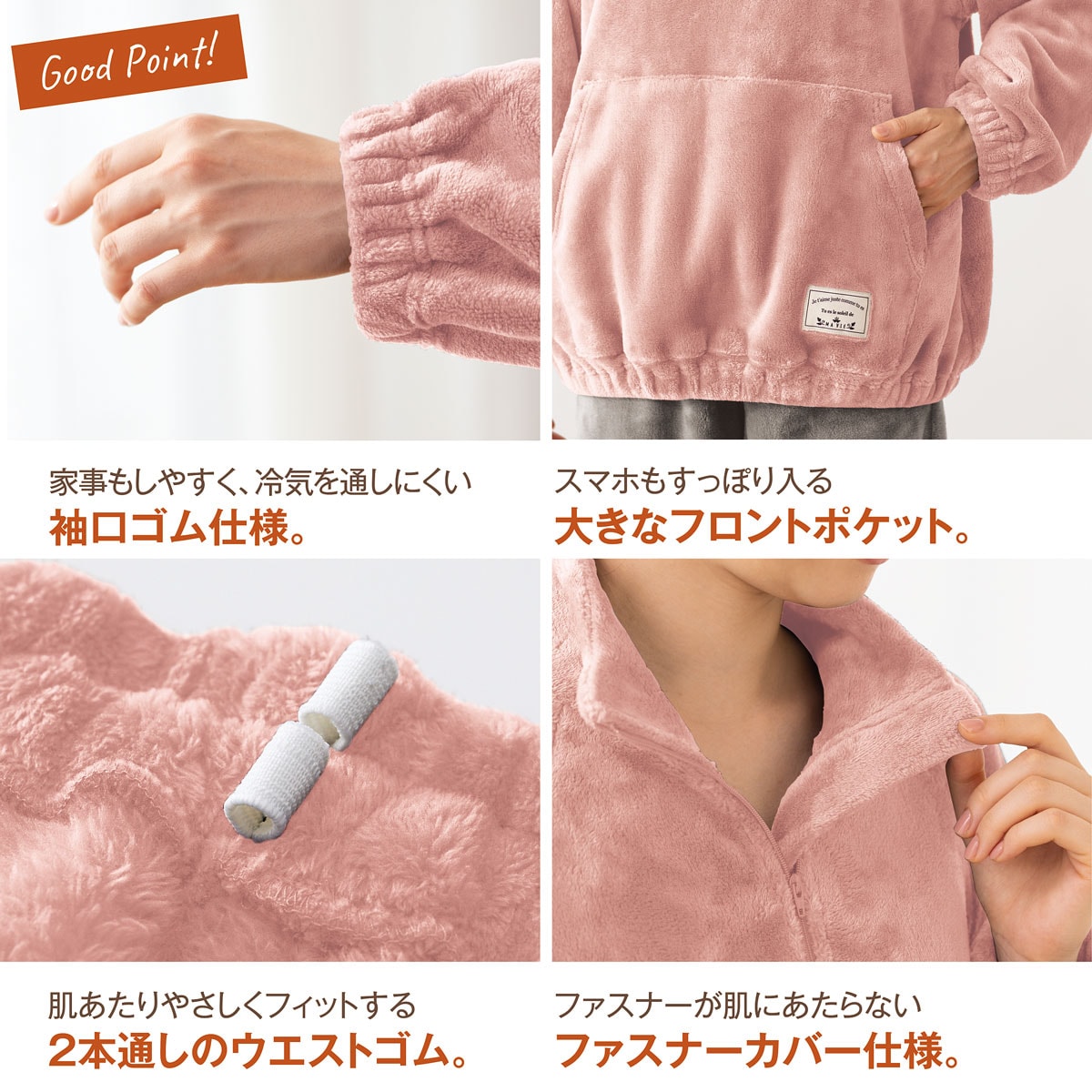 もふもふ、ふわふわとした密度の高い両面起毛フリース素材で、毛並みが細かく手触りがとてもなめらか。ボリュームがあるのに洗濯後も乾きやすく、便利です。スマホも入る大きなフロントポケット、家事もしやすく冷気も通しにくい袖口ゴム仕様、肌当たり優しくフィットする2本通しのウエストゴム、ファスナーが肌に当たらないファスナーカバーなど、着る人のことを考えた工夫がいっぱい。ふんわりあたたかな空気に包まれる心地良さをお楽しみください。