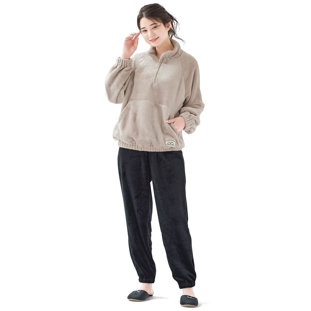 ベージュ(パンツ:ブラック) (1)アクセントになるワッペン付き。(2)家事もしやすく冷気を通しにくい袖口・足口ゴム。