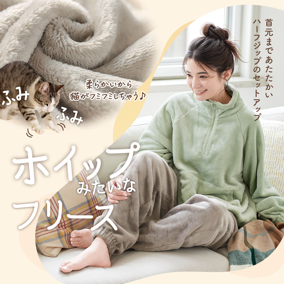 とろけるような肌ざわりにうっとり、ふんわりあたたかホイップフリースのルームウェア。首元から足先まであたたかなだけでなく、ゆったりラクで動きやすいから、一日中快適に過ごせます。