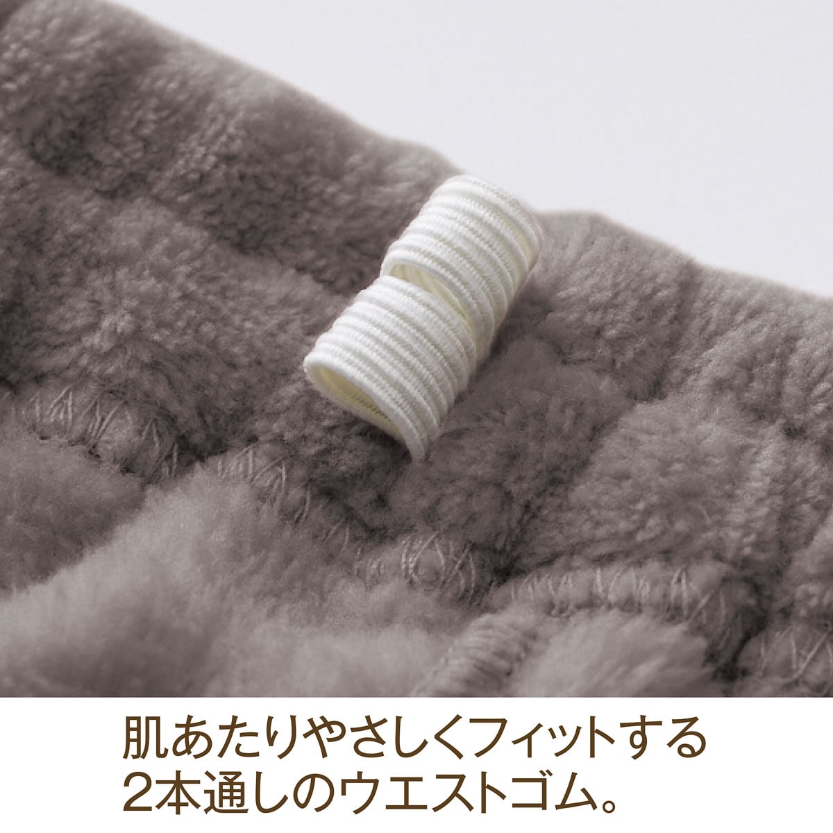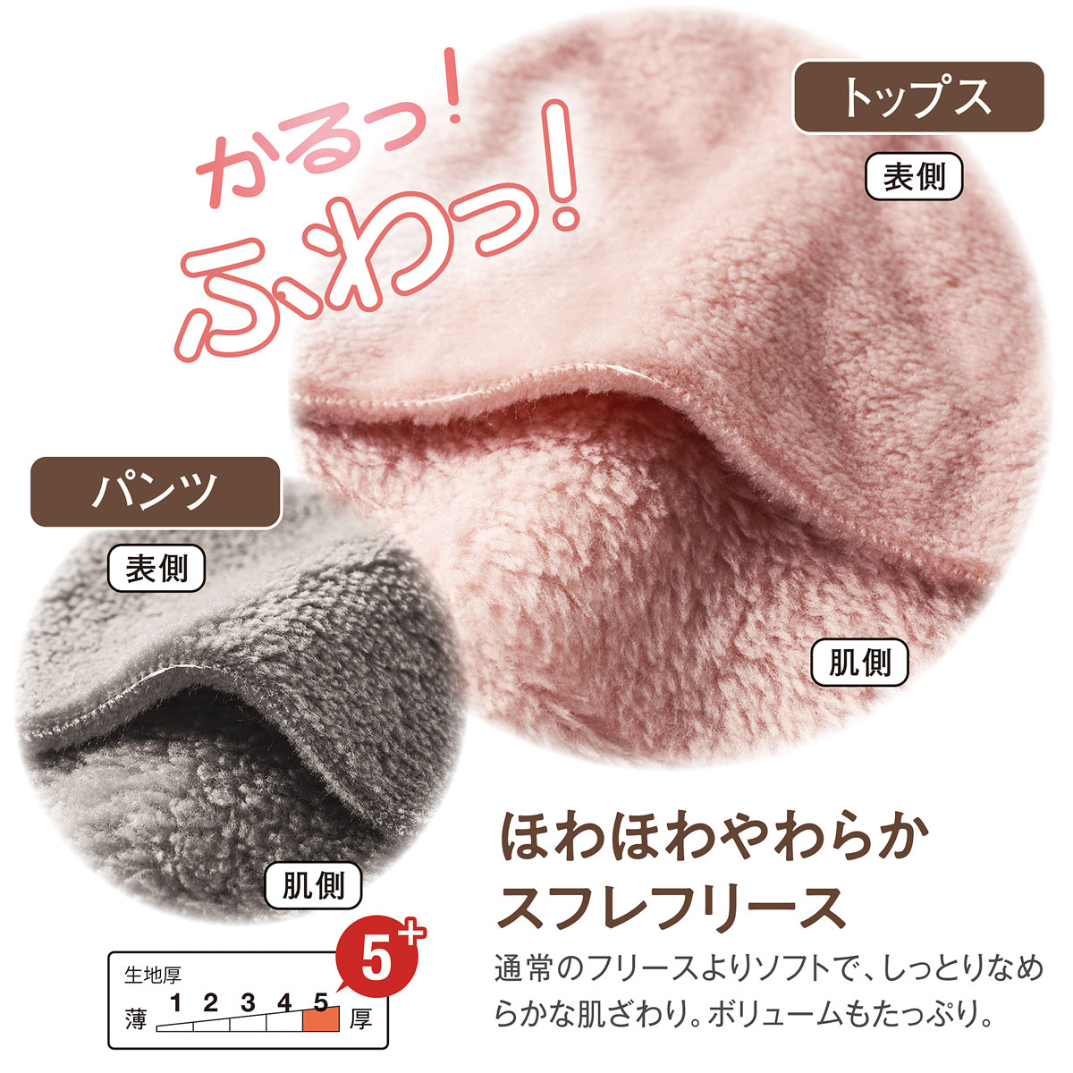 かるっ!ふわ!ソフトでしっとりなめらかな肌ざわりのフリース素材のパジャマ。トップスは、ニット見えするケーブル柄、パンツは無地のセットです。トップスの袖切り替え部分に入れた配色のラインがアクセント。袖口や足口は、ゴムを入れて冷気を通しにくい仕様に。パンツのウエストは、2本通しのゴム使いで、窮屈感を軽減し優しくフィットします。アウターライクなデザインだから、パジャマとしてだけでなく、おうち着としても使えます。大きいサイズも展開(M~6L)