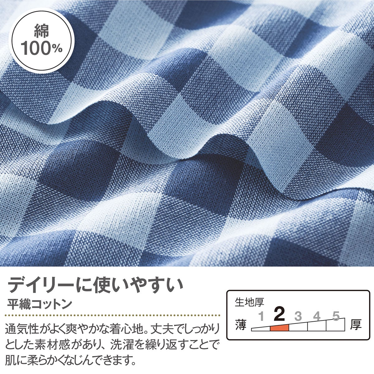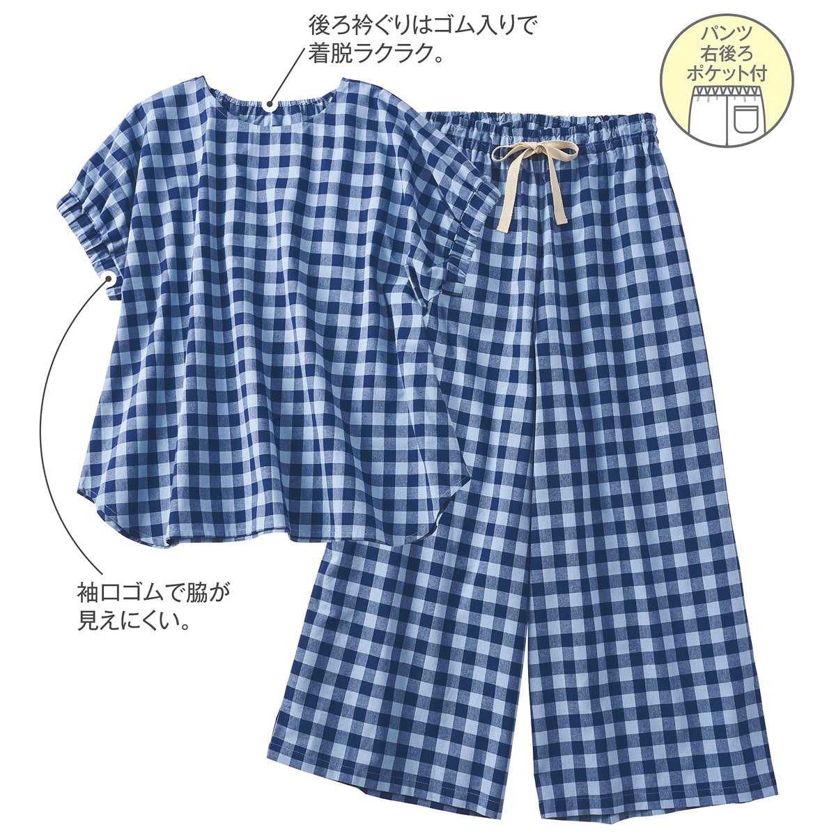ふわり、風が吹き抜ける平織コットン素材のルームウェア。丈夫でしっかりとした素材感があり、洗濯を繰り返すことで肌に柔らかくなじんできます。トップスの後ろ衿ぐりはゴム入りで着脱ラクラク、袖口にゴムが入っているから脇が見えにくいのが嬉しいポイント。体型カバーが叶うゆったりシルエットで、リラックスしながら簡単おしゃれを楽しめます。パンツに後ろポケット付き。ウエストゴム取り替えOK。大きいサイズまで展開(M~5L)。
