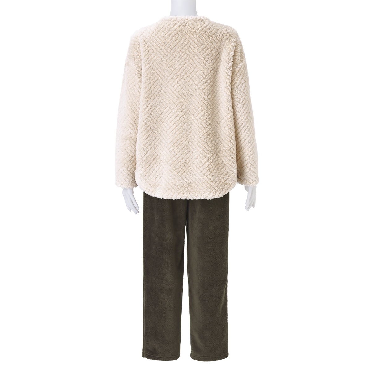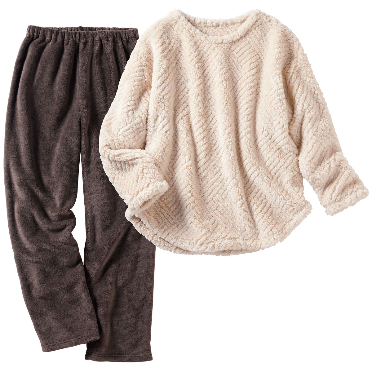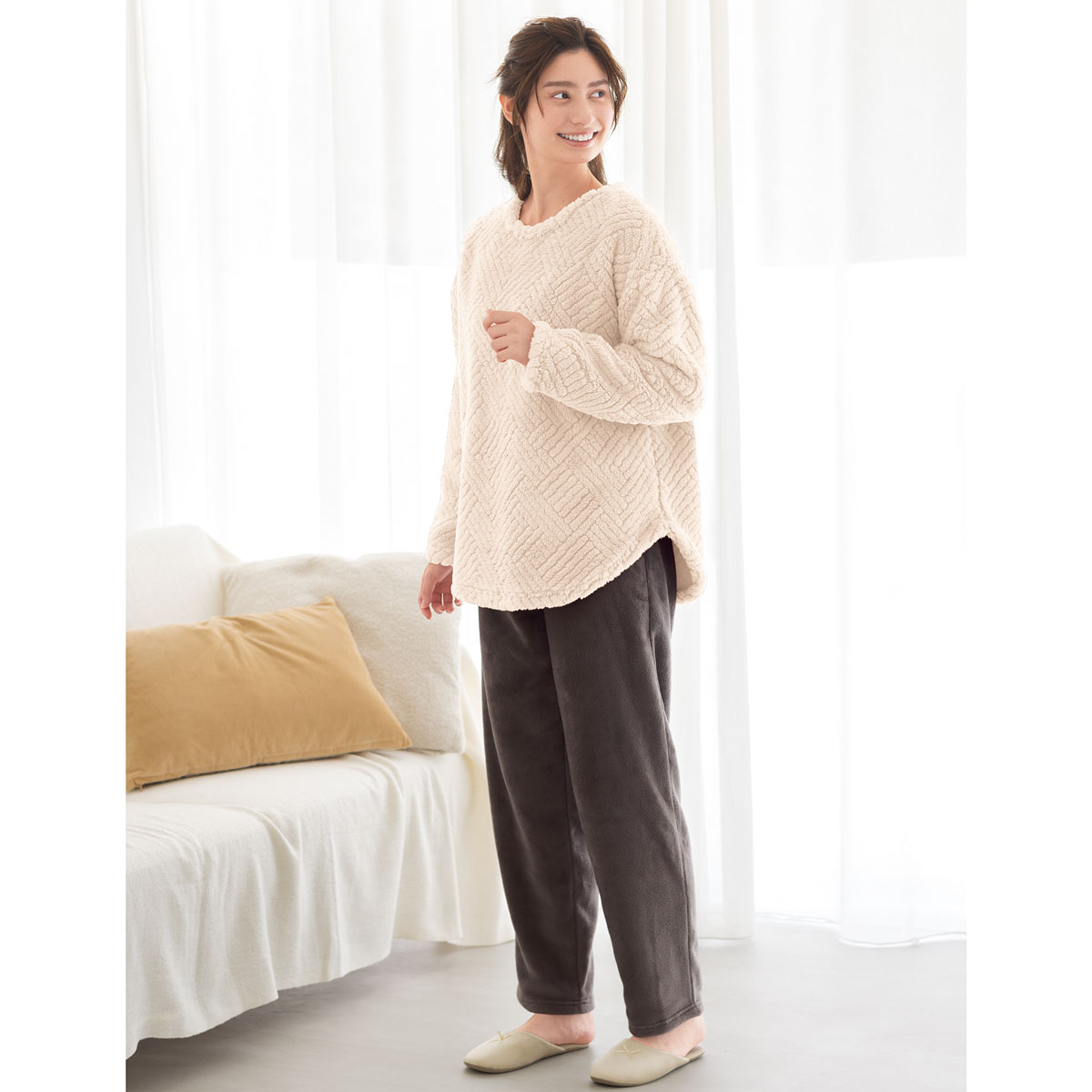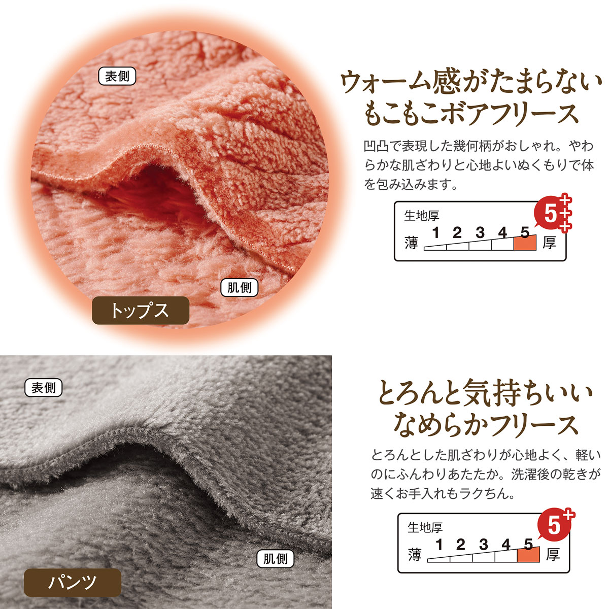 やわらかな肌ざわりと心地よいぬくもりで体を包み込みます♪ トップスは凹凸感のあるボアフリース、パンツはとろんと滑らかな肌触りのフリース素材。