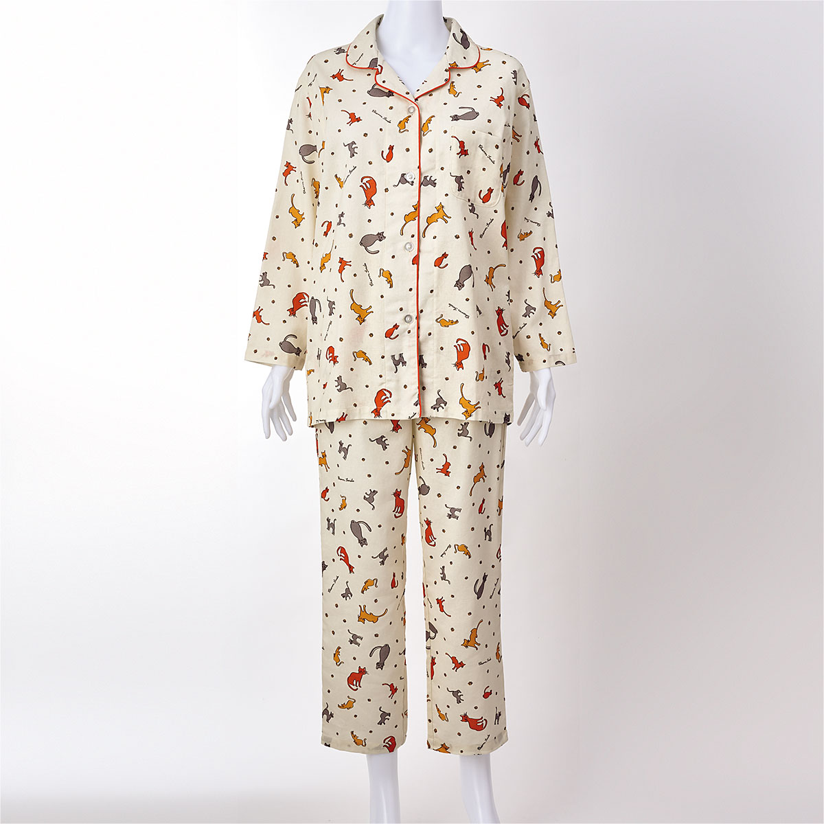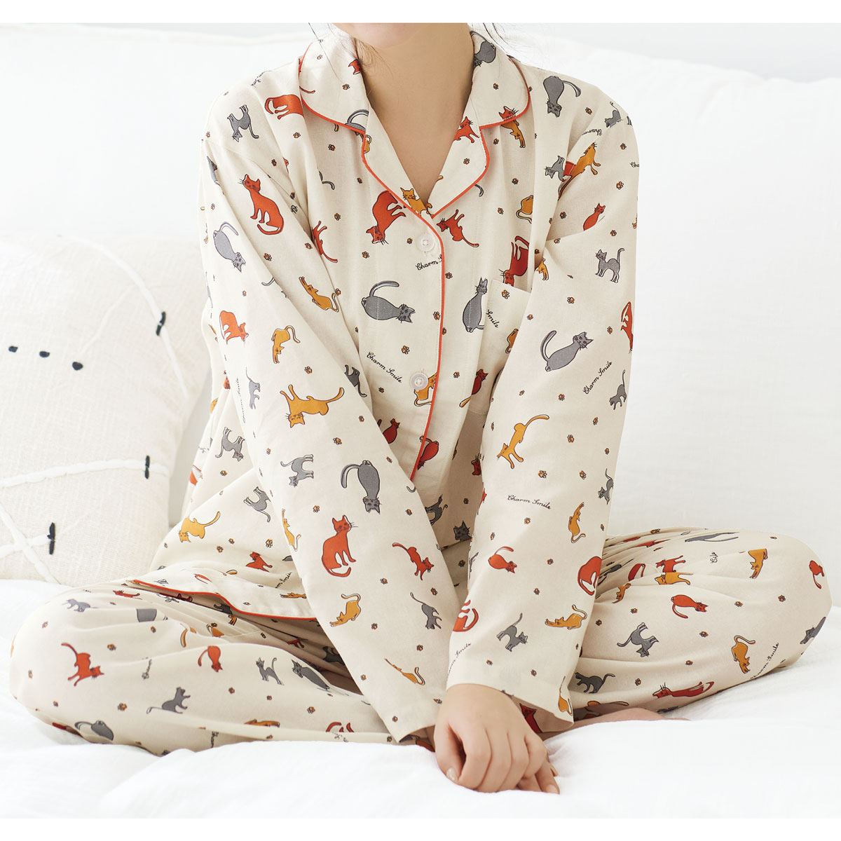 可愛いねこちゃん柄プリントで気分も上がる♪ハリ感と軽やかな着心地でロングシーズン使える綿100%ビエラシャツパジャマ