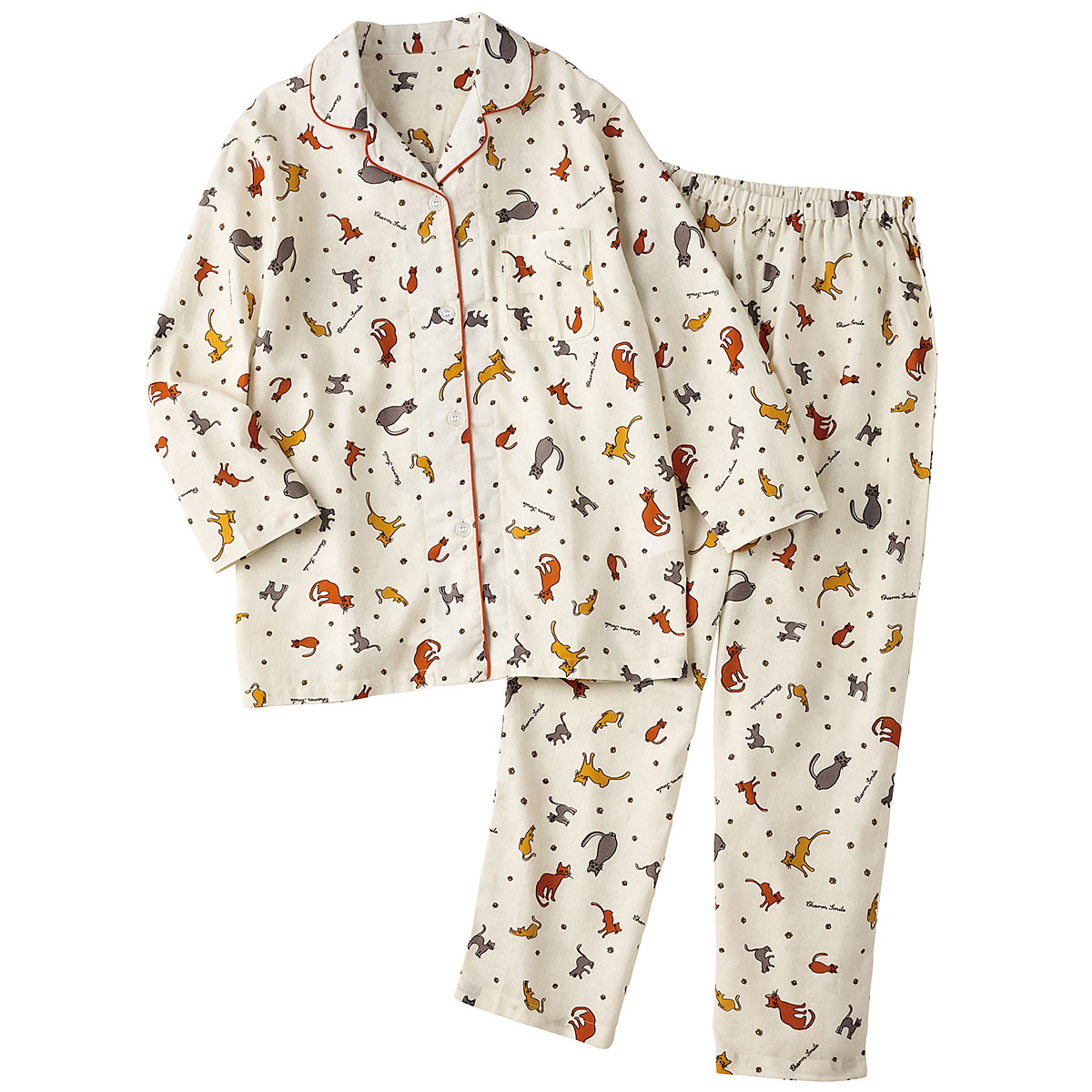 しっかりしたハリ感があり、さらっと軽やかな着心地の綿100%ビエラシャツパジャマ。コットンだから肌ざわりがよく、ロングシーズン活躍。可愛いねこちゃん柄プリントでおやすみタイムをハッピーに♪大きいサイズも展開(M~5L)