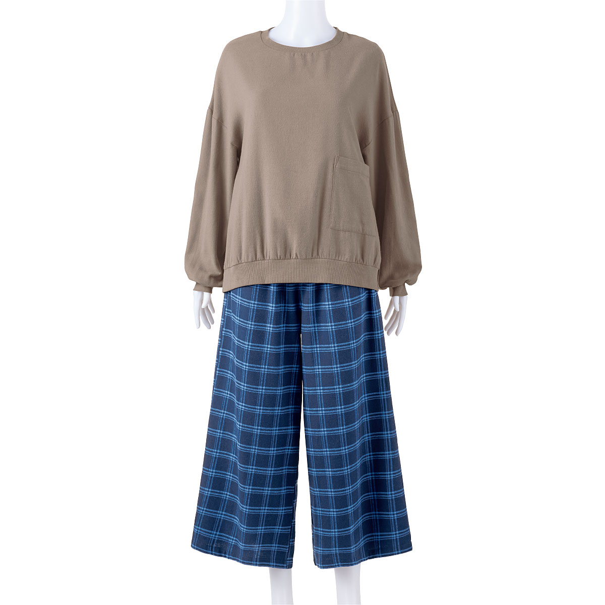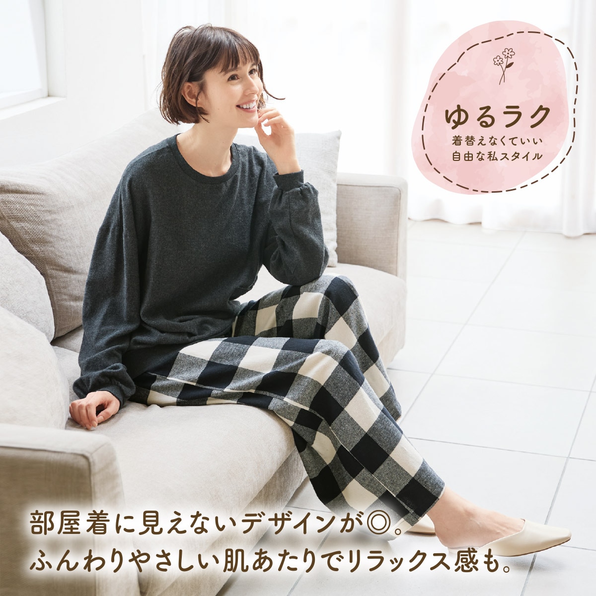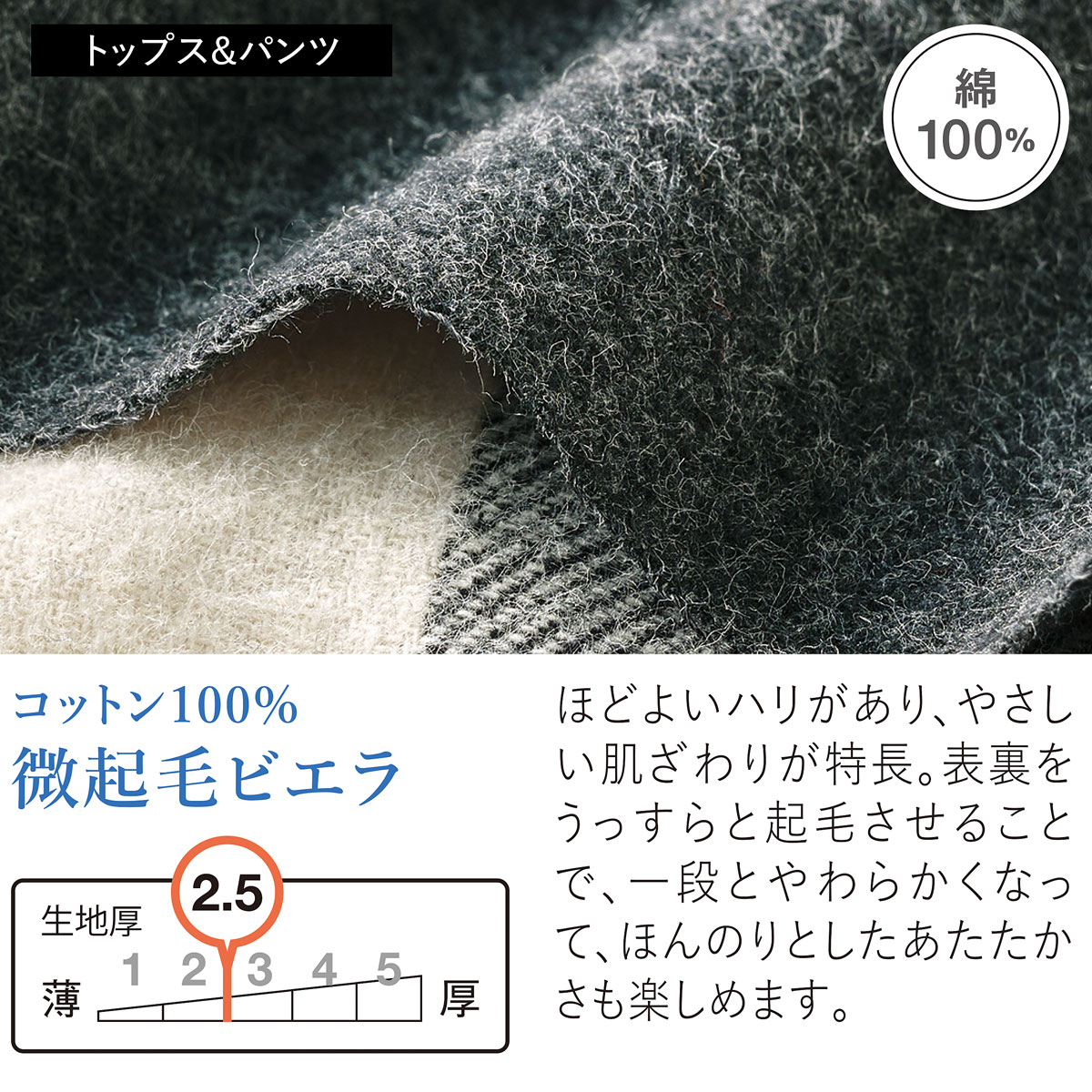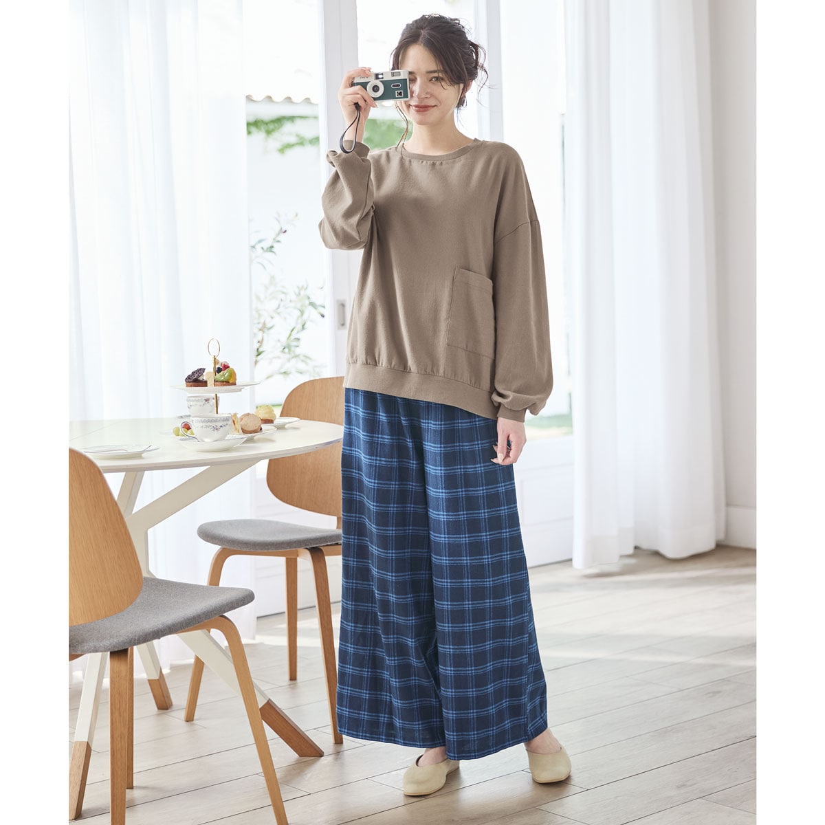 -ポイント-部屋着に見えない素材&デザイン。ふんわりやさしい肌あたりでリラックス感も。-デザイン-衿、袖口、前側の裾はリブ仕様で着脱簡単。パンツはワイドシルエットでゆったり。ウエストゴム2本通しでお腹を締め付けにくくやさしくフィット。トップス無地×パンツはナチュラル感のあるチェックやストライプ柄で部屋着っぽくない着こなしで人に見られても恥ずかしくない♪-素材特徴-ほどよいハリがありやさしい肌触り。表をうっすら起毛させてあたたかみのある綿100%微起毛ビエラ。