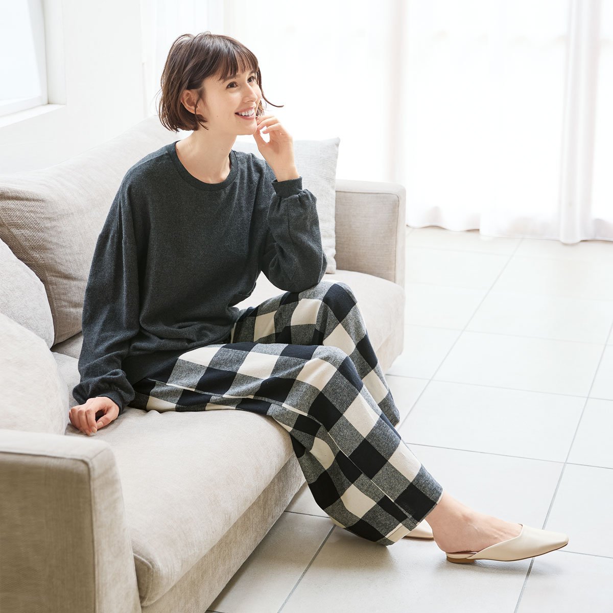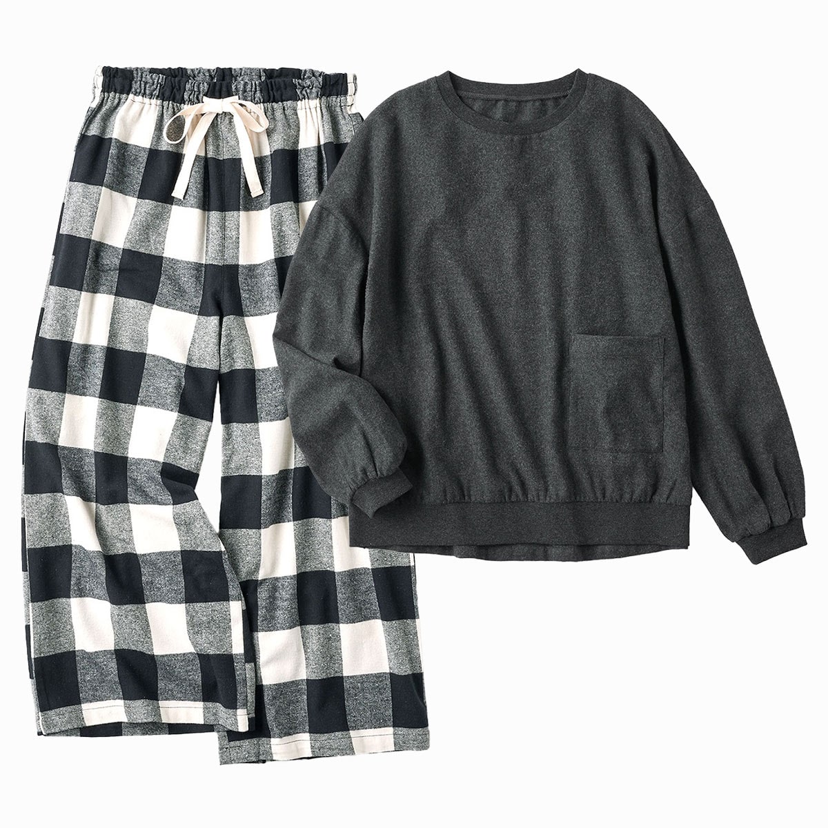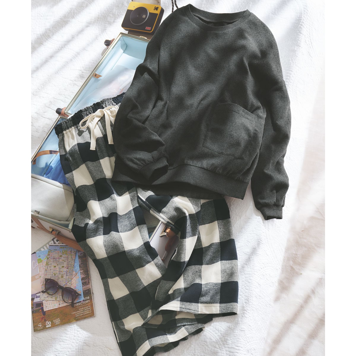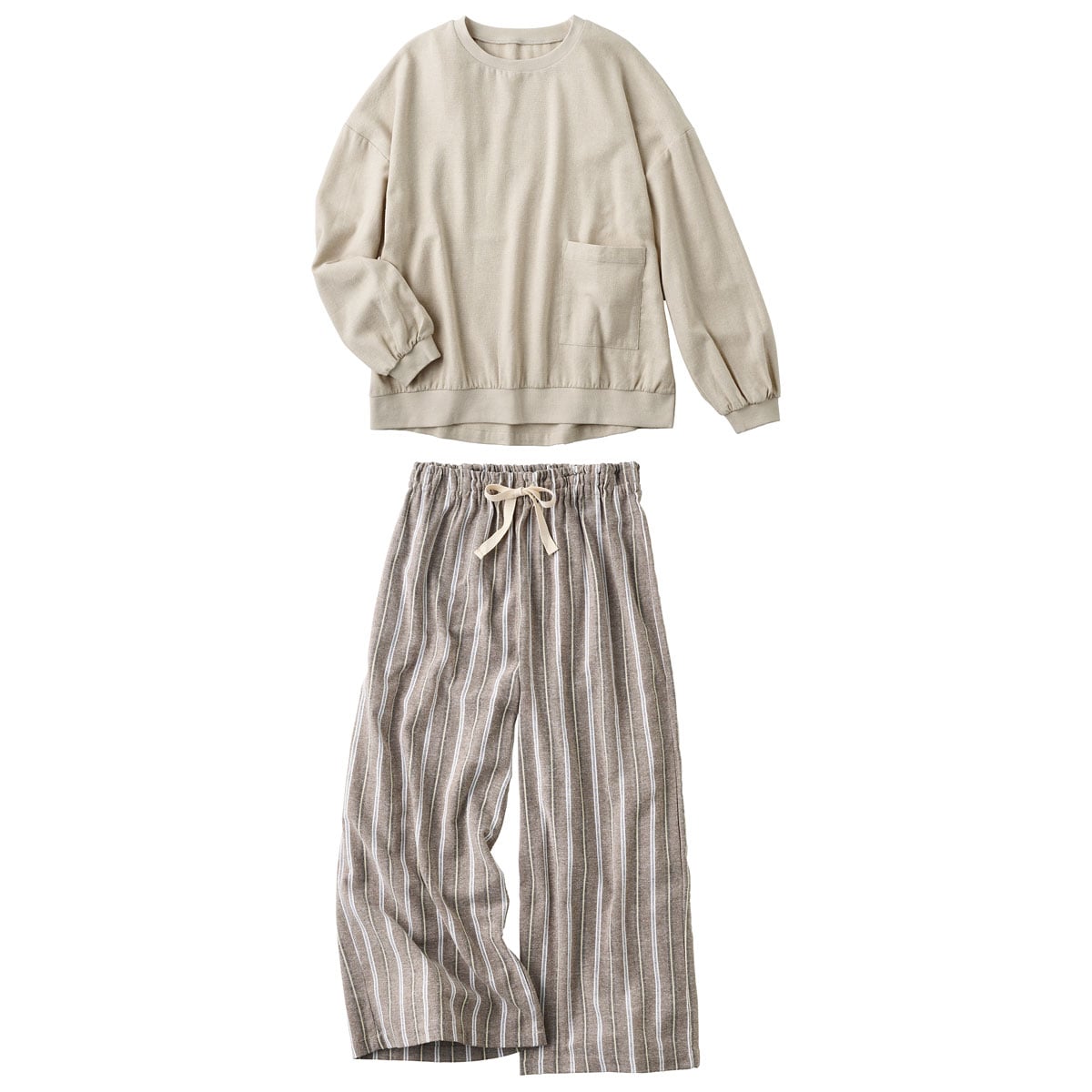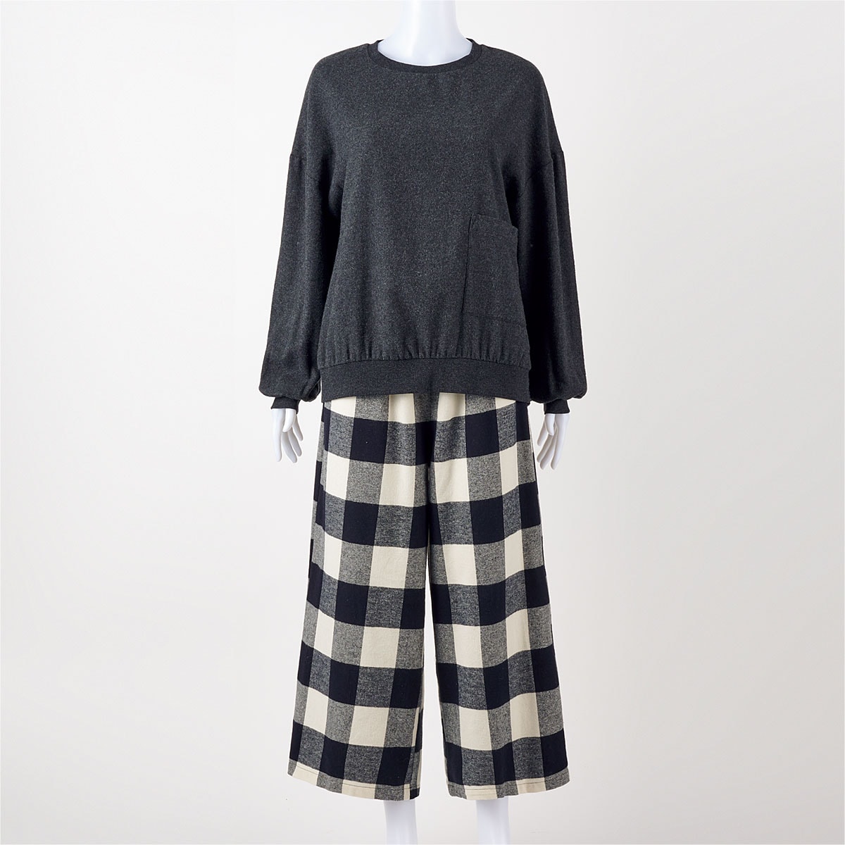 -ポイント-部屋着に見えない素材&デザイン。ふんわりやさしい肌あたりでリラックス感も。-デザイン-衿、袖口、前側の裾はリブ仕様で着脱簡単。パンツはワイドシルエットでゆったり。ウエストゴム2本通しでお腹を締め付けにくくやさしくフィット。トップス無地×パンツはナチュラル感のあるチェックやストライプ柄で部屋着っぽくない着こなしで人に見られても恥ずかしくない♪-素材特徴-ほどよいハリがありやさしい肌触り。表をうっすら起毛させてあたたかみのある綿100%微起毛ビエラ。