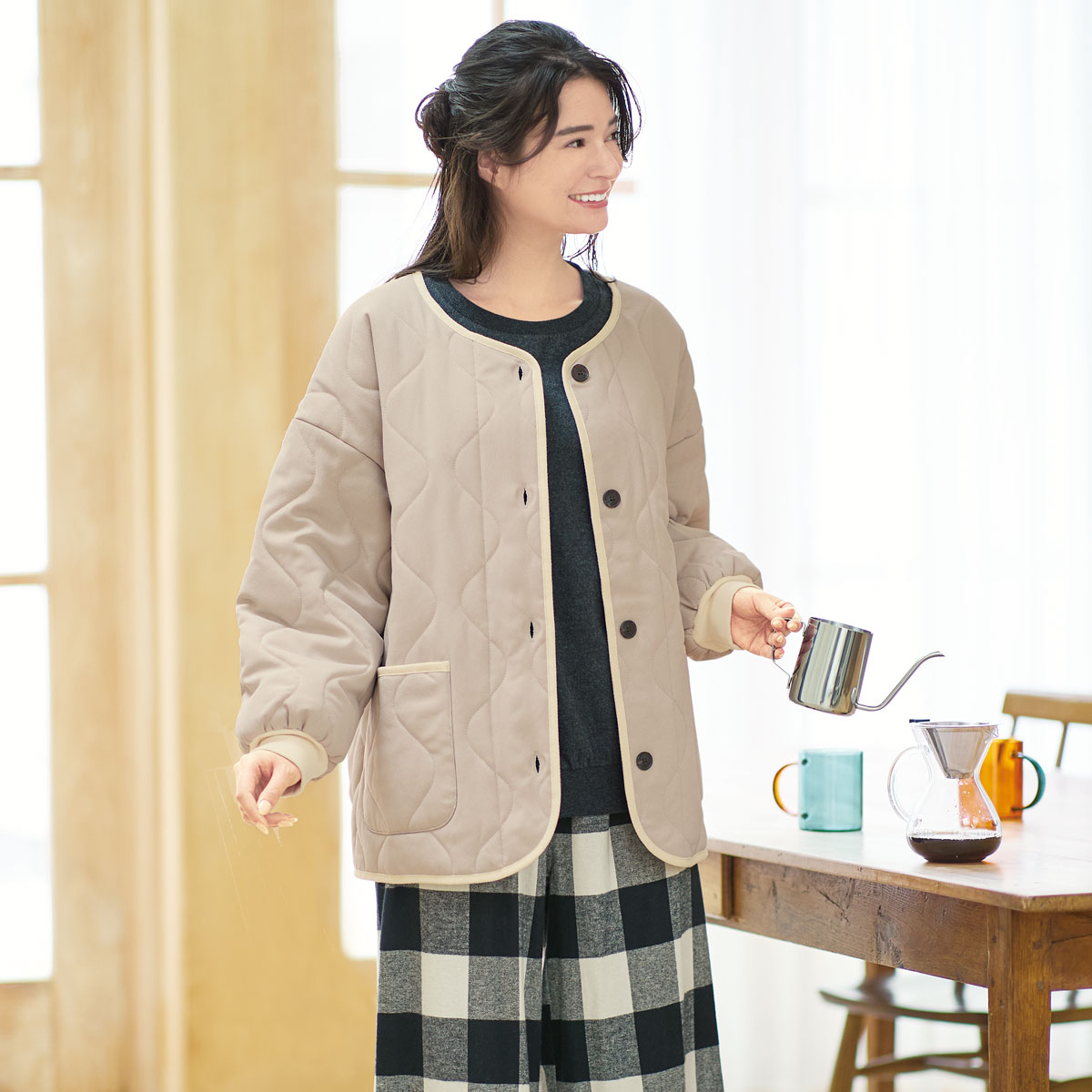 衿、袖口、前側の裾はリブ仕様で着脱簡単。