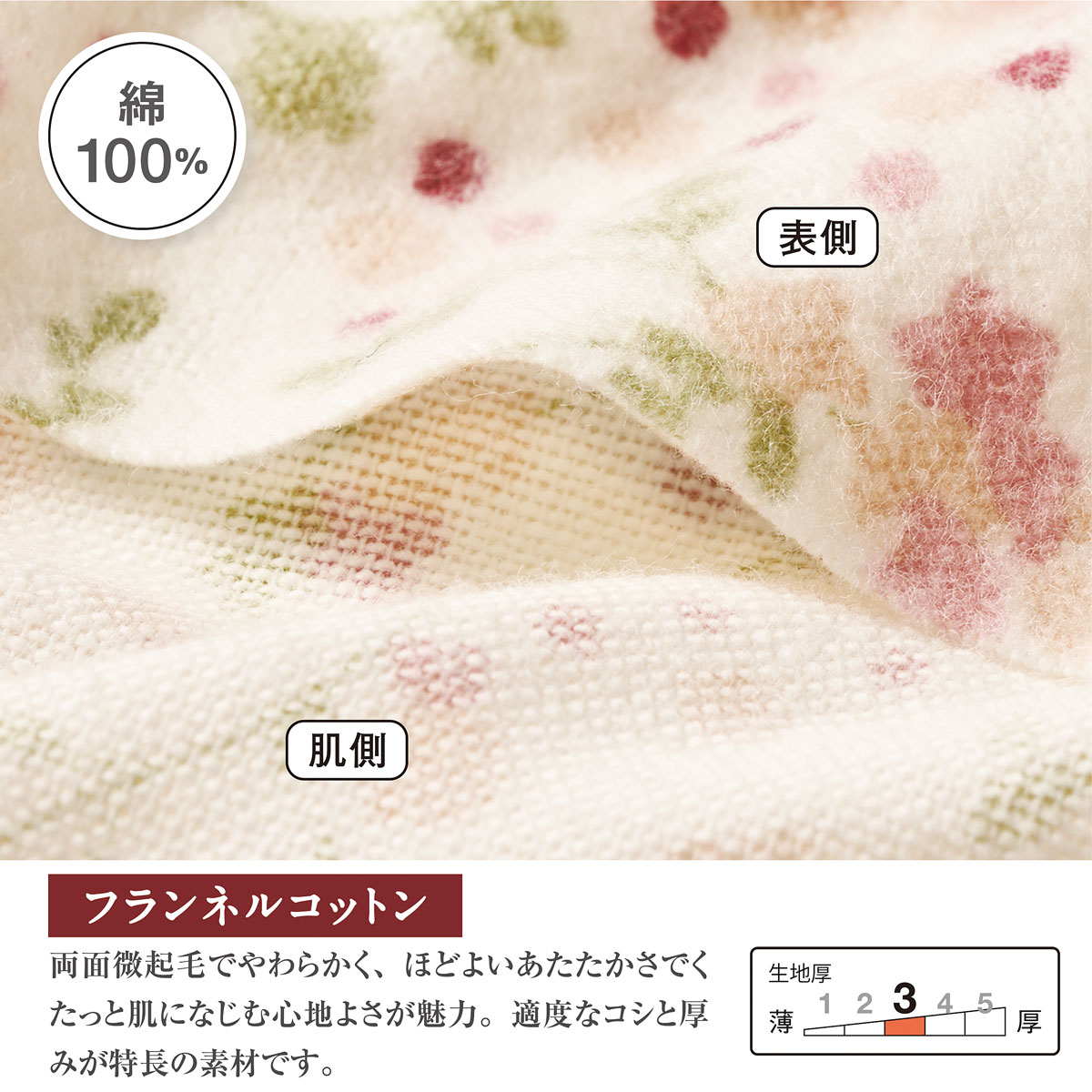 両面微起毛でやわらかく、ほどよいあたたかさでくたっと肌になじむ心地よさが魅力。適度なコシと厚みが特徴の綿100%フランネルコットン起毛。丸襟と上品な小花柄がやさしい印象。小柄な方にもぴったりなプチサイズもご用意しました。(MP・LP)ウエストゴムはお腹を締め付けにくく、ねじれにくいソフティゴムを使用。ゴム取替口もあります。大きいサイズも展開(~3L)。