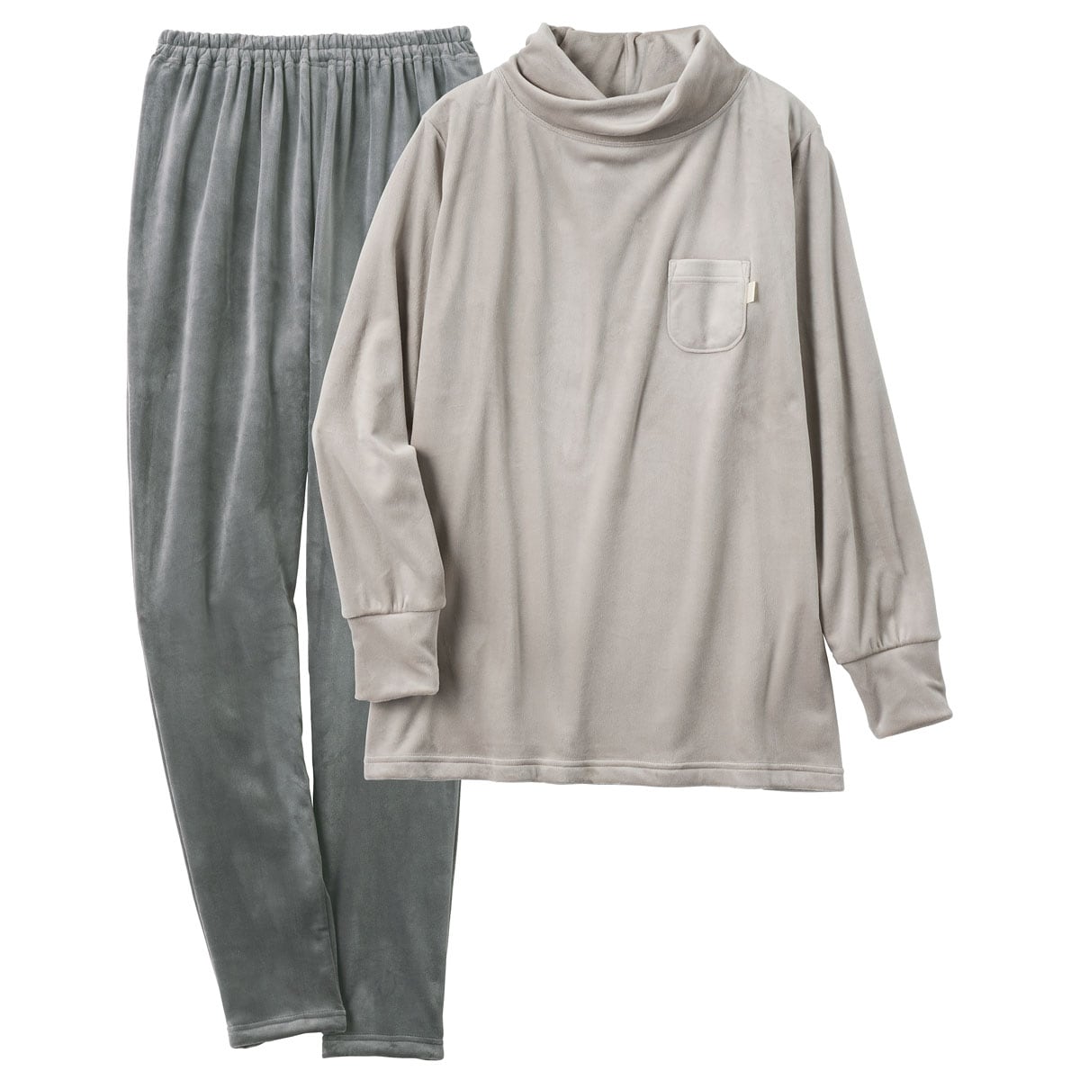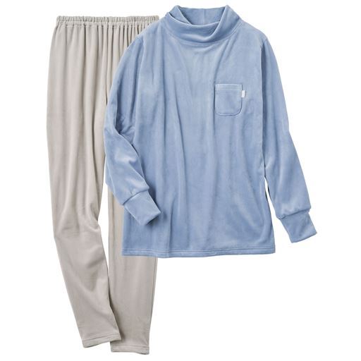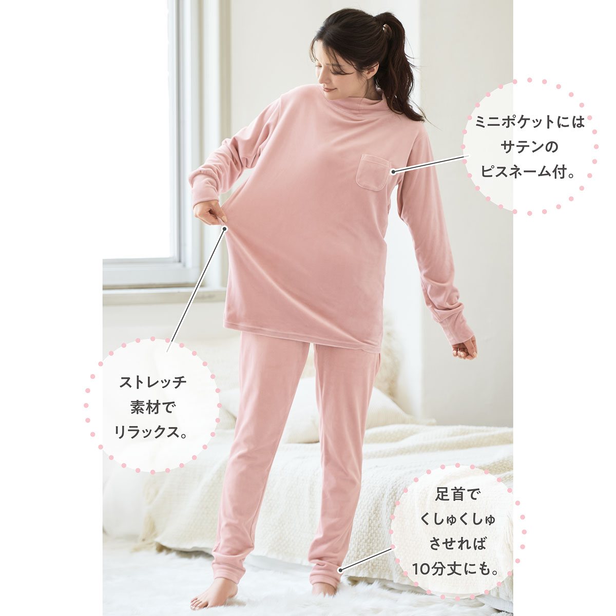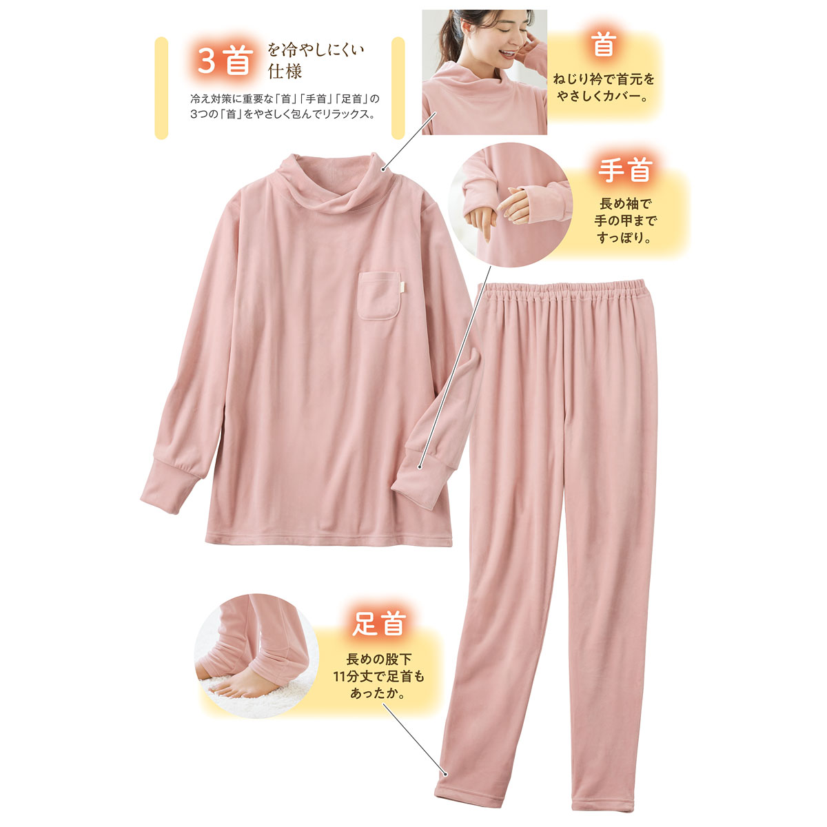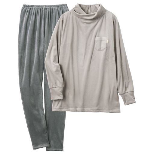 -デザイン-・ねじり衿で首元をやさしくカバー。・長め袖で手の甲まですっぽり。・長めの股下11分丈で足首もあったか。足首でくしゅくしゅさせれば10分丈にも。・ミニポケットにはサテンのピスネーム付。-素材特徴-高密度で細かい毛並みのクリームベロア調フリース。ポリウレタン混だから、もちっとやわらかい肌あたりが気持ちいい。ぐーんと伸びて寝返りもラク。両面起毛のぬくもり感もあり、表面にツヤがあるベロア調の表情もリッチ。