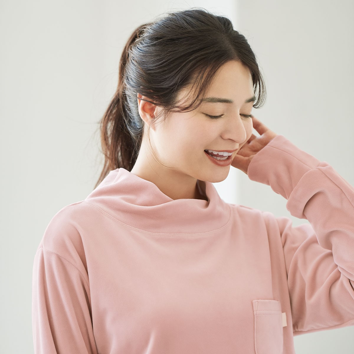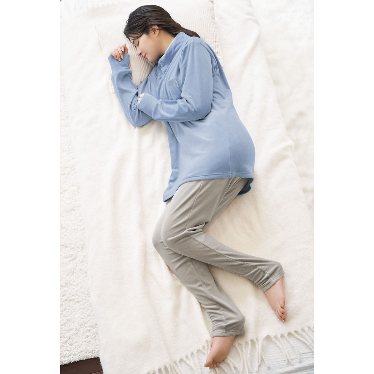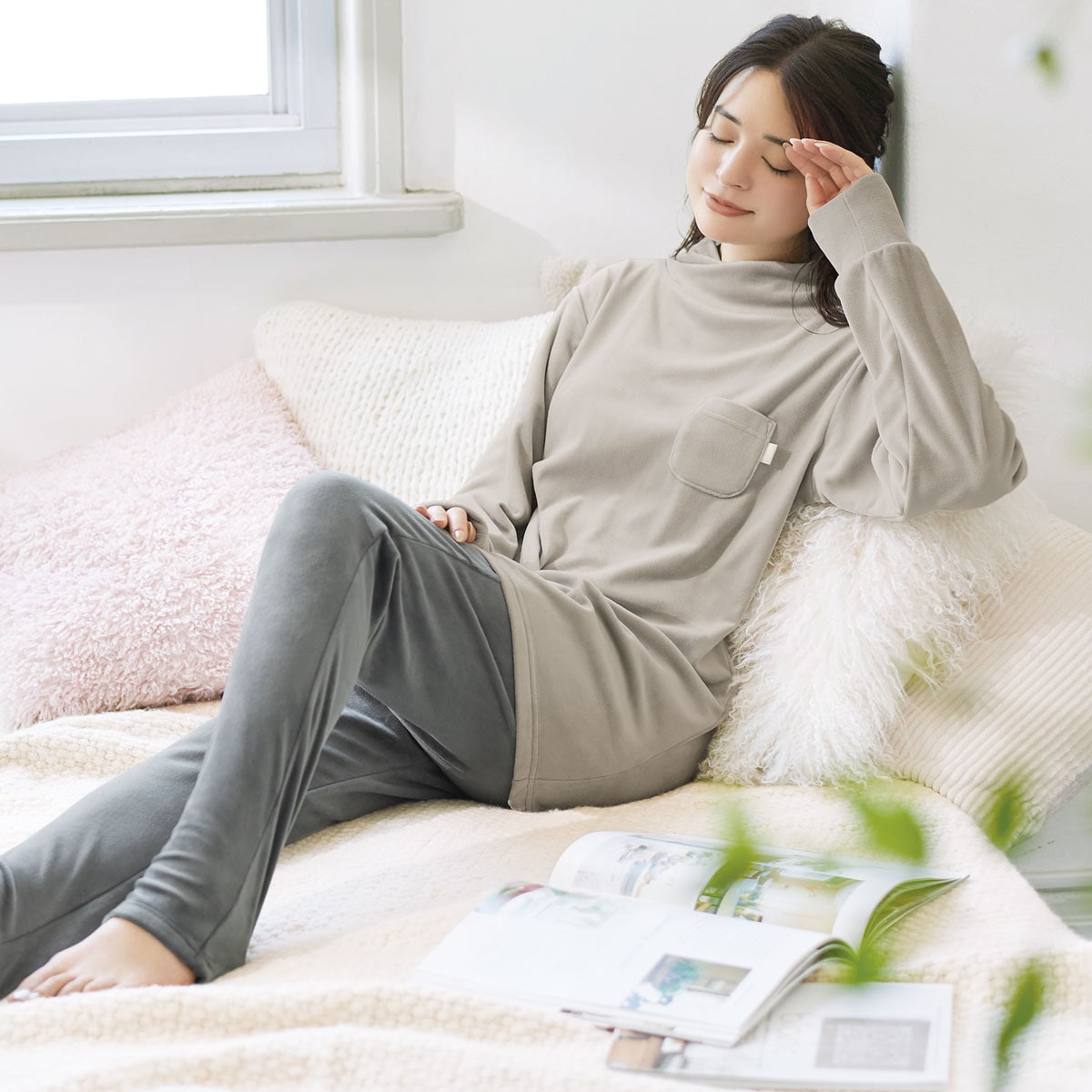 -デザイン-・ねじり衿で首元をやさしくカバー。・長め袖で手の甲まですっぽり。・長めの股下11分丈で足首もあったか。足首でくしゅくしゅさせれば10分丈にも。・ミニポケットにはサテンのピスネーム付。-素材特徴-高密度で細かい毛並みのクリームベロア調フリース。ポリウレタン混だから、もちっとやわらかい肌あたりが気持ちいい。ぐーんと伸びて寝返りもラク。両面起毛のぬくもり感もあり、表面にツヤがあるベロア調の表情もリッチ。