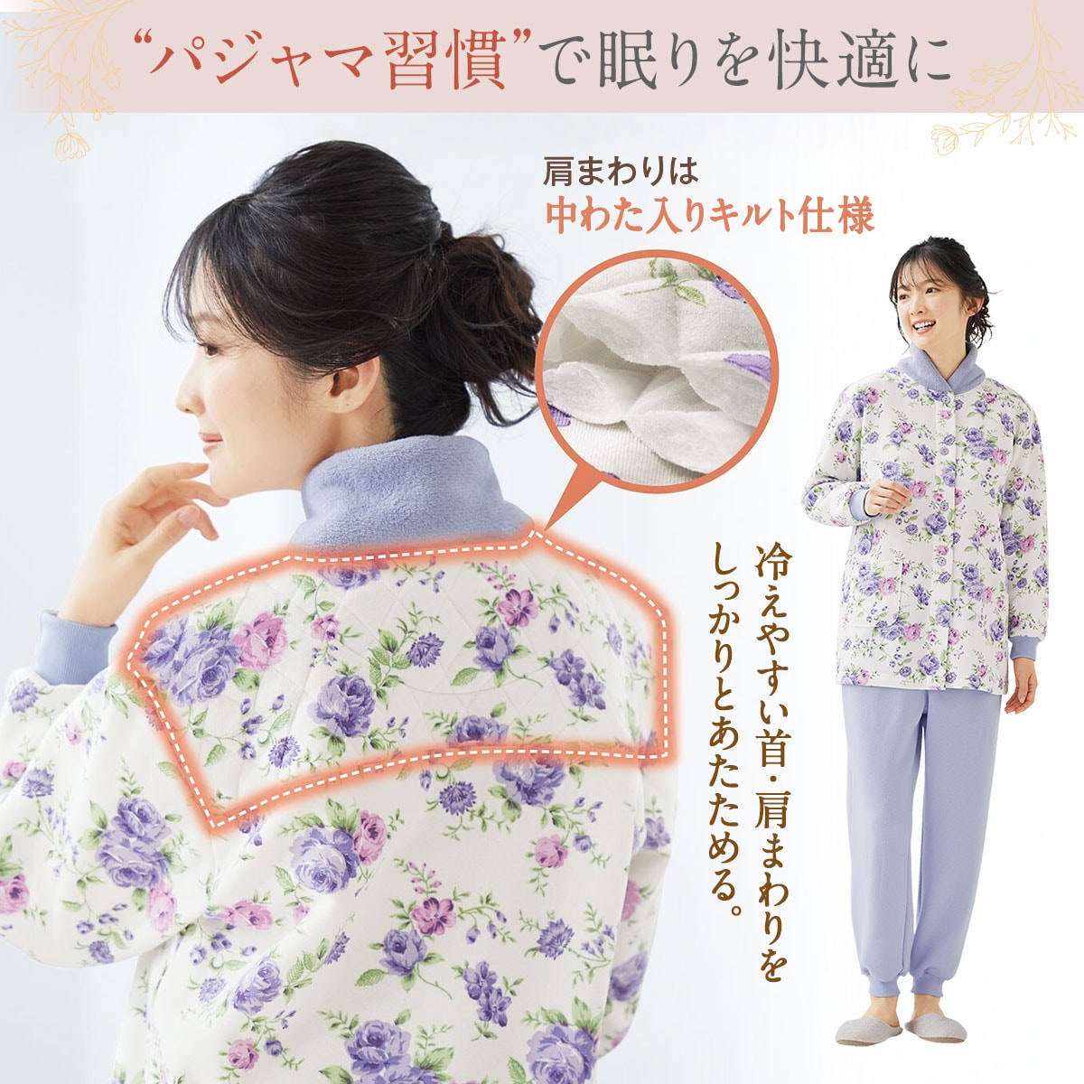 布団をかぶっていても首・肩まわりの冷えが気になる方におすすめ!首肩まわりが中わた入りキルト仕様になった裏起毛パジャマ。肩の前側から背中の上部にかけて中わた入りキルトであったか。また、裏側を起毛させているのであたたかく、厚みがあるのに軽い着心地です。やわらかくてあたたかみのあるフリース衿で首元もふっくらあたたか。足口・袖口リブで冷気もシャットアウト。つかみやすい大きめボタンの前開きタイプで着脱もラクちんです。花柄プリントが華やかなデザイン。小柄な方向けの小さめサイズもご用意(S~LL・MP・LP)