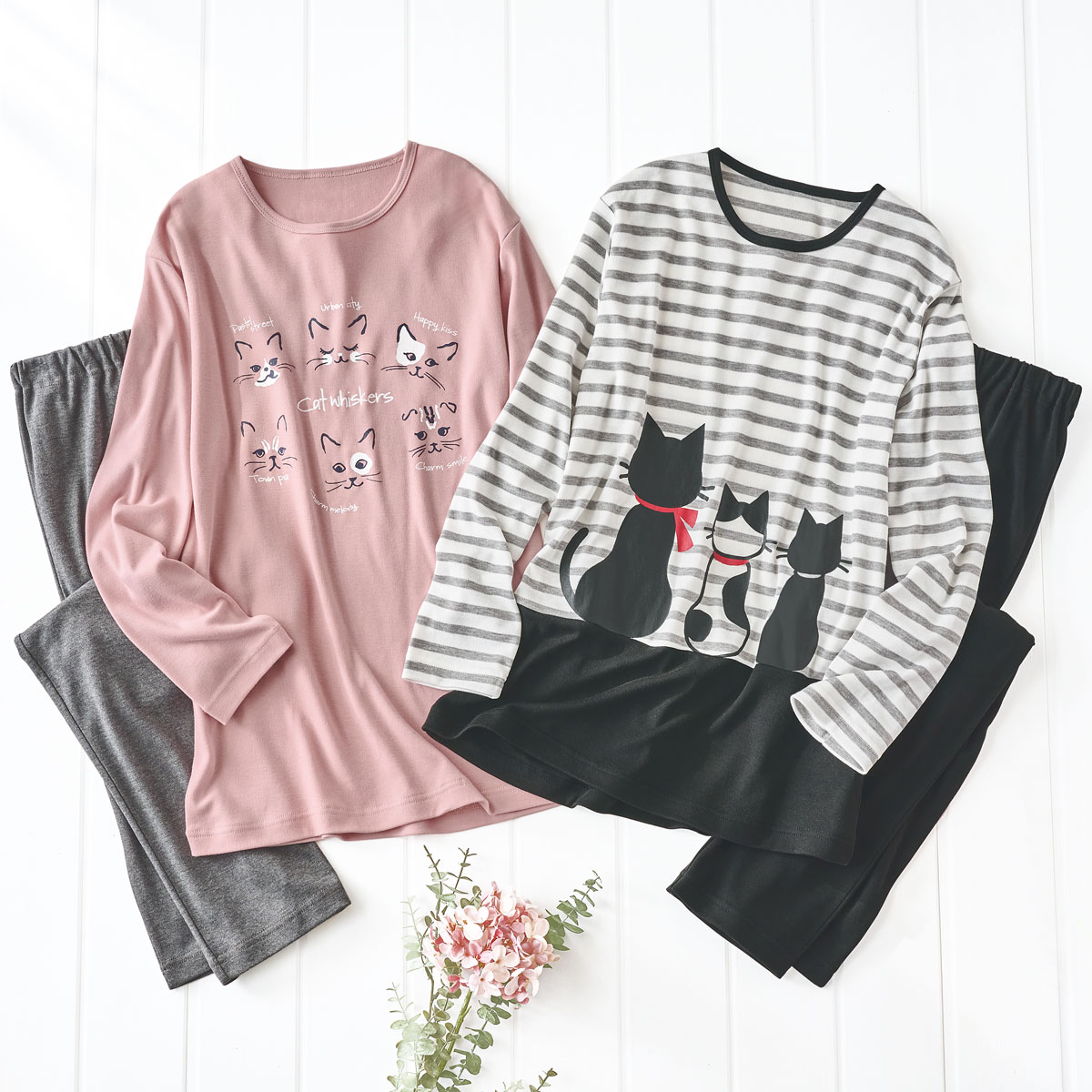 (左から)スモークピンク(パンツ:チャコールグレー)、ボーダー(パンツ:ブラック)
