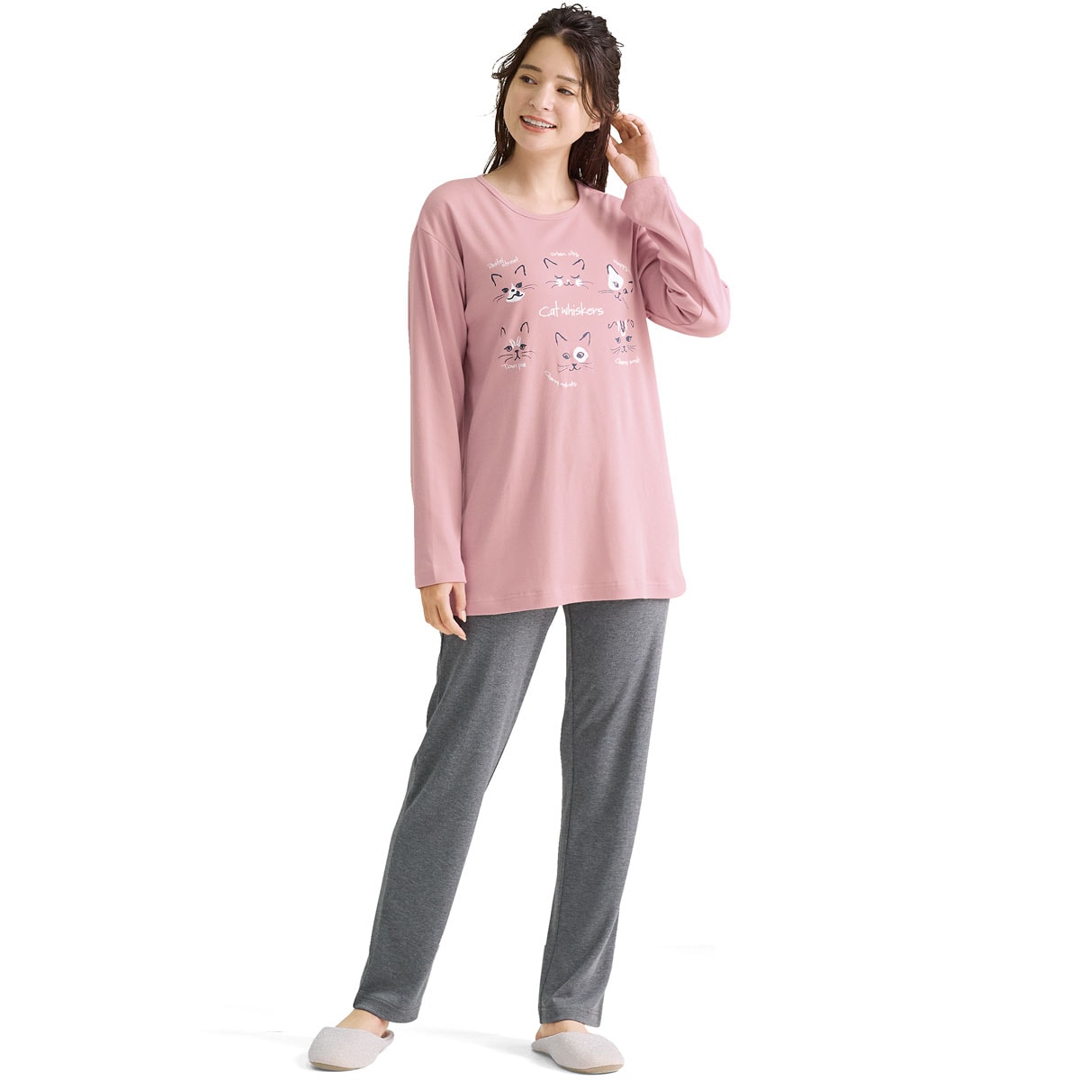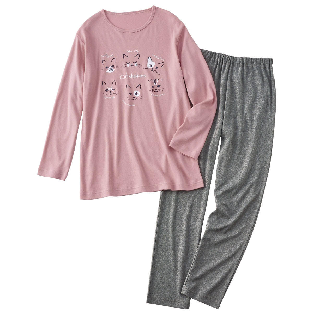 ネコ柄パジャマで、おうちでのリラックス時間をかわいく快適に♪なめらかな肌触りが特長のスムース素材。とろんと気持ちよく、伸び感もありラクな着心地で季節をまたいで長く活躍します。ウエストゴム取り替えOK!大きいサイズも展開(M~5L)