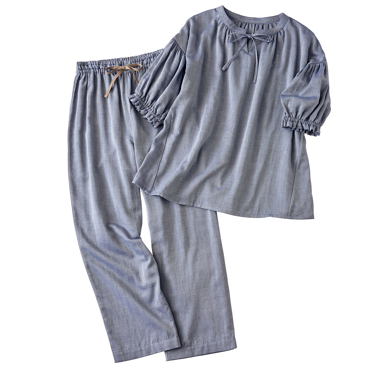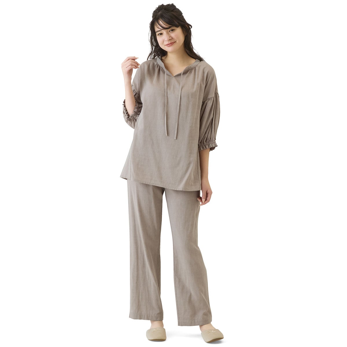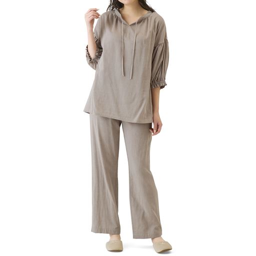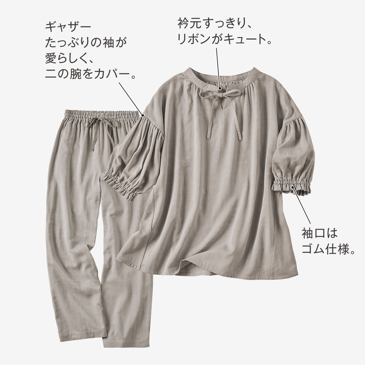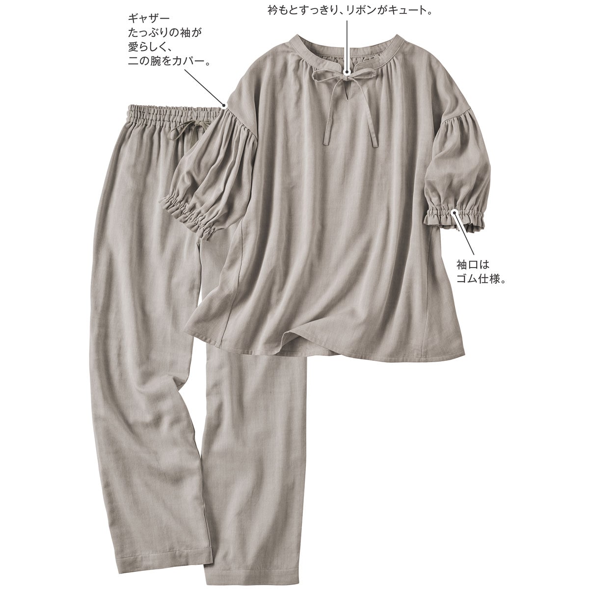 -ポイント-甘さ控えめなデザインでサラッとしなやかな心地よさを。-デザイン-衿元すっきりリボンが大人可愛い。お好みでたらしたり結んだりアレンジもOKウエストゴム2本通しでお腹を締め付けにくくやさしくフィット。ギャザーたっぷりの袖が愛らしく二の腕をカバー。-素材特徴-綿のナチュラルな風合いとやさしい肌あたりにレーヨンのしなやかさをプラス。シルクのようななめらかさで心地い肌触り。自然なドレープ感で上質感もあります。