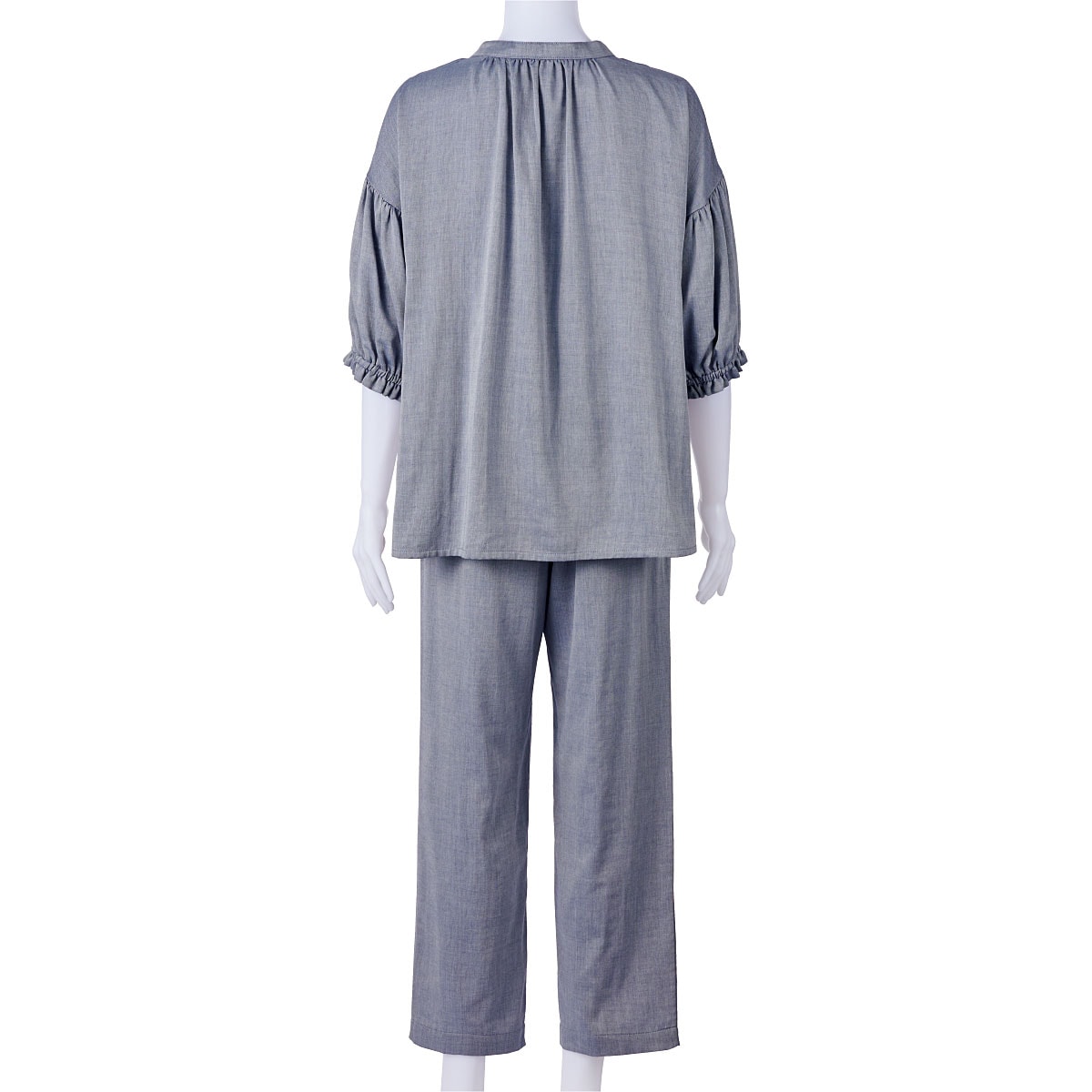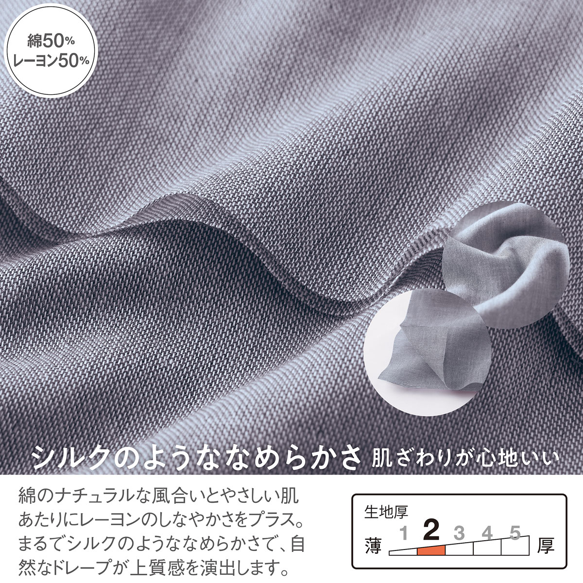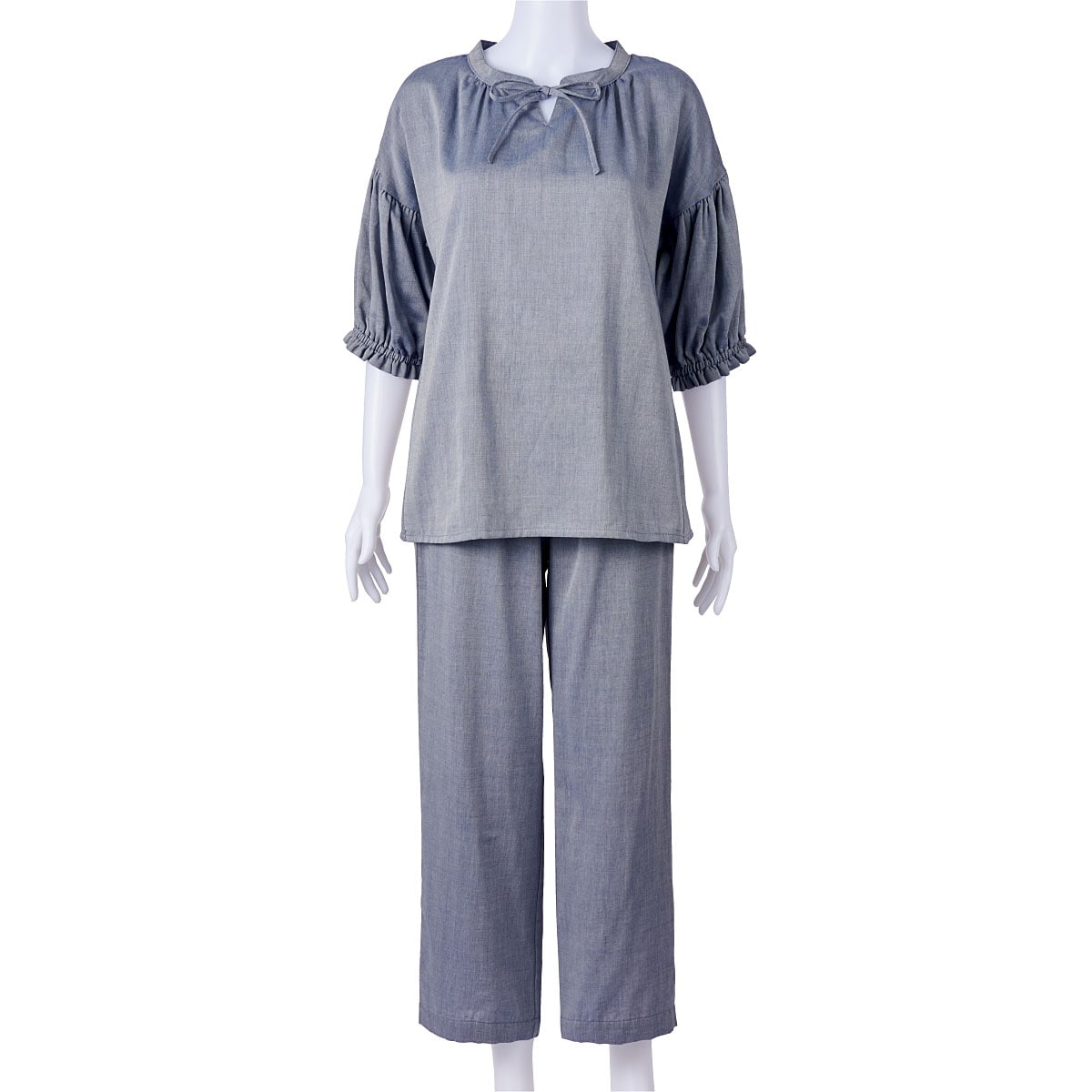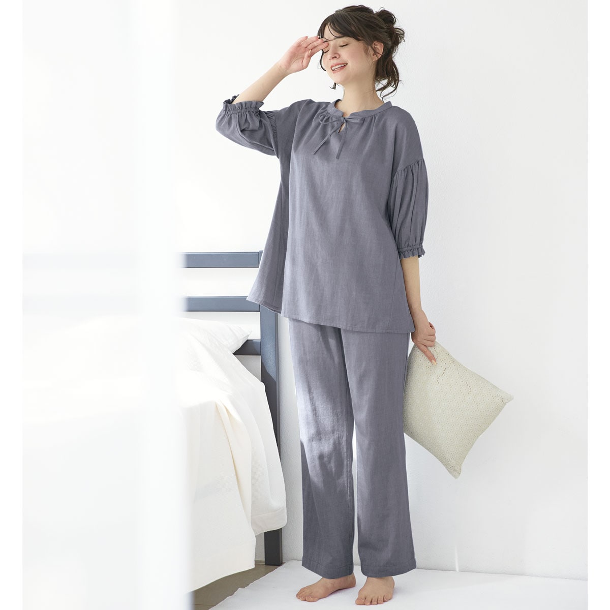 -ポイント-甘さ控えめなデザインでサラッとしなやかな心地よさを。-デザイン-衿元すっきりリボンが大人可愛い。お好みでたらしたり結んだりアレンジもOKウエストゴム2本通しでお腹を締め付けにくくやさしくフィット。ギャザーたっぷりの袖が愛らしく二の腕をカバー。-素材特徴-綿のナチュラルな風合いとやさしい肌あたりにレーヨンのしなやかさをプラス。シルクのようななめらかさで心地い肌触り。自然なドレープ感で上質感もあります。