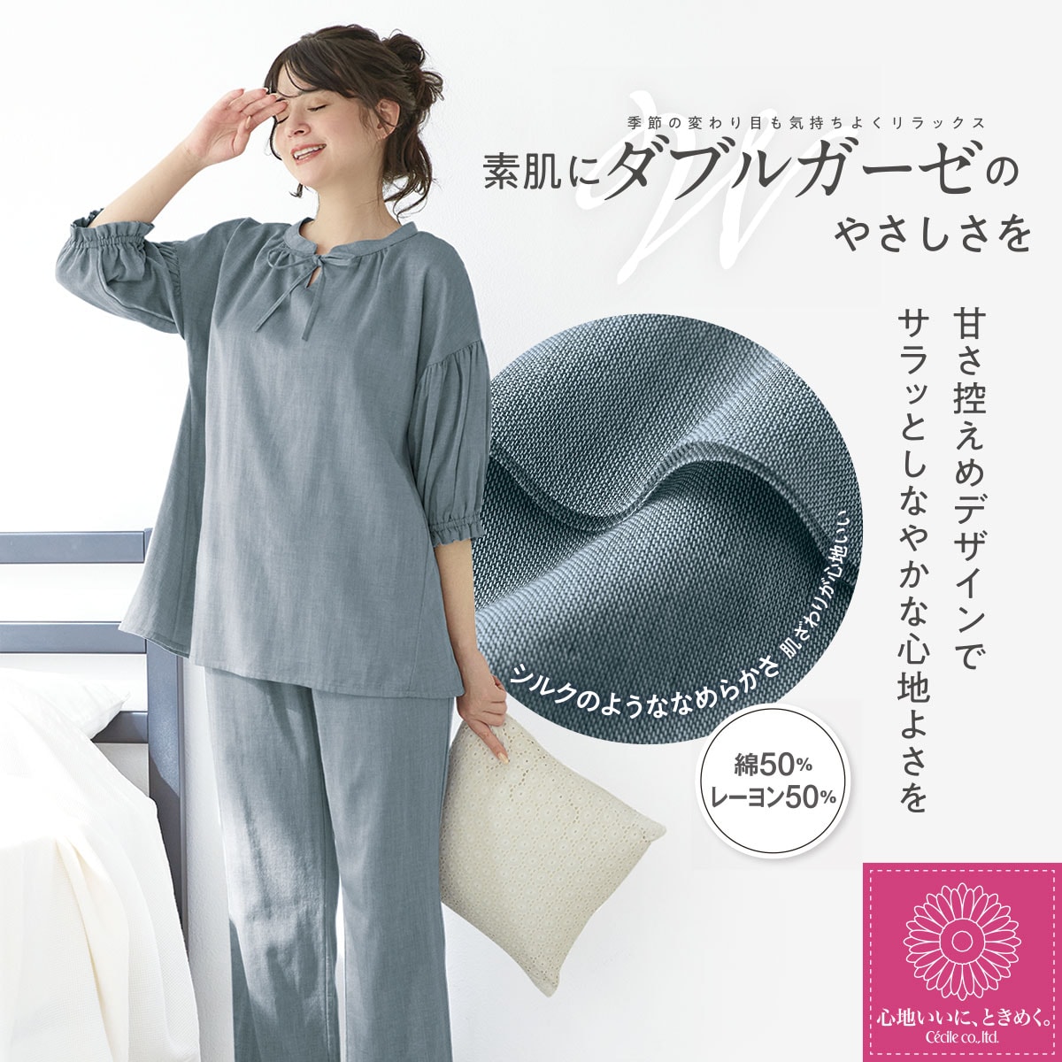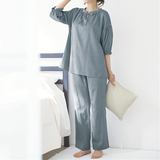 レーヨン混ダブルガーゼの大人かわいいデザインパジャマ。甘さ控えめなデザインでサラッとしなやかな心地よさを。