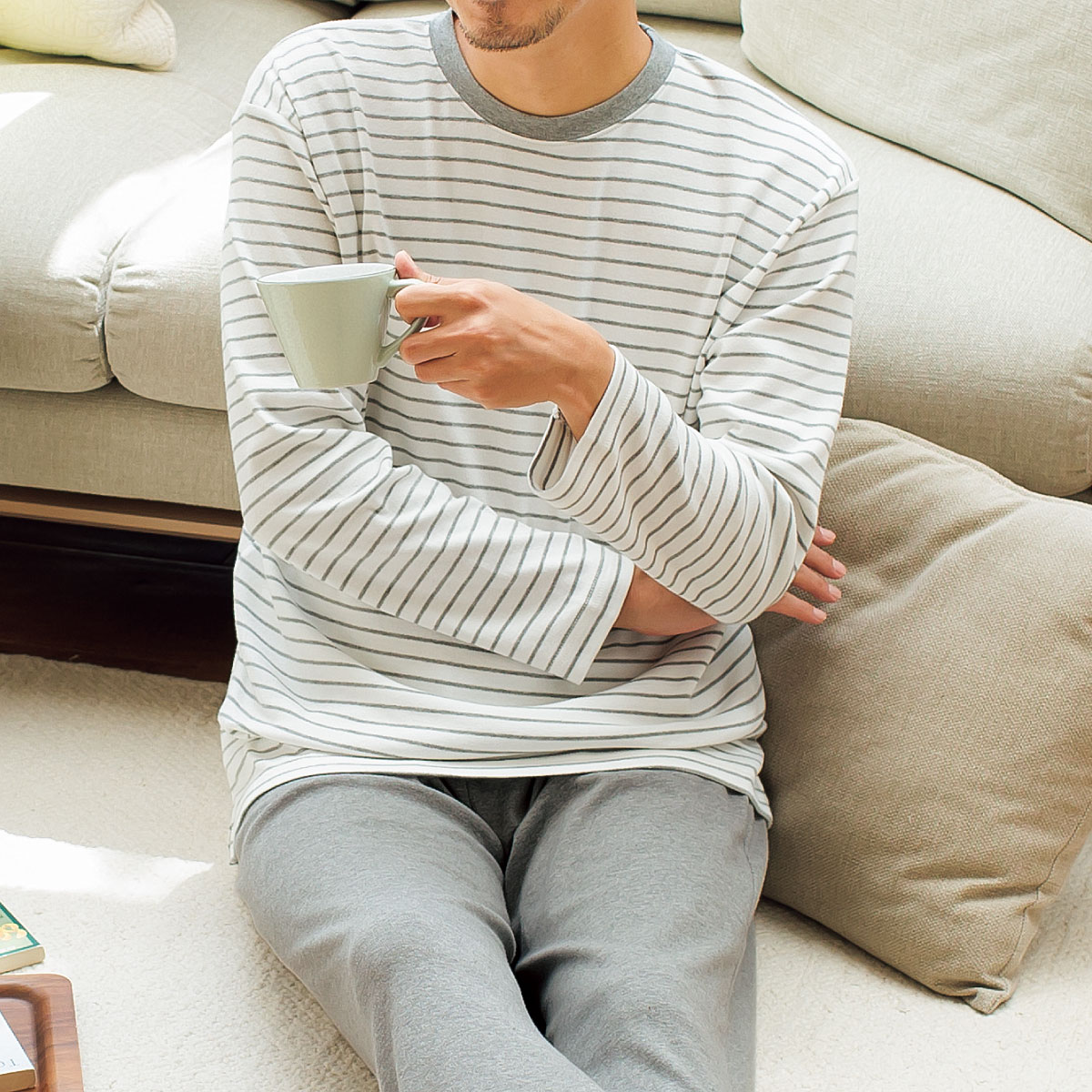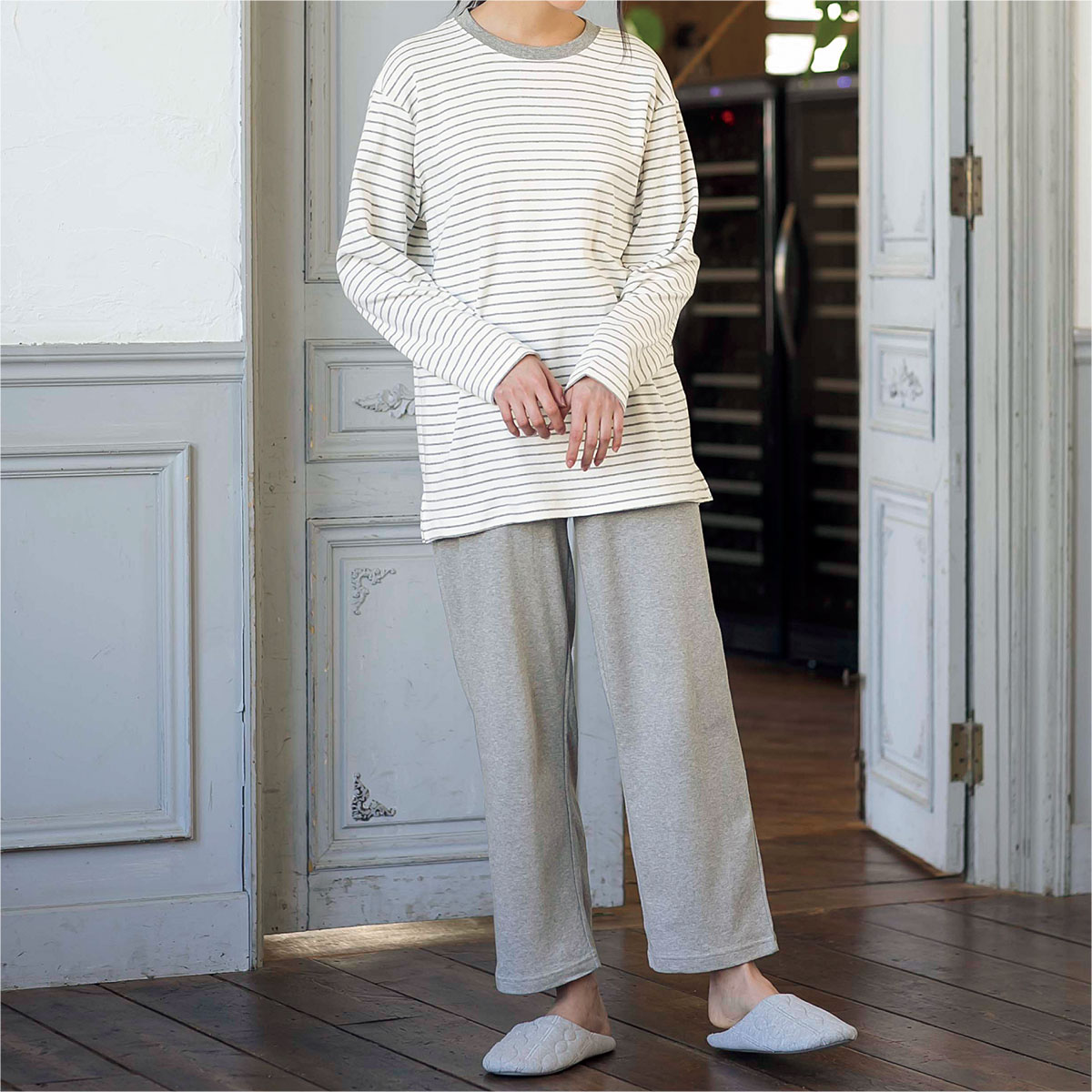 綿100%のスムース素材がソフトな肌あたりで、部屋着にもぴったりなTタイプパジャマです。ミディアムグレー着用例