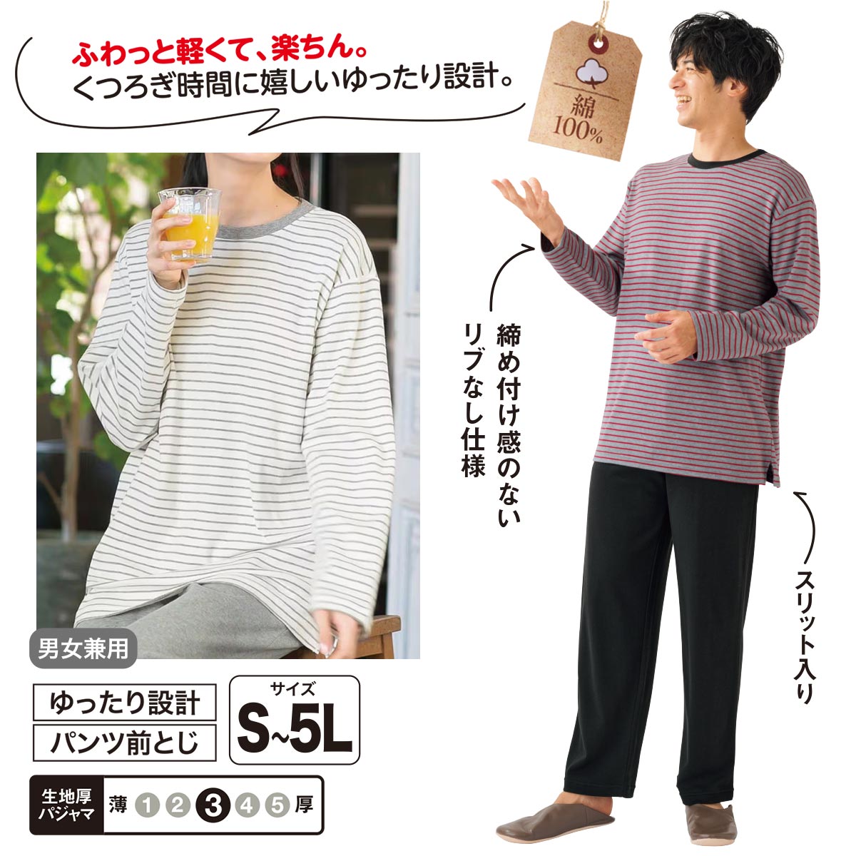 -商品特徴-ボーダー×無地の着やすいデザインが人気の定番Tタイプパジャマ。綿100%のスムース素材がソフトな肌あたりで、部屋着にもぴったり。-豊富なサイズ展開-Sから5Lまでとサイズ豊富に揃っています。メンズだけでなくレディースにもおすすめです。