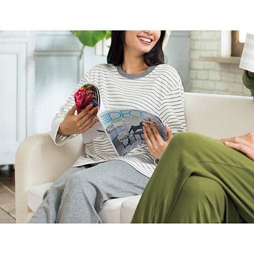 綿100%のスムース素材がソフトな肌あたりで、部屋着にもぴったりなTタイプパジャマです。ミディアムグレー着用例