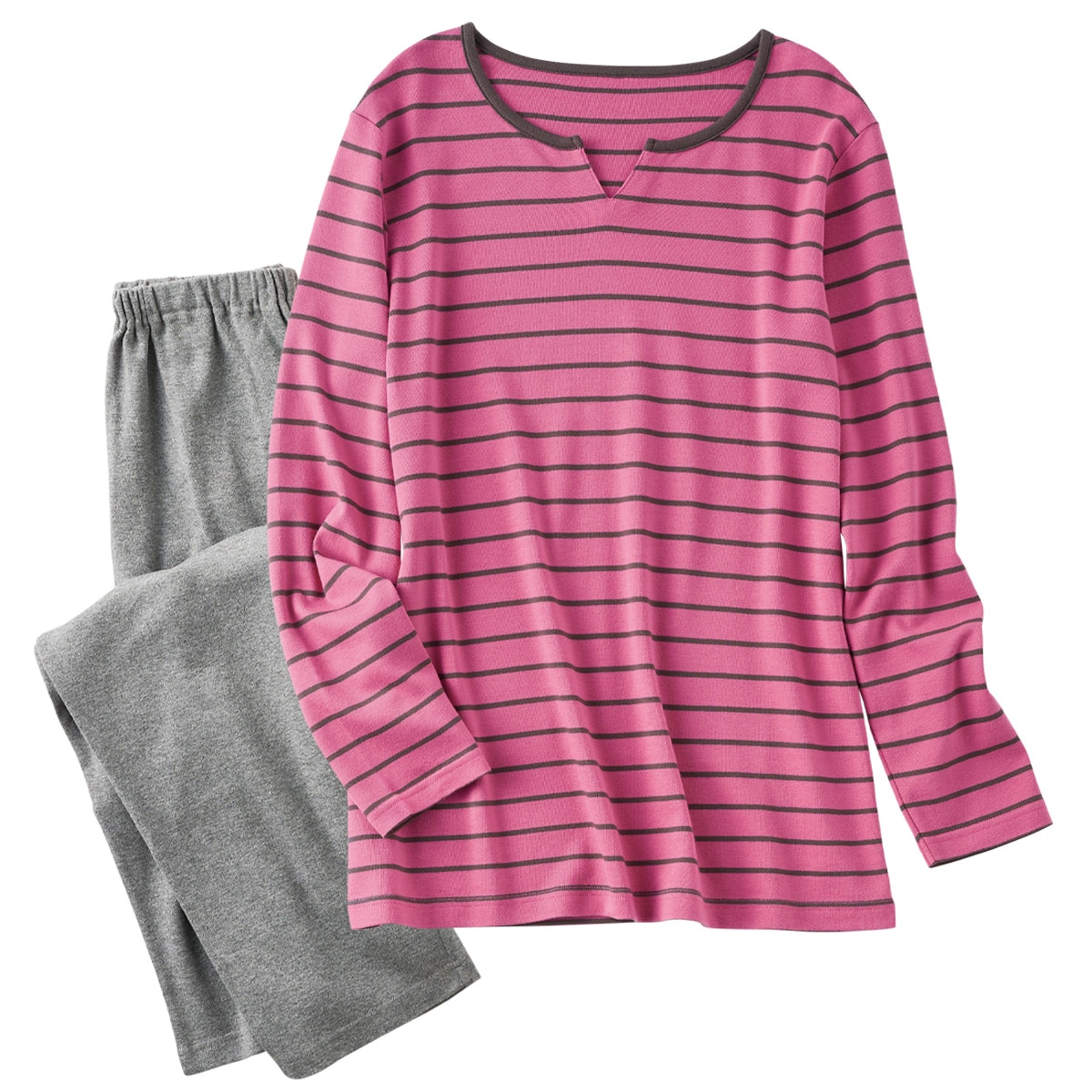 パジャマに、可愛いルームウェアに大活躍の綿100%長袖Tタイプパジャマ。襟ぐりの切れ込みで、カジュアルな中にも女らしい表情に。ほどよい厚みも、デイリー使いにうれしいポイントです。