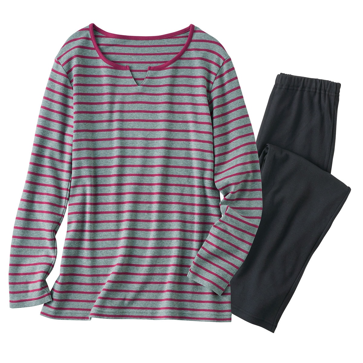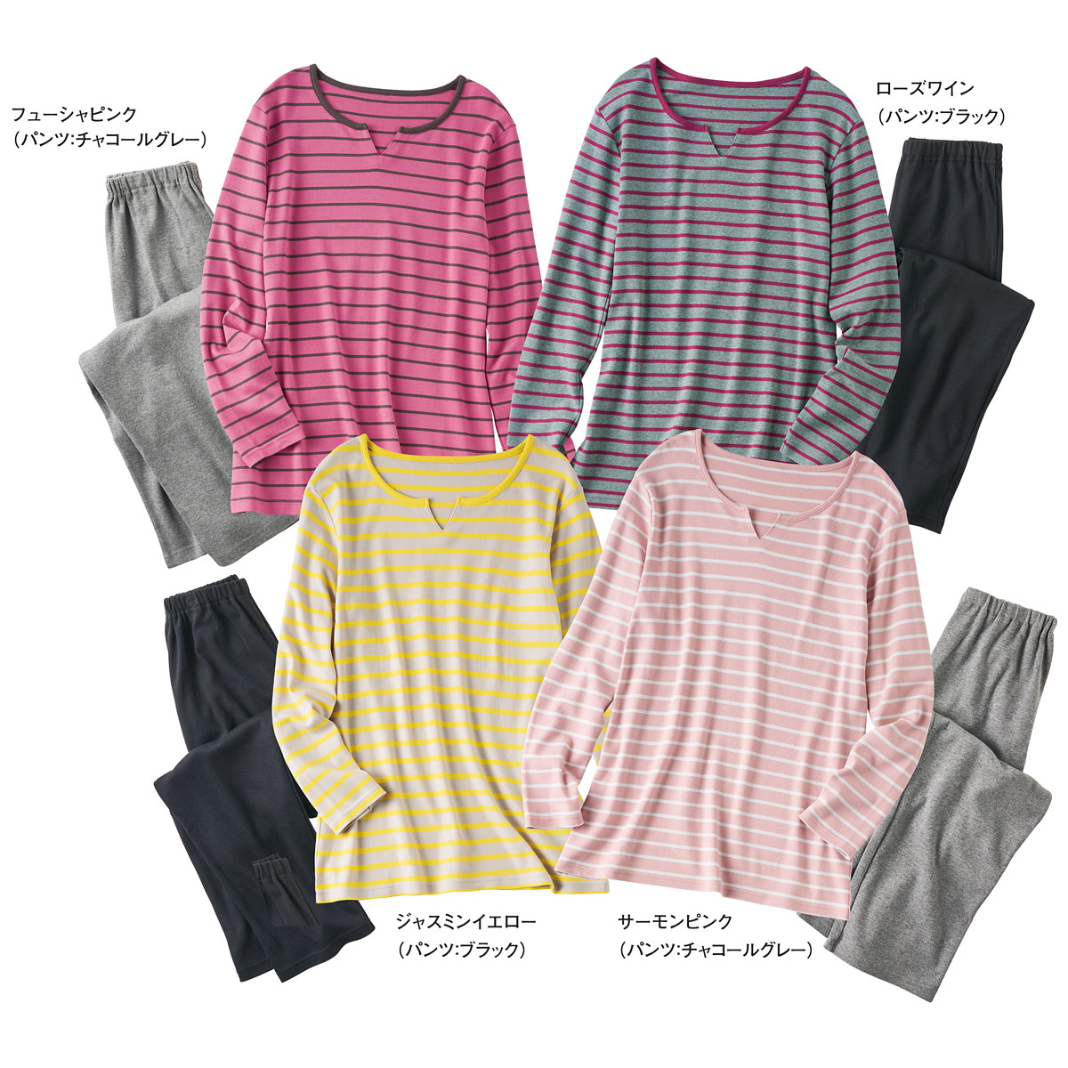 【シリーズ累計販売枚数11.3万枚突破!(2025年8月末現在)】気分に合わせて、お好みのボーダーをチョイスできる長袖Tタイプレディースパジャマです。襟ぐりの切れ込みで、カジュアルな中にも女らしい表情に。なめらかな肌ざわりに肌も喜ぶ綿100%スムース素材。ほどよい厚みも、デイリー使いにうれしいポイントです。パジャマ用に、可愛いルームウェア用に、色違いで揃えても。